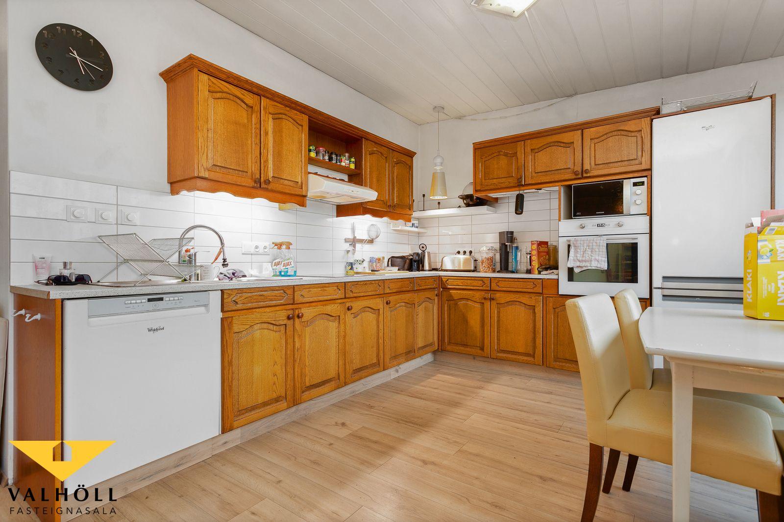 Eldhús: Opið inn í borðstofu, viðar innrétting ágætis skápaplássi, nýlegur ofn og helluborð.