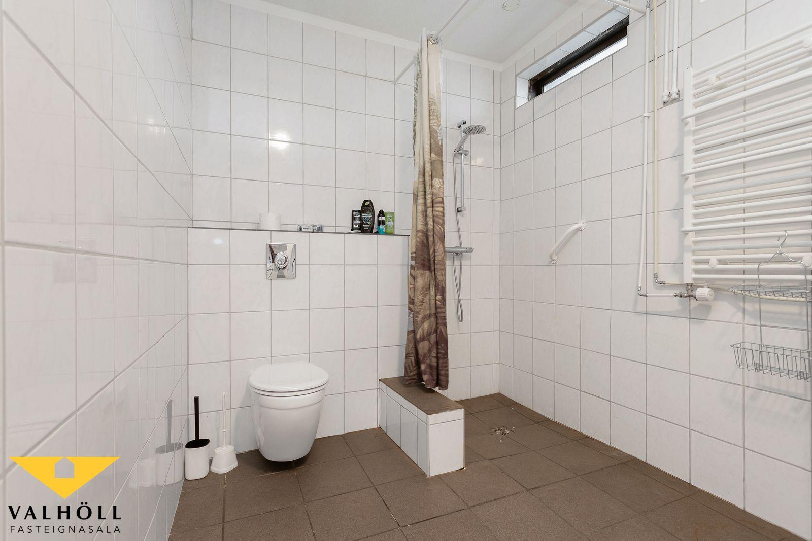 Baðherbergi: Flísar, hvít innrétting, upphengt salerni,sturta og handklæða ofn, hurð út á norðurlóð.
