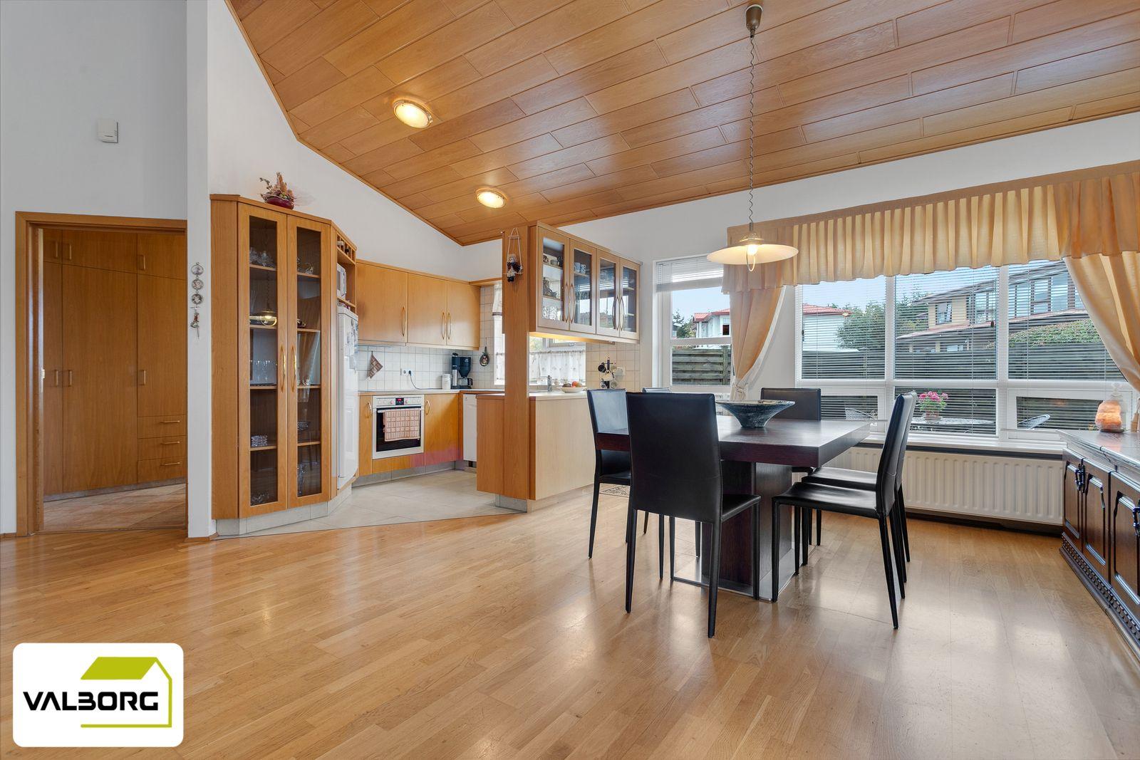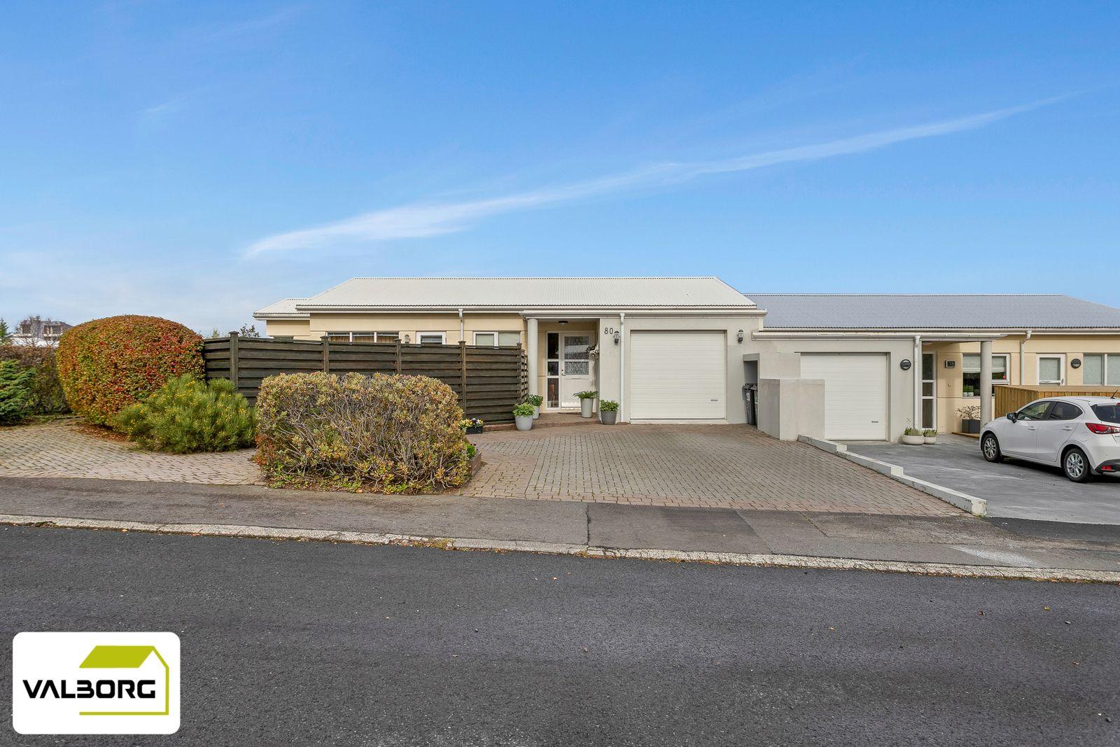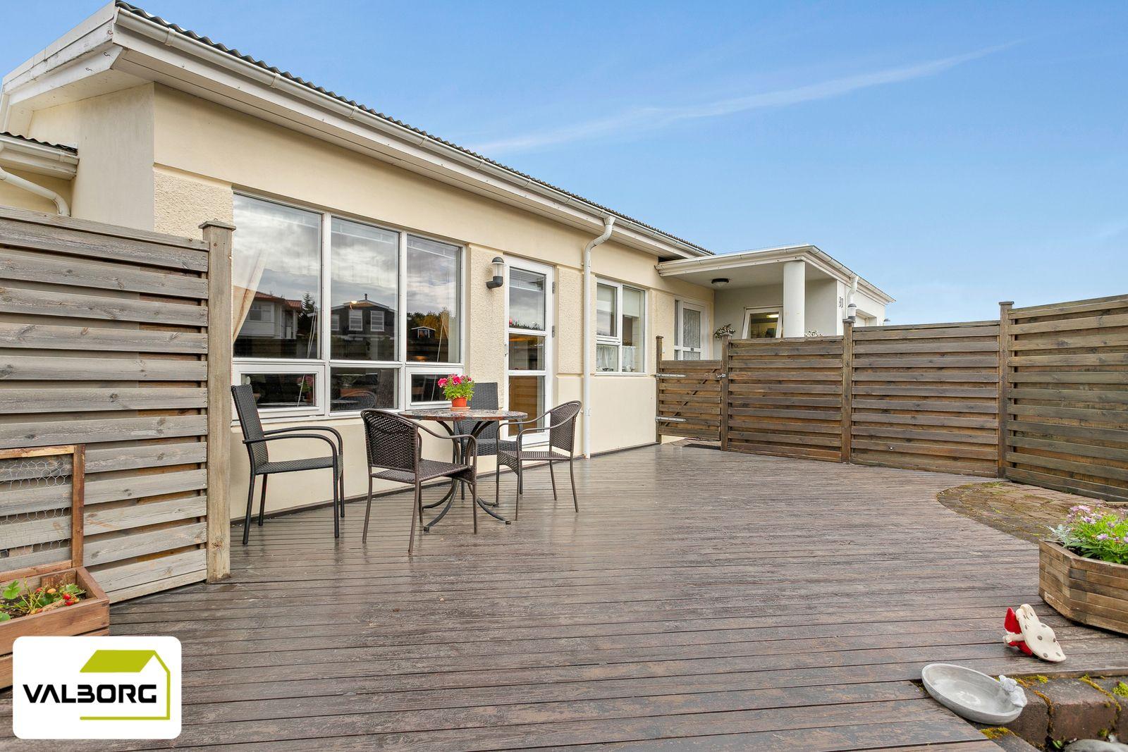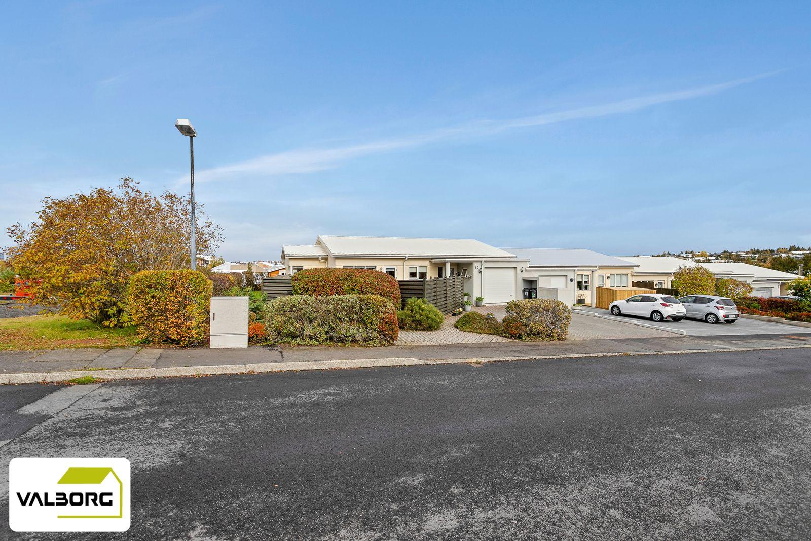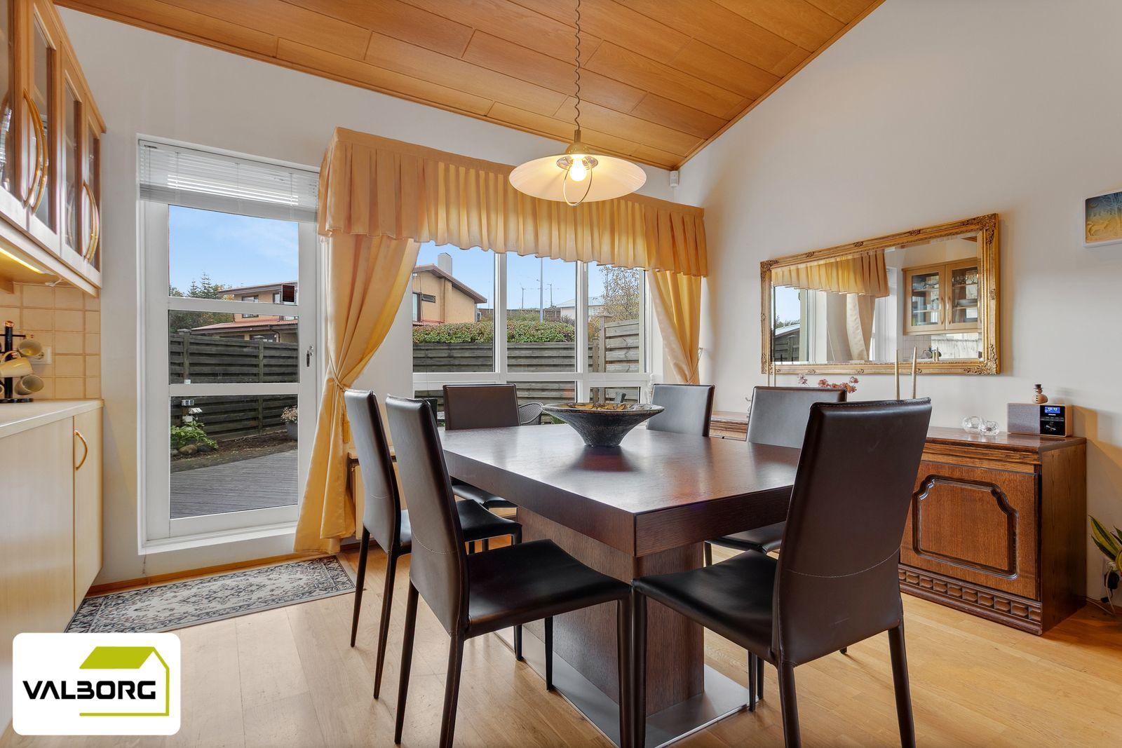 Nánari lýsing: Forstofa: Flísalögð með fataskápum. Innangengt í bílskúr. Hiti í gólfi Stofa/borðstofa: Bjartu og opið rými með hárri lofthæð. Parket á gólfi. Útgengt úr borðstofu út á verönd og garð. Eldhúsið: Ljós innrétting með glerskápum að hluta. Flísar á gólfi. Svefnherbergi I: Rúmgott herbergi með góðum skápum. Parket á gólfi. Svefnherbergi II: Rúmgott herbergi. Skápur og parket á gólfi. Baðherbergi: Ljósar flísar og góðar innréttingar. Sturta með glerhurð og handklæðaofn. Hiti í gólfi. Þvottahús: Með útgengi út í garð. Hillur og flísar á gólfi. Geymsla: Inn af bílskúr með hillum. Geymsluloft: geymsluloft fyrir ofan bílskúr. Bílskúr: 26,7 fm. Nýleg rafknúin bílskúrshurð. Geymsluskúr: Geymsluskúr er í bakgarði