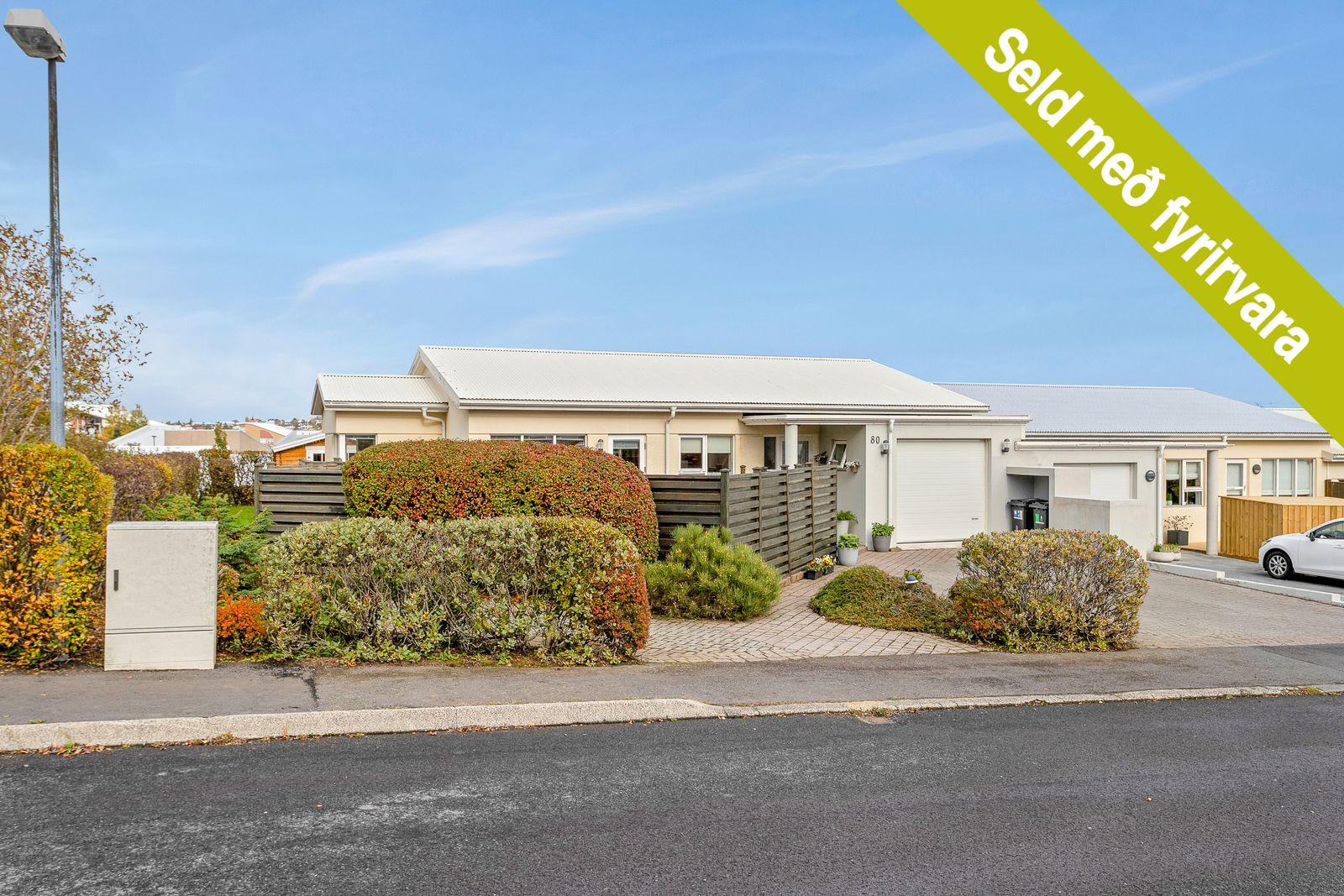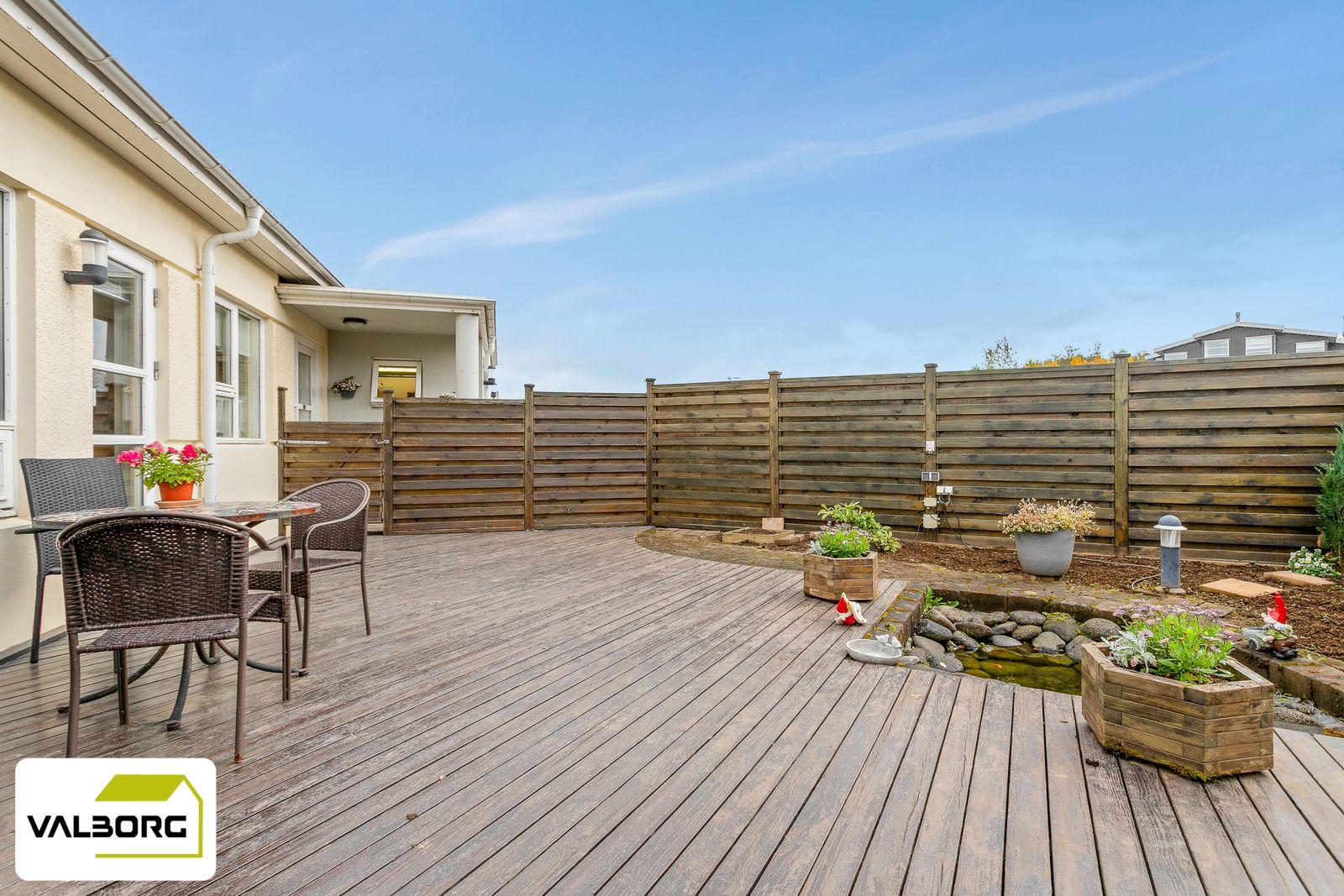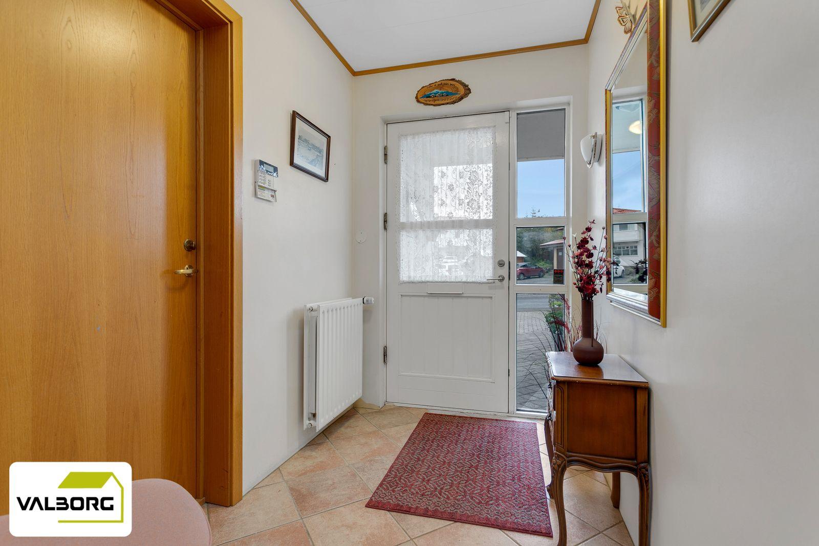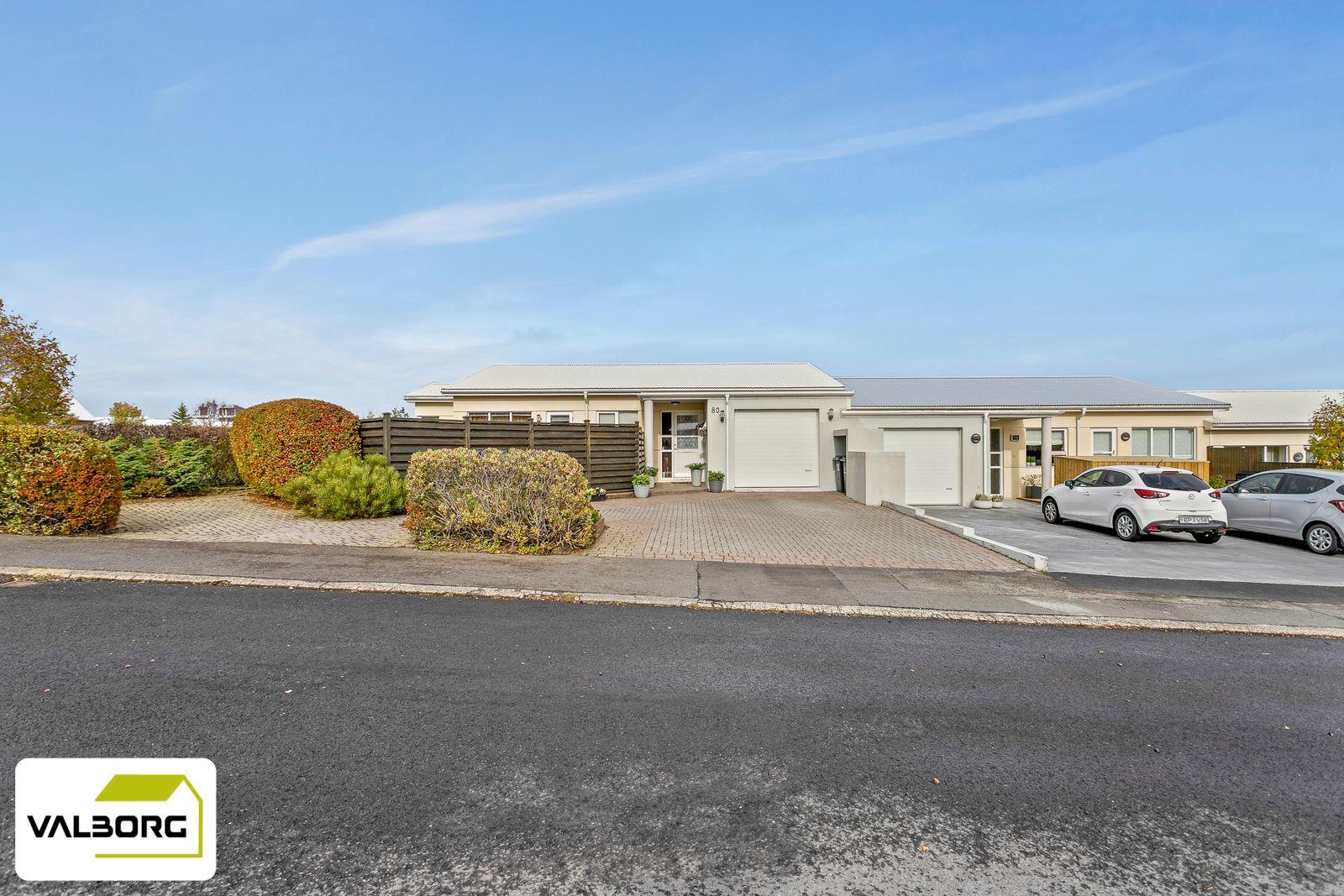 Nánari lýsing: Forstofa: Flísalögð með fataskápum. Innangengt í bílskúr. Hiti í gólfi Stofa/borðstofa: Bjartu og opið rými með hárri lofthæð. Parket á gólfi. Útgengt úr borðstofu út á verönd og garð. Eldhúsið: Ljós innrétting með glerskápum að hluta. Flísar á gólfi. Svefnherbergi I: Rúmgott herbergi með góðum skápum. Parket á gólfi. Svefnherbergi II: Rúmgott herbergi. Skápur og parket á gólfi. Baðherbergi: Ljósar flísar og góðar innréttingar. Sturta með glerhurð og handklæðaofn. Hiti í gólfi. Þvottahús: Með útgengi út í garð. Hillur og flísar á gólfi. Geymsla: Inn af bílskúr með hillum. Geymsluloft: geymsluloft fyrir ofan bílskúr. Bílskúr: 26,7 fm. Nýleg rafknúin bílskúrshurð. Geymsluskúr: Geymsluskúr er í bakgarði