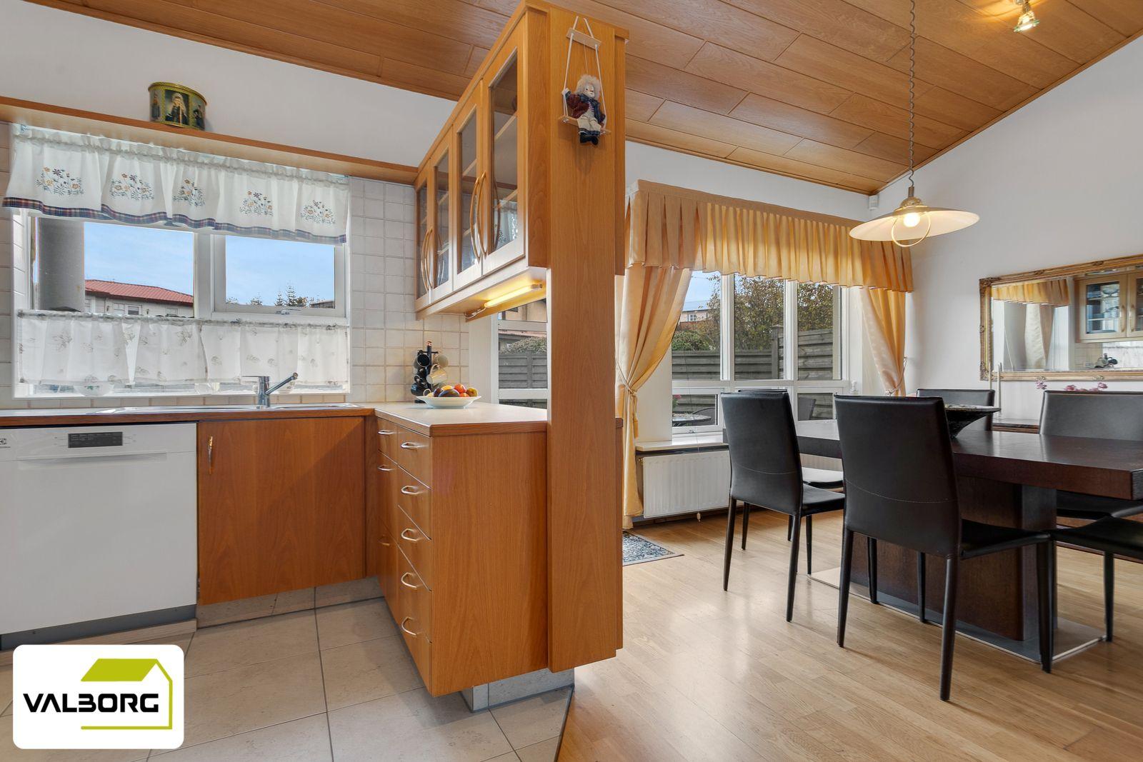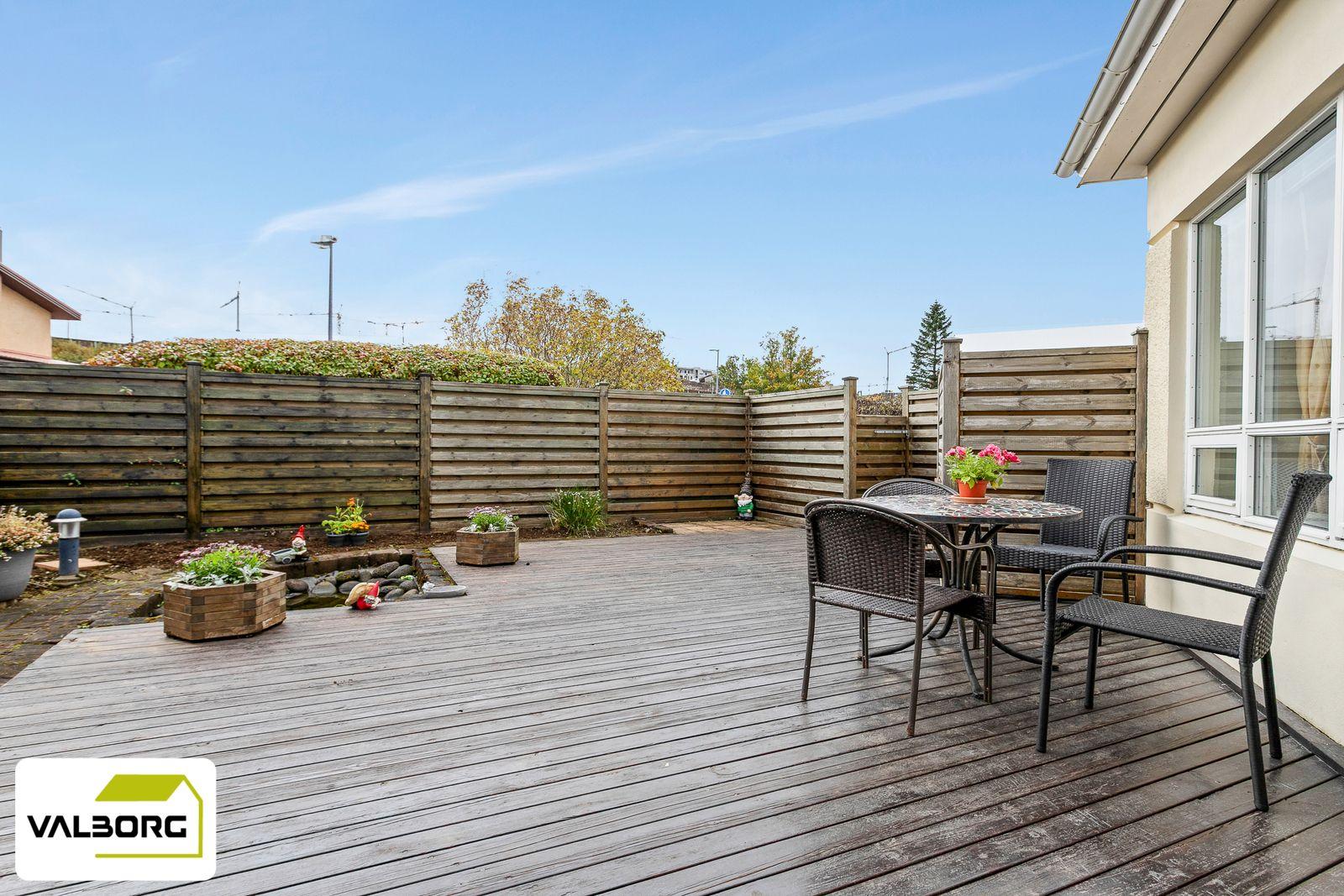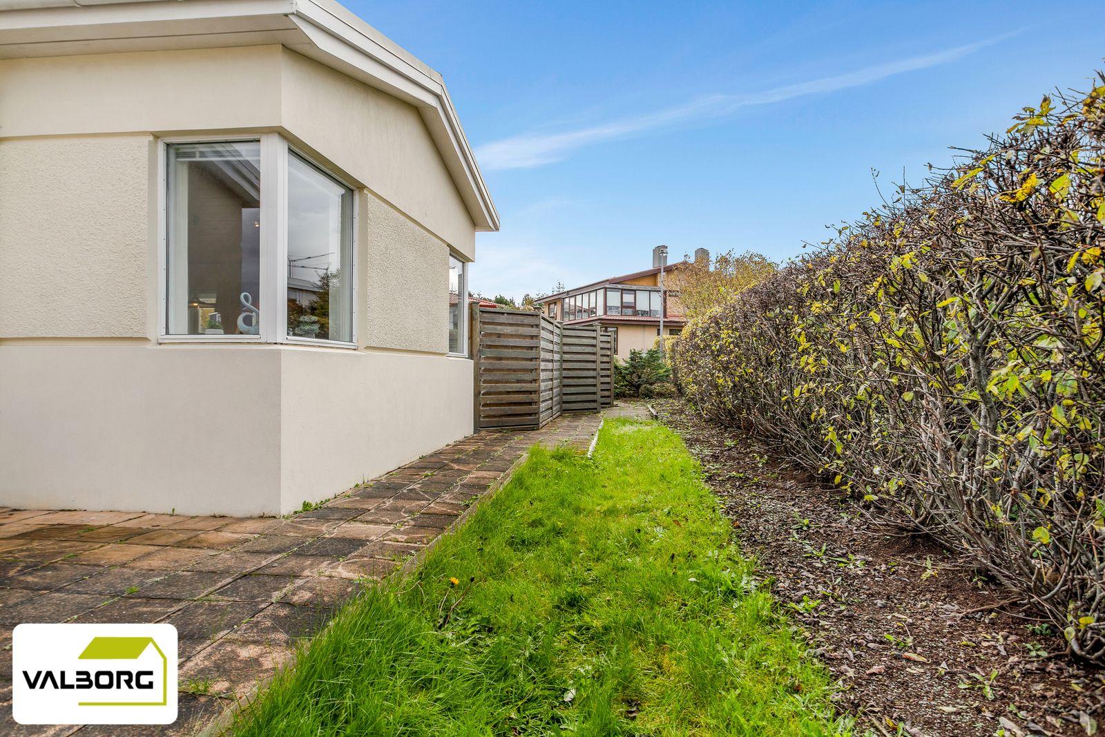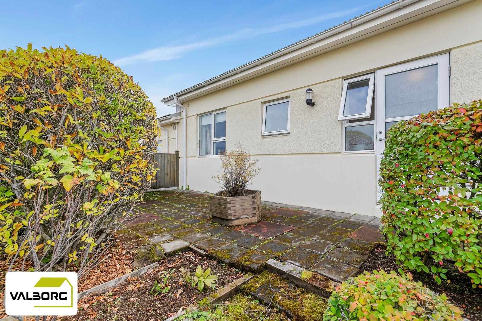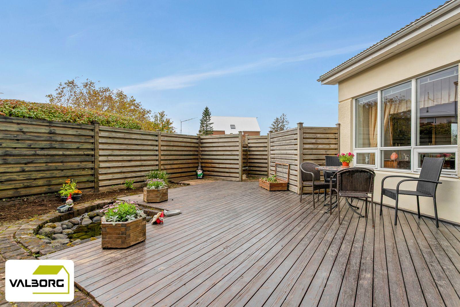 Nánari lýsing: Forstofa: Flísalögð með fataskápum. Innangengt í bílskúr. Hiti í gólfi Stofa/borðstofa: Bjartu og opið rými með hárri lofthæð. Parket á gólfi. Útgengt úr borðstofu út á verönd og garð. Eldhúsið: Ljós innrétting með glerskápum að hluta. Flísar á gólfi. Svefnherbergi I: Rúmgott herbergi með góðum skápum. Parket á gólfi. Svefnherbergi II: Rúmgott herbergi. Skápur og parket á gólfi. Baðherbergi: Ljósar flísar og góðar innréttingar. Sturta með glerhurð og handklæðaofn. Hiti í gólfi. Þvottahús: Með útgengi út í garð. Hillur og flísar á gólfi. Geymsla: Inn af bílskúr með hillum. Geymsluloft: geymsluloft fyrir ofan bílskúr. Bílskúr: 26,7 fm. Nýleg rafknúin bílskúrshurð. Geymsluskúr: Geymsluskúr er í bakgarði