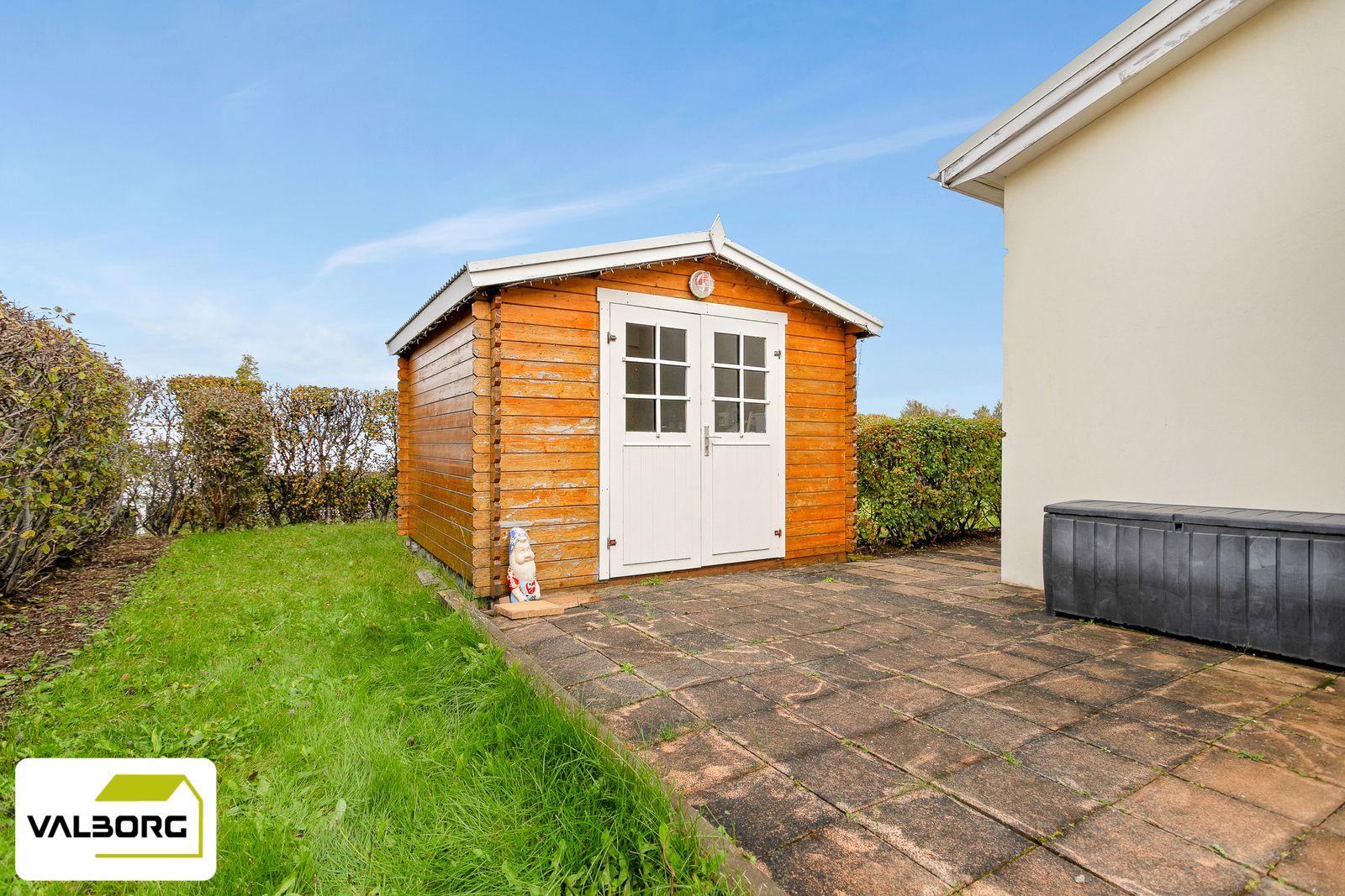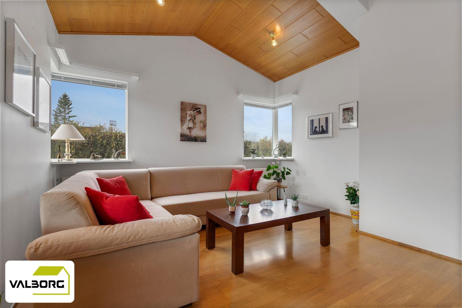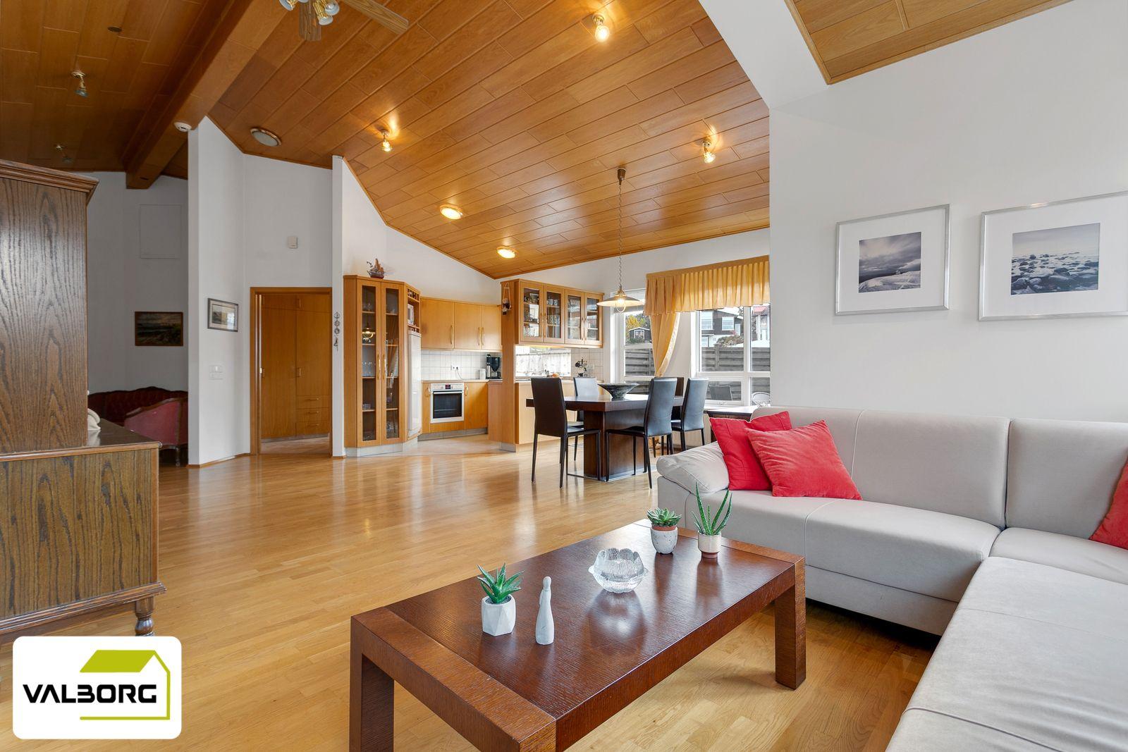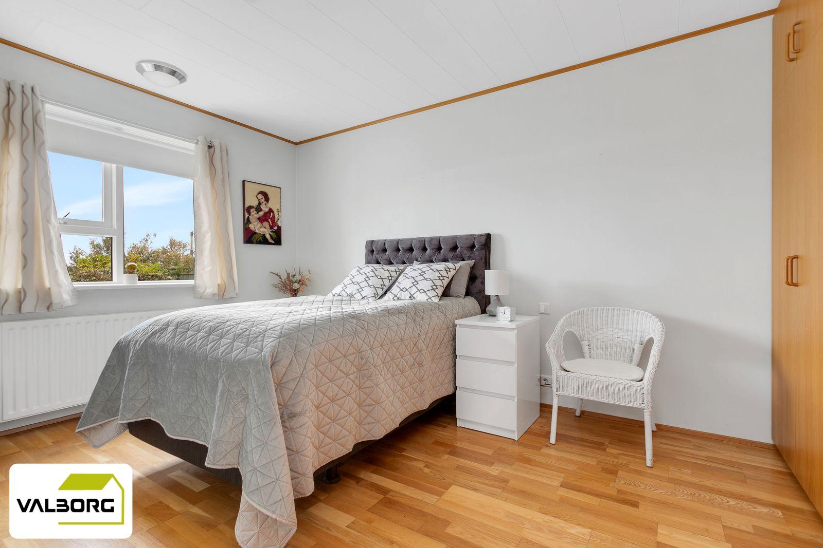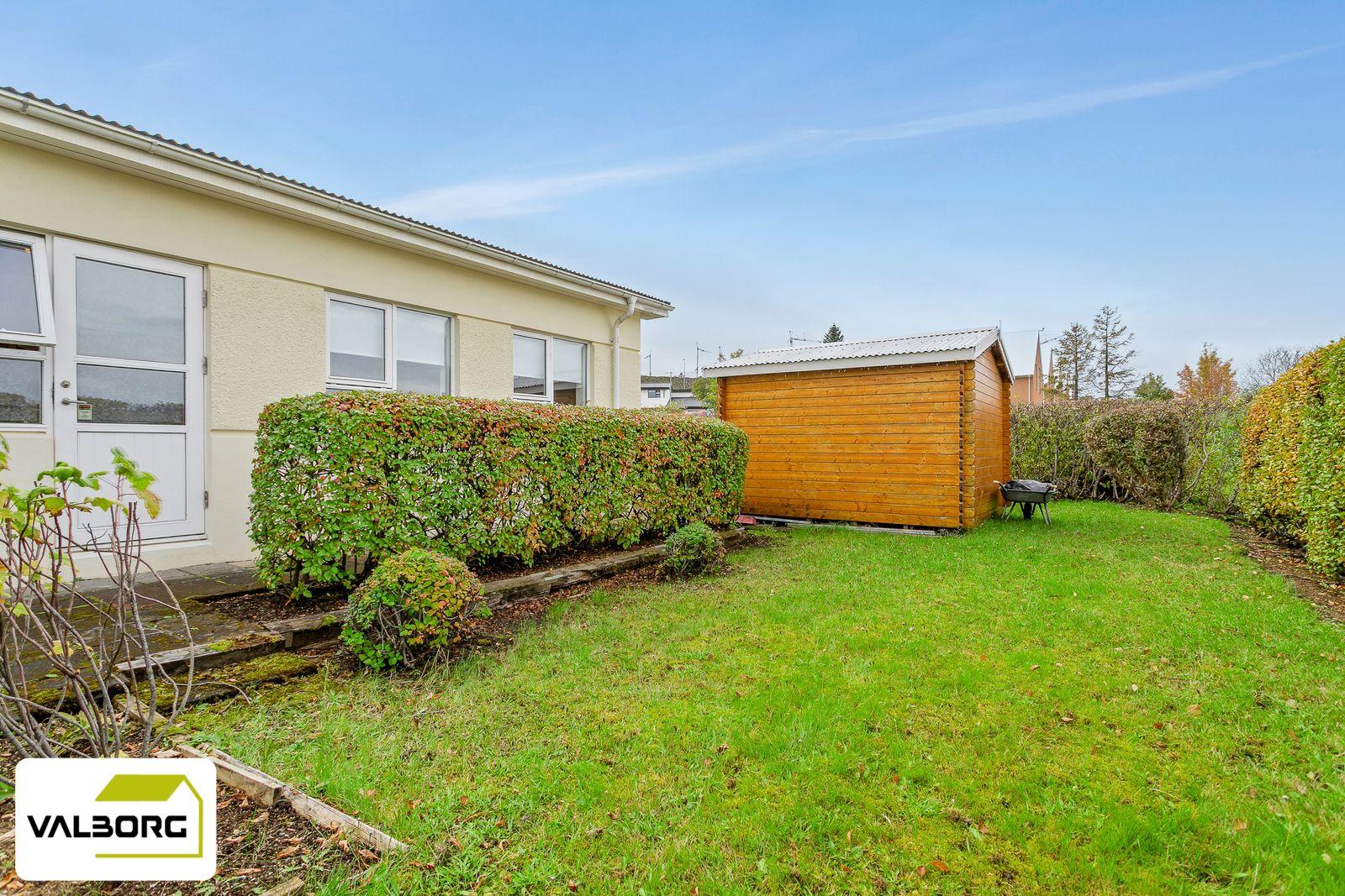 Nánari lýsing: Forstofa: Flísalögð með fataskápum. Innangengt í bílskúr. Hiti í gólfi Stofa/borðstofa: Bjartu og opið rými með hárri lofthæð. Parket á gólfi. Útgengt úr borðstofu út á verönd og garð. Eldhúsið: Ljós innrétting með glerskápum að hluta. Flísar á gólfi. Svefnherbergi I: Rúmgott herbergi með góðum skápum. Parket á gólfi. Svefnherbergi II: Rúmgott herbergi. Skápur og parket á gólfi. Baðherbergi: Ljósar flísar og góðar innréttingar. Sturta með glerhurð og handklæðaofn. Hiti í gólfi. Þvottahús: Með útgengi út í garð. Hillur og flísar á gólfi. Geymsla: Inn af bílskúr með hillum. Geymsluloft: geymsluloft fyrir ofan bílskúr. Bílskúr: 26,7 fm. Nýleg rafknúin bílskúrshurð. Geymsluskúr: Geymsluskúr er í bakgarði