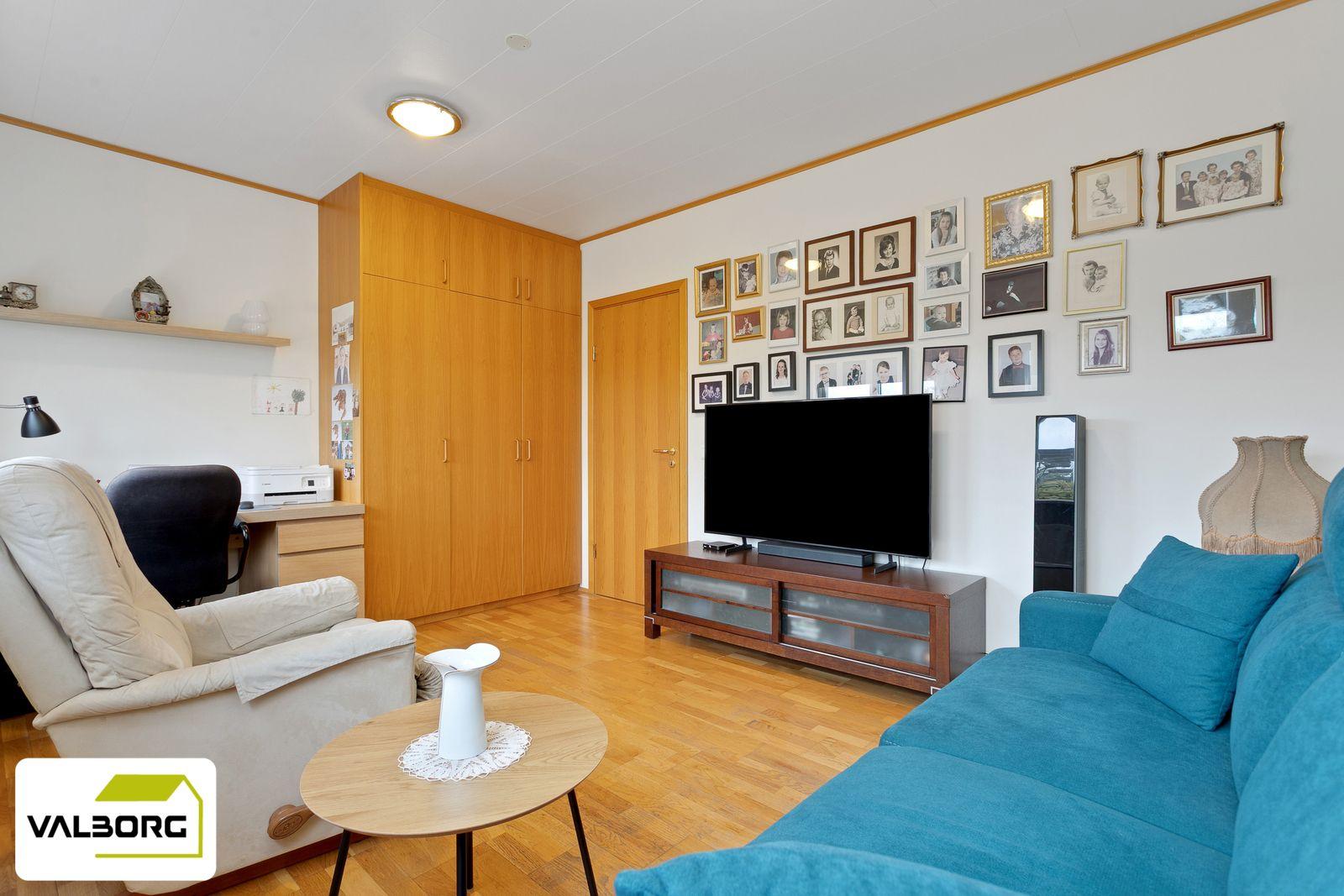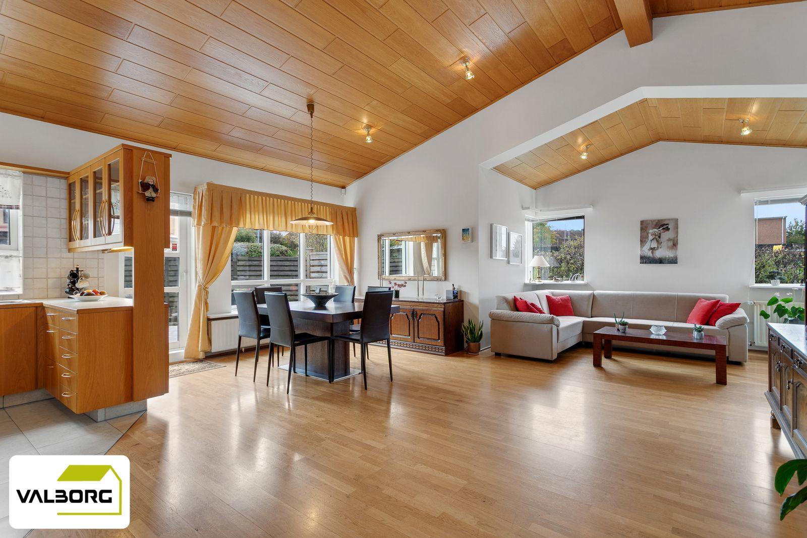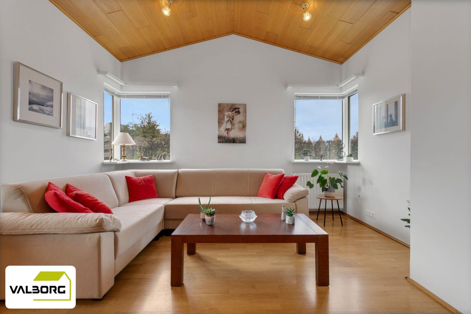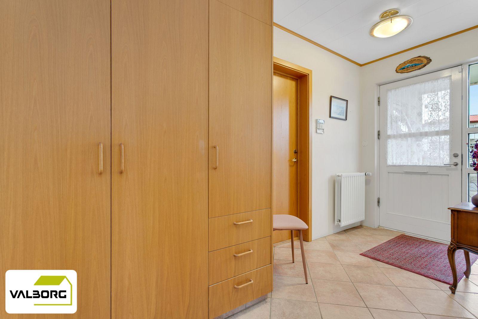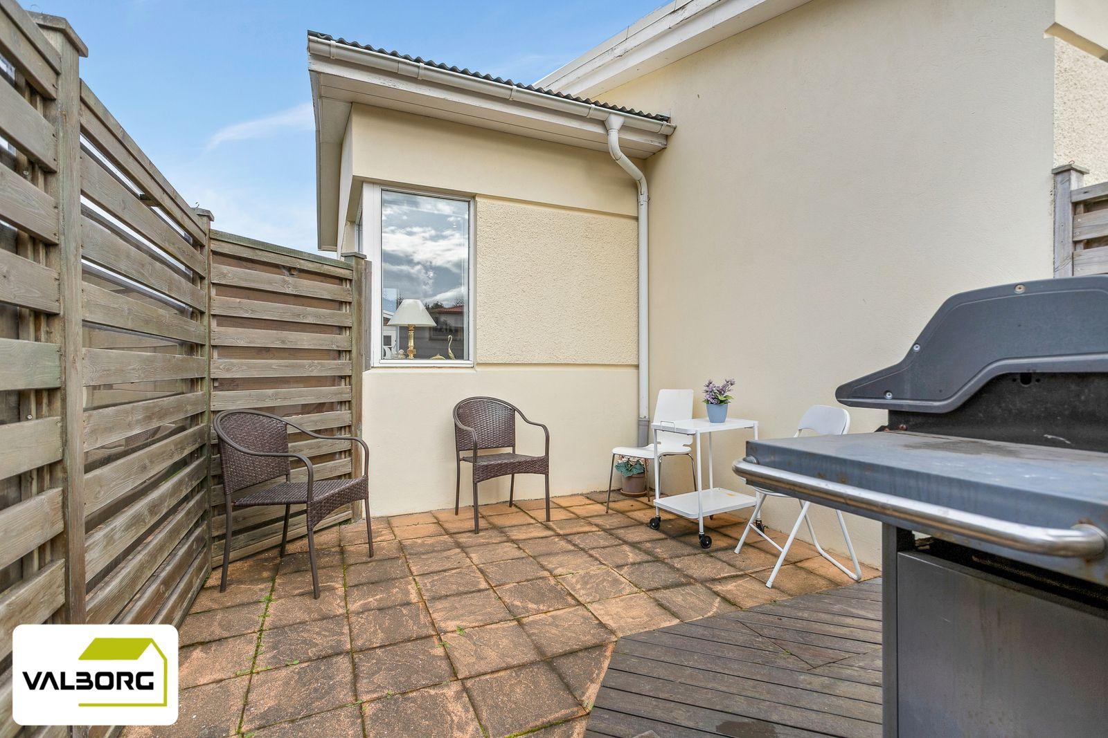 Nánari lýsing: Forstofa: Flísalögð með fataskápum. Innangengt í bílskúr. Hiti í gólfi Stofa/borðstofa: Bjartu og opið rými með hárri lofthæð. Parket á gólfi. Útgengt úr borðstofu út á verönd og garð. Eldhúsið: Ljós innrétting með glerskápum að hluta. Flísar á gólfi. Svefnherbergi I: Rúmgott herbergi með góðum skápum. Parket á gólfi. Svefnherbergi II: Rúmgott herbergi. Skápur og parket á gólfi. Baðherbergi: Ljósar flísar og góðar innréttingar. Sturta með glerhurð og handklæðaofn. Hiti í gólfi. Þvottahús: Með útgengi út í garð. Hillur og flísar á gólfi. Geymsla: Inn af bílskúr með hillum. Geymsluloft: geymsluloft fyrir ofan bílskúr. Bílskúr: 26,7 fm. Nýleg rafknúin bílskúrshurð. Geymsluskúr: Geymsluskúr er í bakgarði