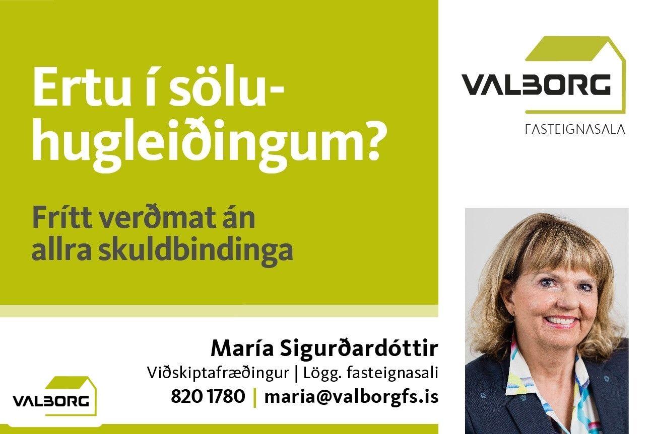 Nánari upplýsingar veitir: Maria Sigurðardóttir viðsk.fræðingur og löggiltur fasteignasali, í síma 820 1780, tölvupóstur maria@valborgfs.is Forsendur söluyfirlits: Söluyfirlit er samið af fasteignasala í samræmi við ákvæði laga nr. 70/2015. Þær upplýsingar sem fram koma í söluyfirliti þessu eru sóttar í opinberar skrár, til seljanda sjálfs og eftir atvikum til húsfélags. Seljandi veitir upplýsingar um eign í samræmi við upplýsingaskyldu laga um fasteignakaup nr. 40/2002. Fasteignasali sannreynir að þær upplýsingar séu réttar með sjónskoðun á eigninni. Fasteignasali getur ekki fullyrt um ástand og eiginleika þeirra hluta fasteigna sem ekki eru aðgengilegir og sjást ekki berum augum, t.d. lagnir, dren, skólp og þak.