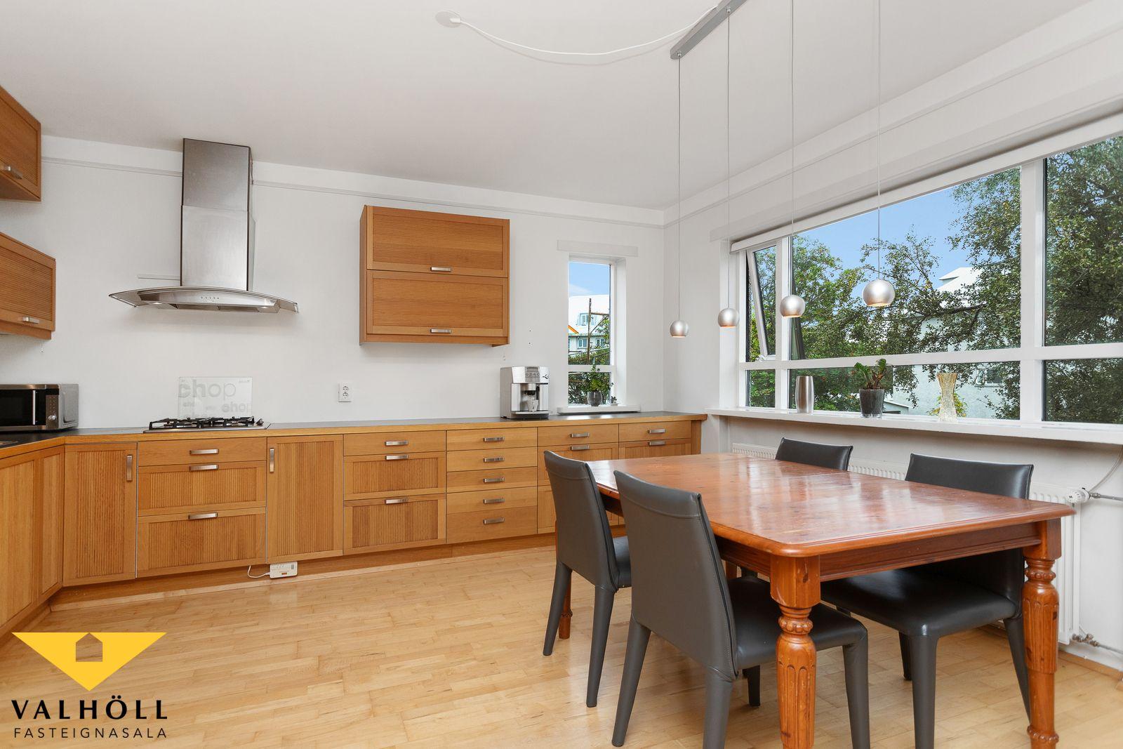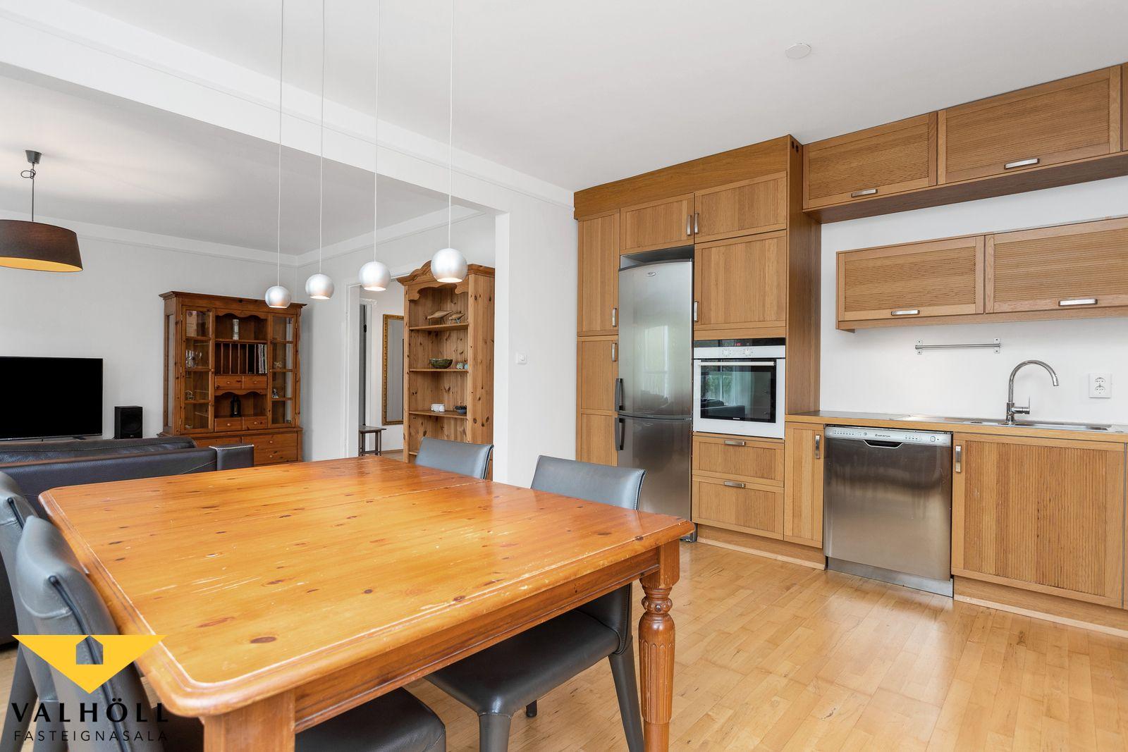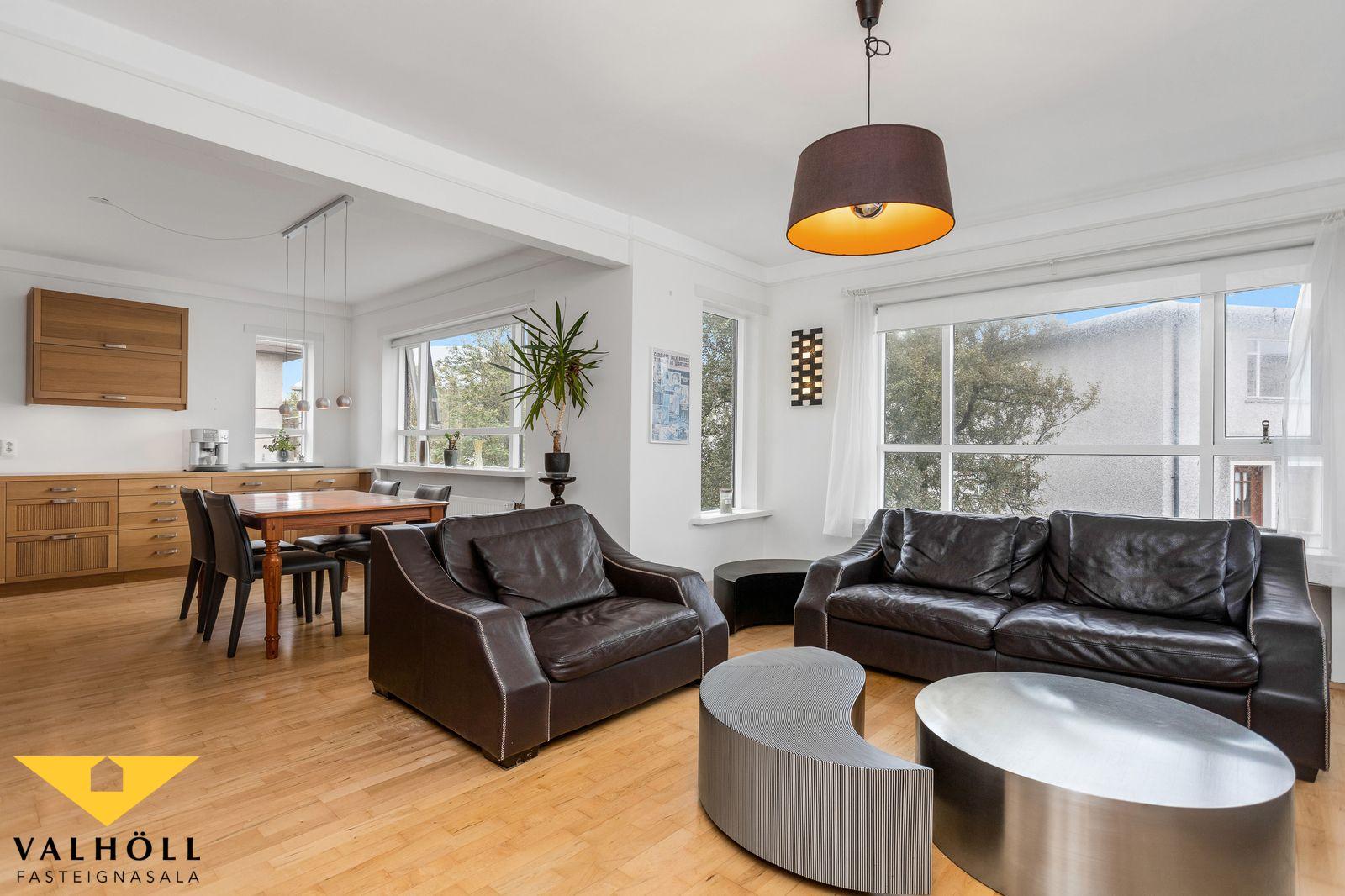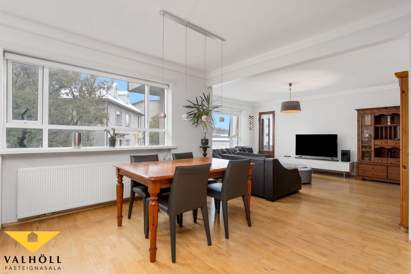 **SÝND Í EINKASKOÐUNUM **Valhöll kynnir: Rúmgóða vel skipulagða 4ra-5 herbergja efri hæð með bílskúr á góðum stað við Blönduhlíð 4. Eignin samanstengur af stóru alrými með svölum til suðurs þar sem eldhús, borðstofa og stofa eru í opnu alrými, hol er rúmgott, baðherbergi er með glugga og þvottaaðstöðu og þrjú mjög rúmgóð svefnherbergi. Það voru 4 svegnherbergi en opnað hefur verið á milli tveggja. Hurð enn til staðar fyrir þá sem þurfa 4 svefnherbergi, en sú hurð er með aðgengi af stigapalli í sameign. Bilskúr með gönguhurð og stórum gluggum. Hæðin er skráð hjá HMS 123,6 fm og bílskúr 38,9 fm samtals 162,5 fm Fyrirhugað fasteignamat fyrir 2026 er 109.450.000 kr. BÓKIÐ SKOÐUN: Elín Alfreðsdóttir lgf í síma 8993090 eða elina@valholl.is Nánari lýsing á eigninni: Komið er inn um sameiginlegan inngang með efri hæð og risi. Snyrtilegur stigagangur og sameiginlegar svalir af stigapalli. Forstofa/hol: Parket á gólfi og úr holi er gengið inn í aðrar vistarverur íbúðarinnar. Eldhús: Snyrtileg viðar eldhúsinnrétting með góðu skápaplássi. Parket á gólfi. Borðstofa: Rúmgóð með parketi á gólfi. Stofa: Björt og rúmgóð stofa með suðurgluggum og útgengi út á suðursvalir. Hjónaherbergi: Rúmgott herbergi með parketi á gólfi og upprunalegum sérsmíðuðum fataskáp. Barnaherbergi I og II: Bæði herbergi eru rúmgóð með parketi á gólfi. Annað er notað sem hjónaherbergi í dag en hitt er upphaflega 2 herbergi sem opnað hefur verið á milli. Baðherbergi: Flísalagt í hólf og gólf, með sturtuaðstöðu í baðkari og hvítri innréttingu. Þvottaaðstaða og góður gluggi á baði. Sameign: Þvottahús er í sameign í kjallara. Íbúðinni fylgir hlutdeild í sameiginlegri hjóla- og vagnageymslu. Endurbætur á húsi: - 2024 Þakrennur endurnýjaðar og þak yfirfarið að hluta. Þak einangrað til að halda betur hita. - Gangur í sameign málaður og teppalagður árið 2020. -Húsið endursteinað fyrir 15-20 árum og fyrri eigandi vill meina að það sé búið að fara í frárennsli/skólp og dren. (fasteignasali mælir með ástandssoðun á lögnum til að fá þetta staðfest) -Árið 2019: Skipt um gler og lista í flestum gluggum sumar 2025 voru gluggar málaðir að utan. Um er að ræða frábærlega staðsetta eign á vinsælum stað með stuttu göngufæri í alla helstu þjónustu, skóla, leikskóla og útivistarsvæði. Einstakt tækifæri fyrir þá sem vilja bjarta og rúmgóða eign með stórum svegnherbergjum og opnu alrými í fjölskylduvænu hverfi. Eign sem er þess virði að skoða. Upplýsingar veitir Elín Alfreðsdóttir löggiltur fasteignasali í síma 8993090 eða elina@valholl.is