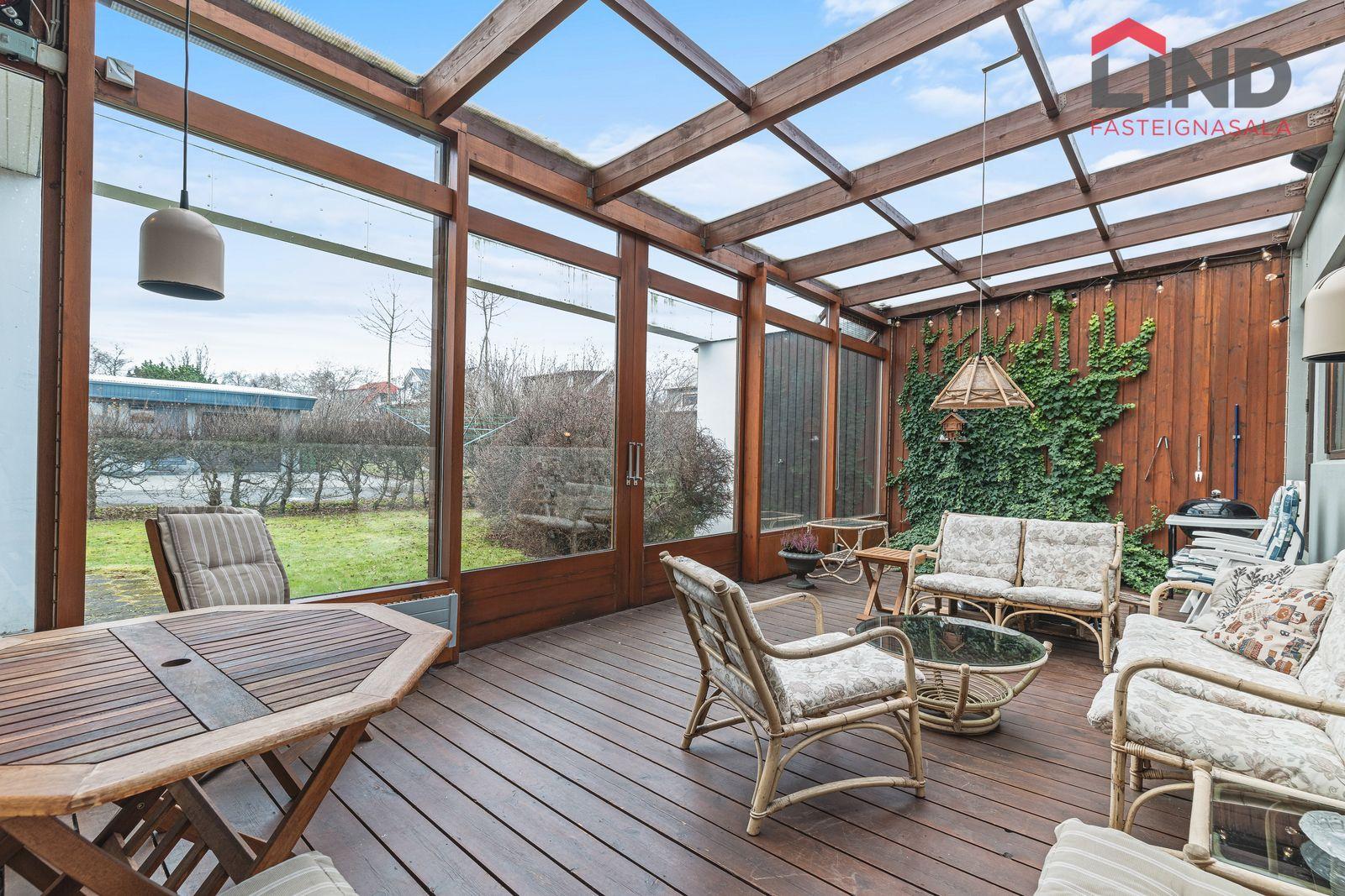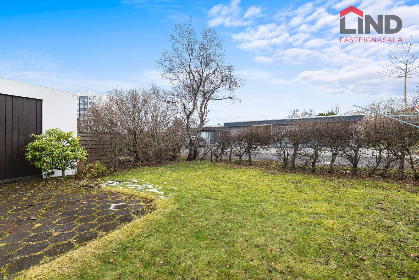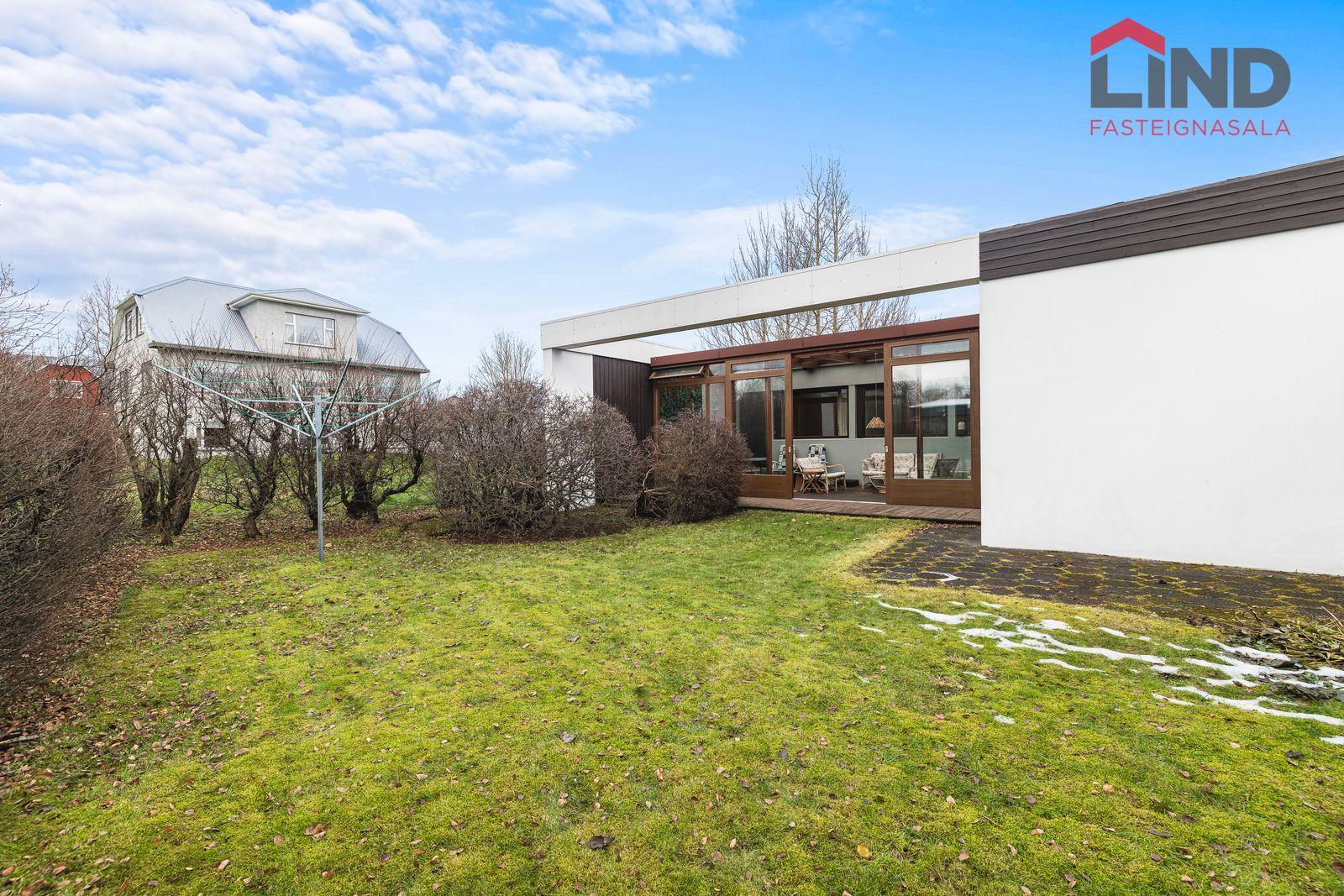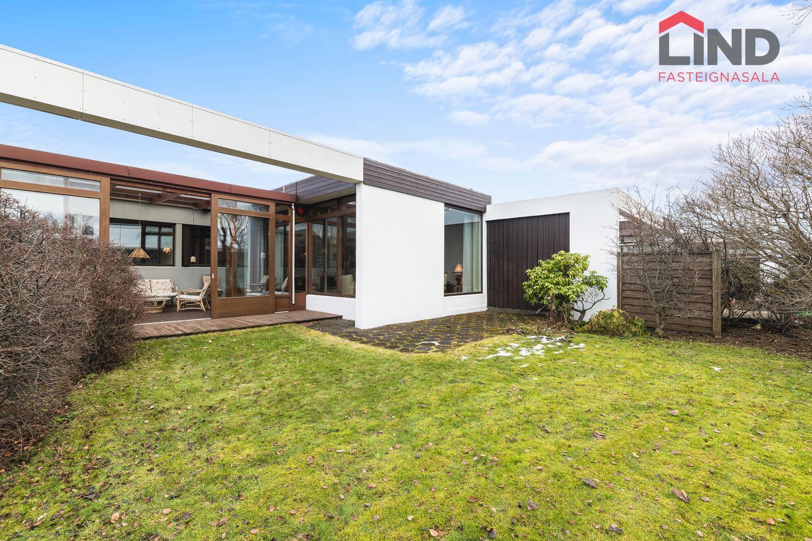 Frábærlega skipulagt raðhús á einni hæð með fjórum svefnherbergjum! Afar skjólgóður bakgarður, stór sólstofa (um 30 fm.) og bílskúr.