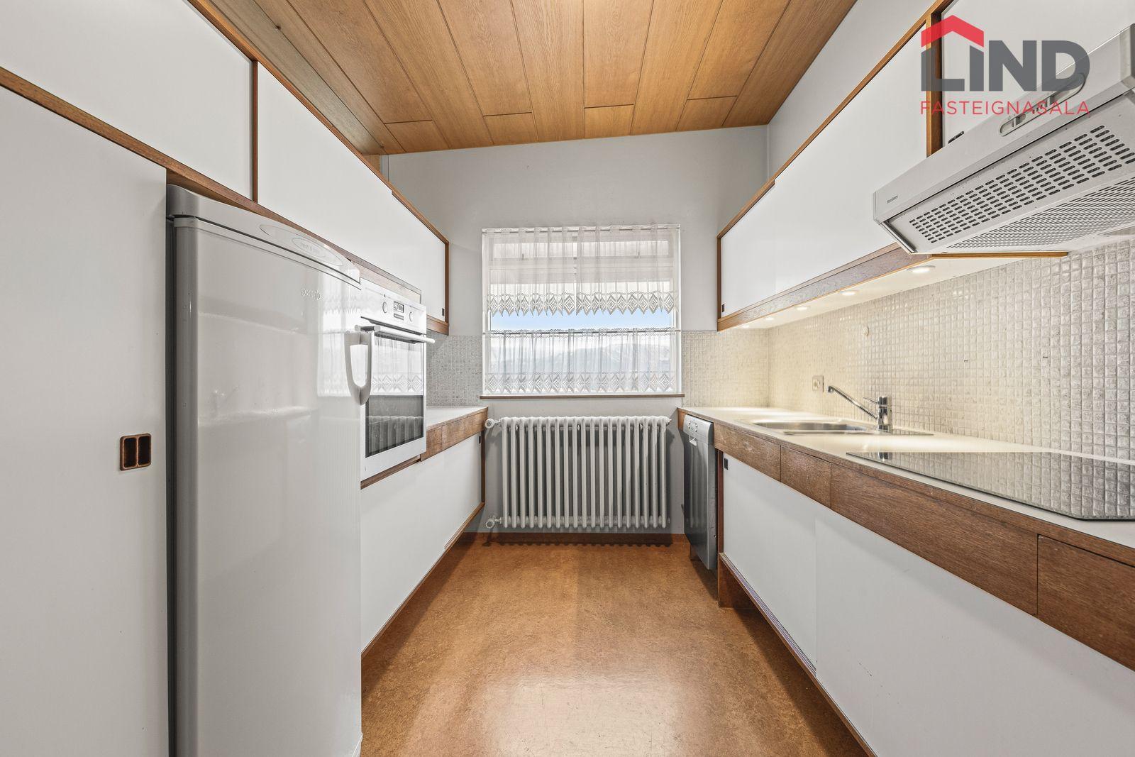 Eldhús: Með dúk á gólfi og upprunalegri eldhúsinnréttingu. AEG bakaraofn, Gorenje spansuðu helluborð og uppþvottavél. Flísar á milli skápa, gluggi til norðurs og borðkrókur. Fallegur panell í loftum.