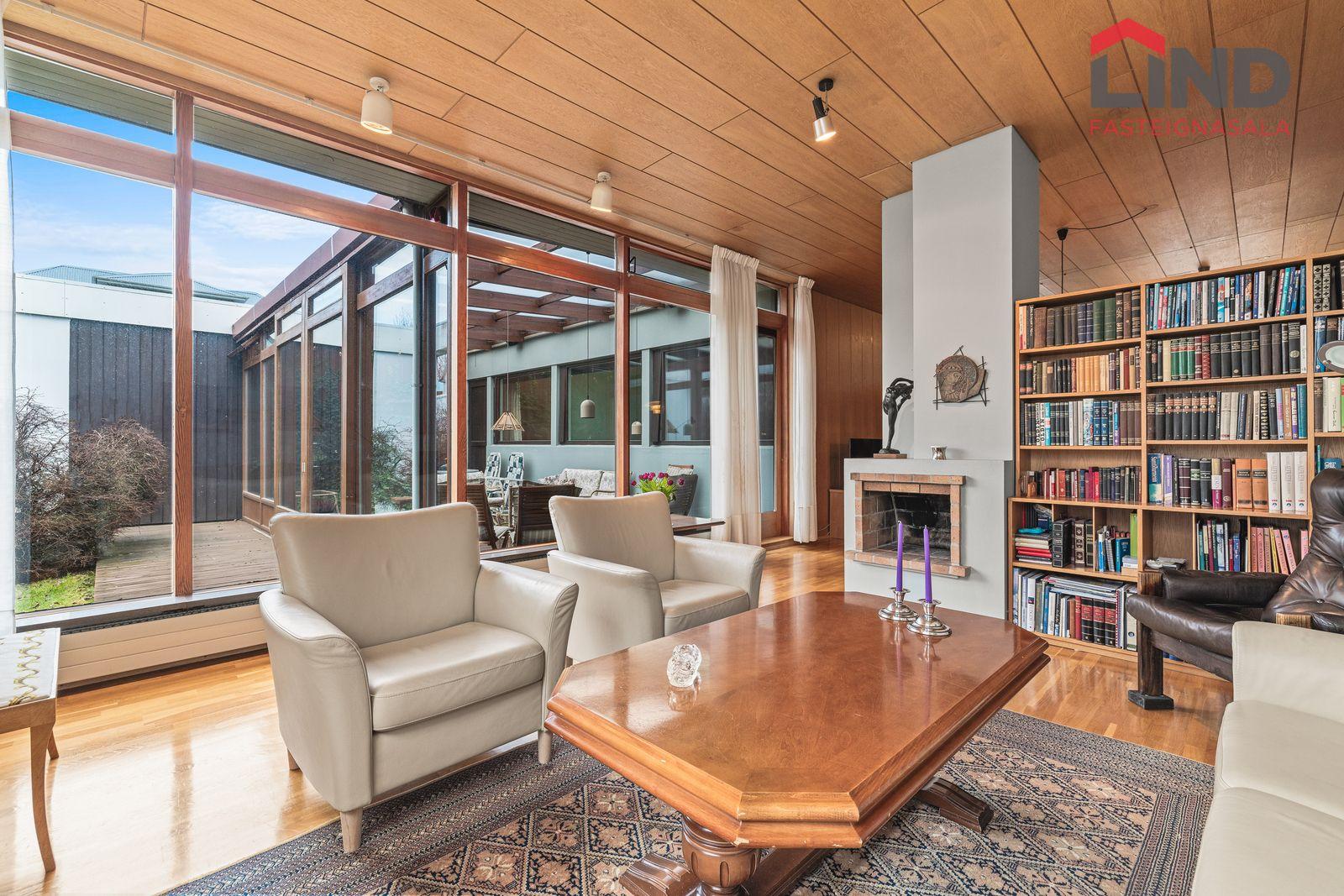 Stofa: Er rúmgóð og skiptist í setustofu og borðstofu. Aukin lofthæð, parket á gólfi og gluggar til suðurs og vesturs. Fallegur eikar panell í loftum og sjarmerandi arinn í setustofu. Útgengi í sólskála.