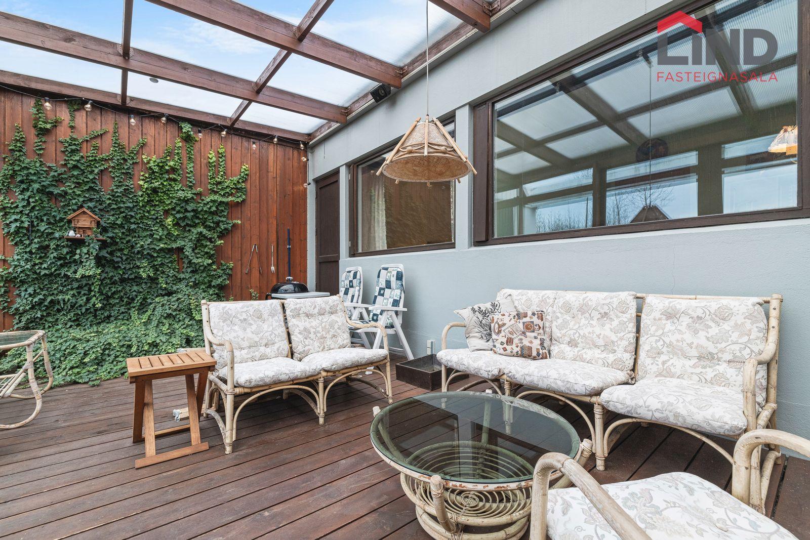 Sólskáli: Er u.þ.b. 30 fermetrar að stærð með viðargólfi gler gluggum til suðurs inn í bakgarð hússins. Rennihurðar og gler í þaki.