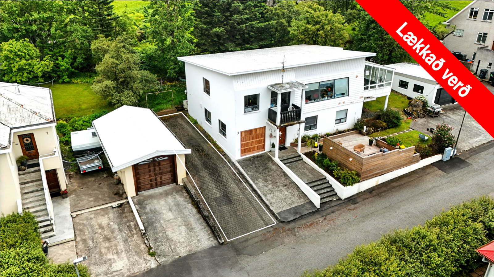 Húsið er vel staðsett og reisulegt en fer að þarfnast viðhalds að utan.