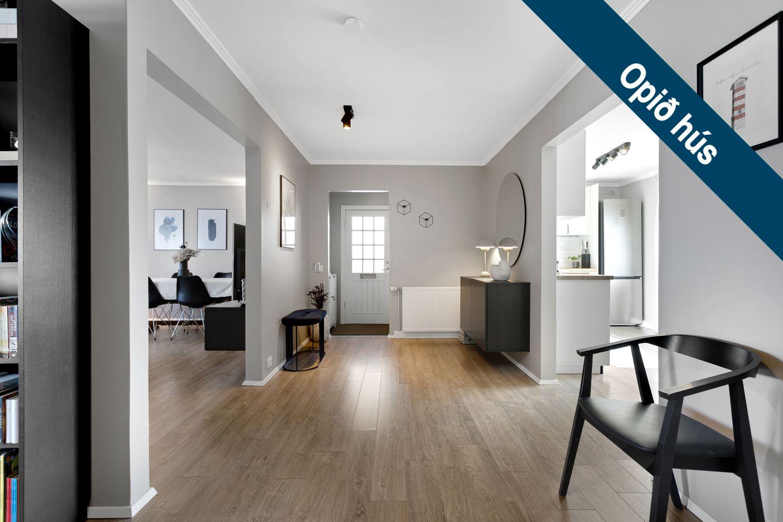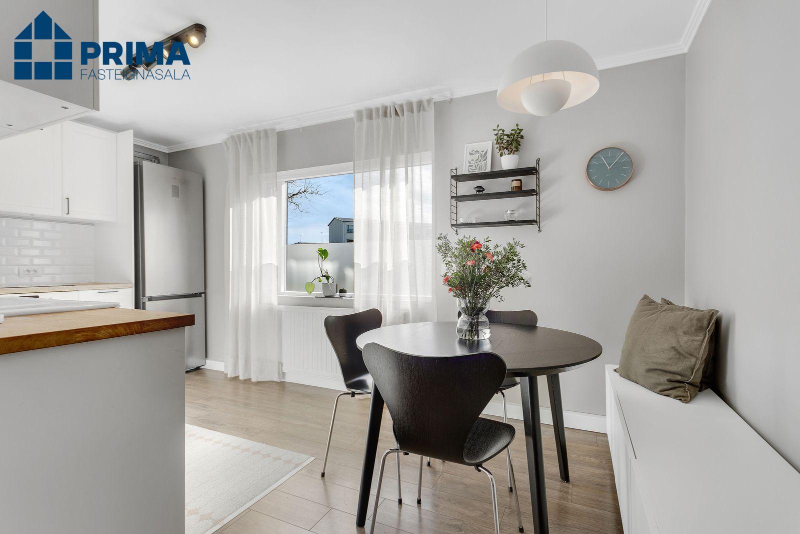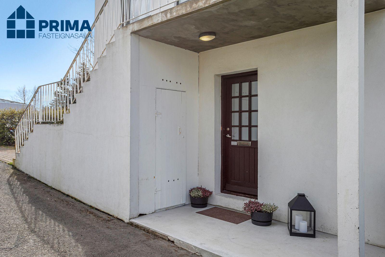 Stofa/borðstofa með harðparketi á gólfi. Þvottahús í íbúðinni, málað gólf, útgengt á timburverönd með skjólveggjum.