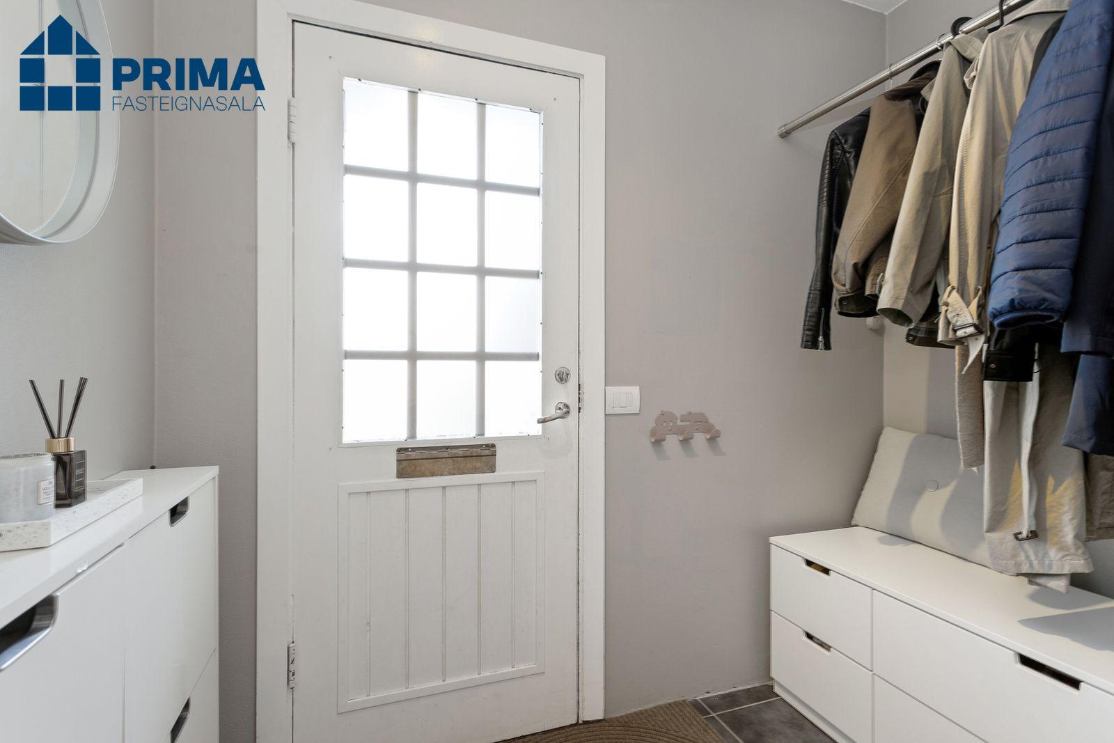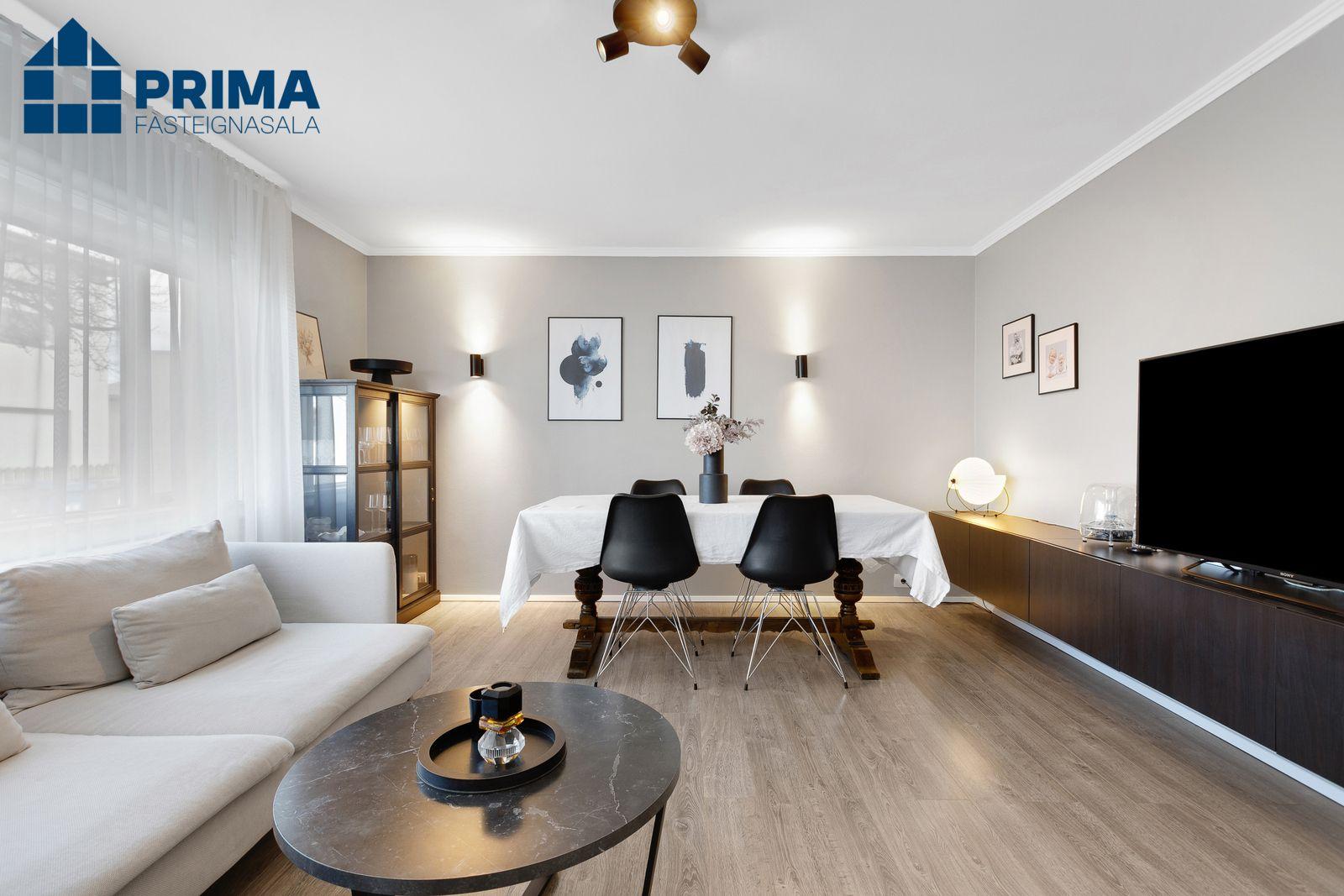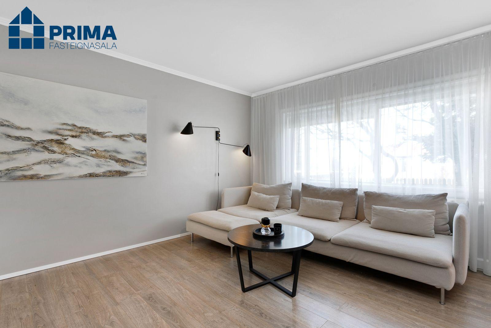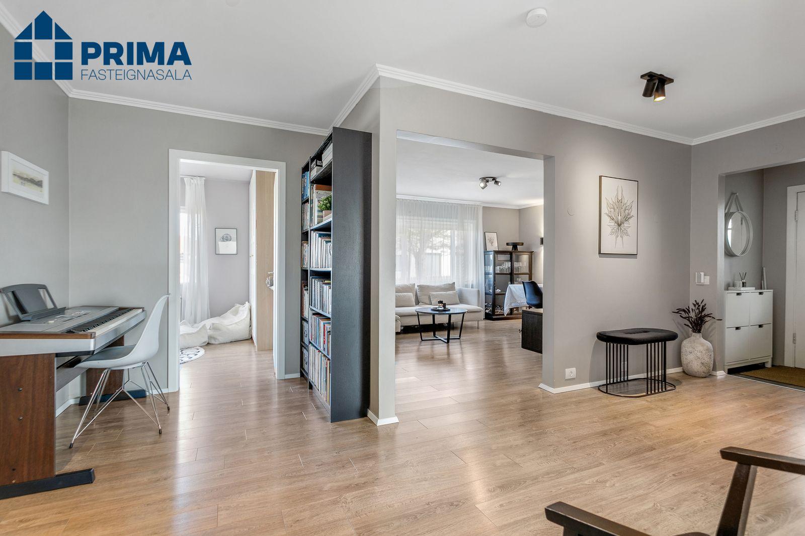 Stofa/borðstofa með harðparketi á gólfi. Þvottahús í íbúðinni, málað gólf, útgengt á timburverönd með skjólveggjum.
