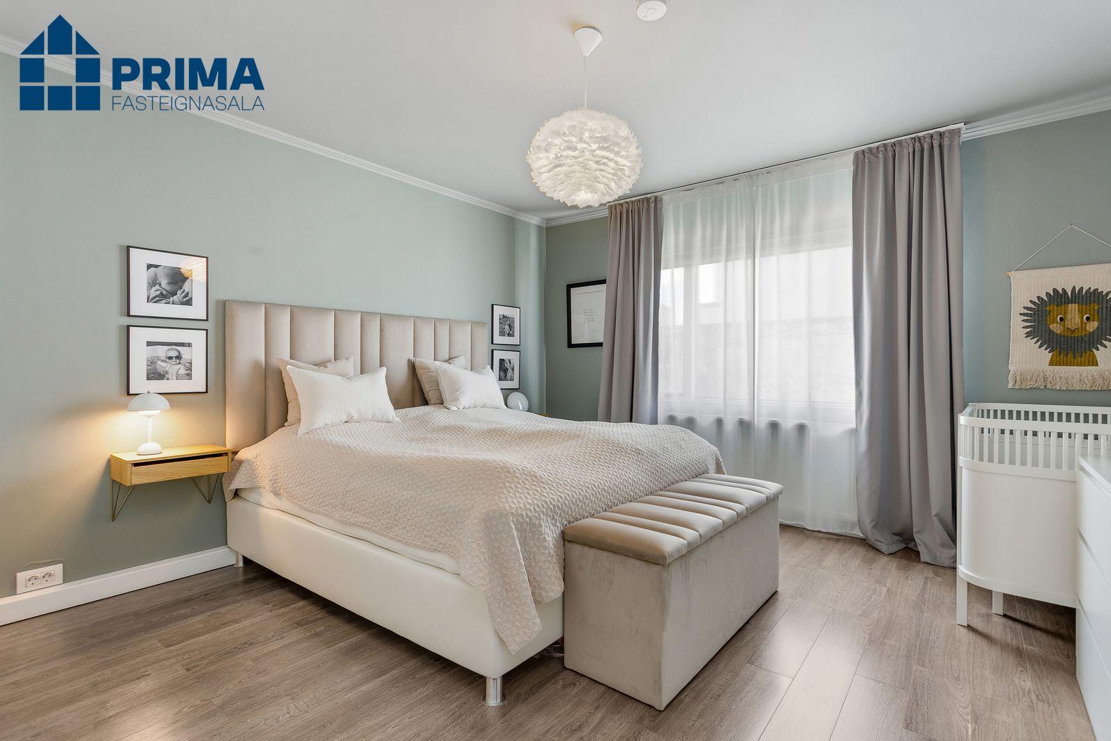 Rúmgott Hjónaherbergi með harðparketi á gólfi og góðum fataskáp.