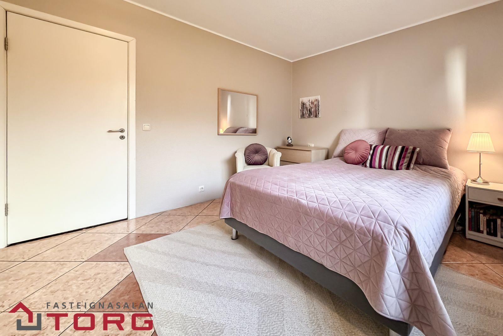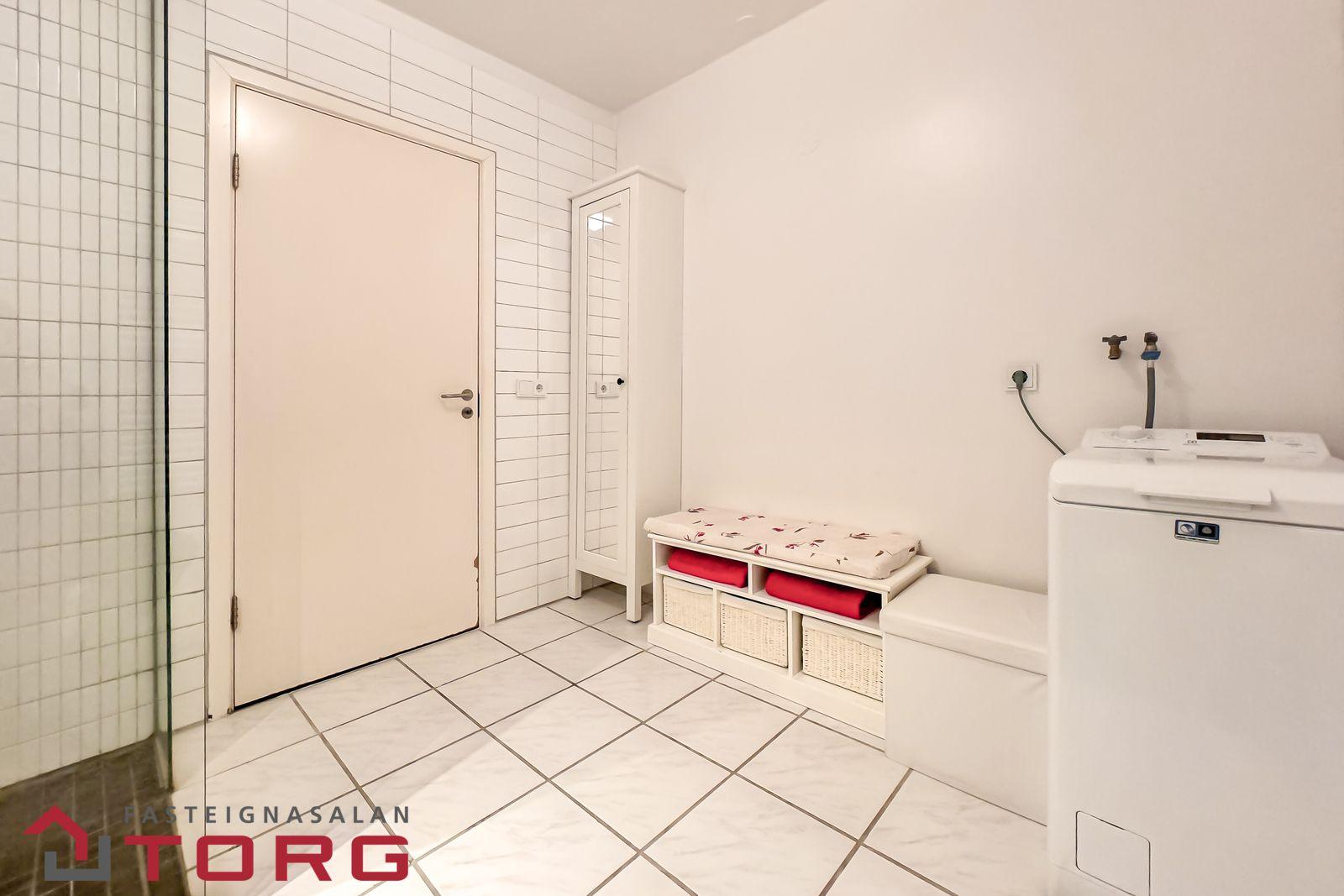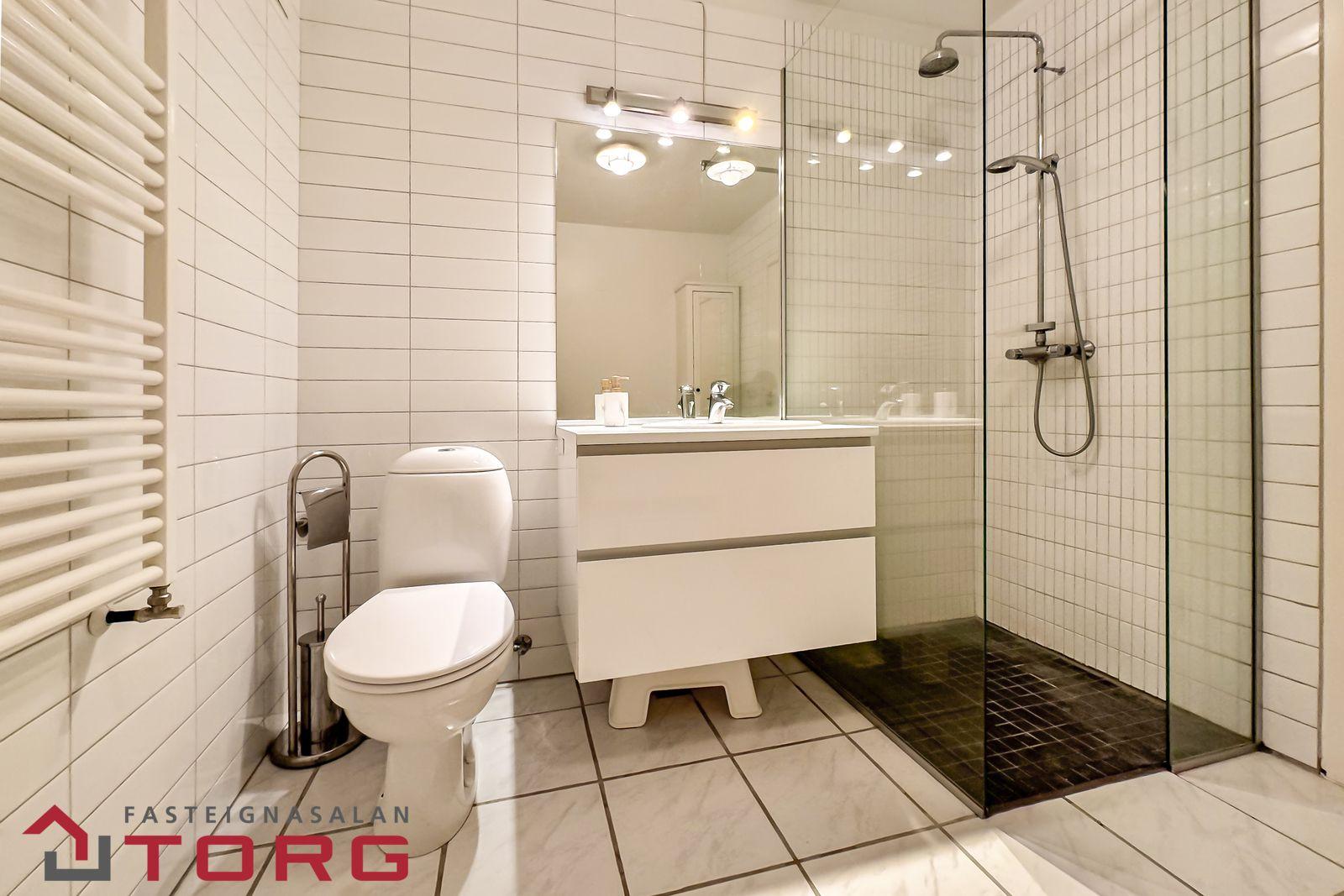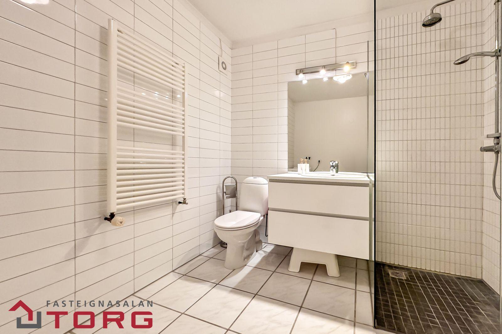 Baðherbergi: rúmgott með flísum á gólfi og veggjum að hluta. Hvít innrétting með handlaug og skúffum, inngeng sturta með glerskilrúmi, nýlegt salerni og handklæðaofn. Tengi er fyrir þvottavél og þurrkara á baðherberginu.