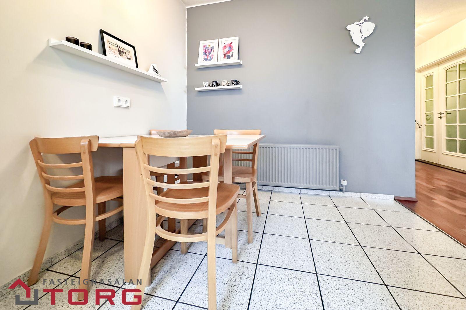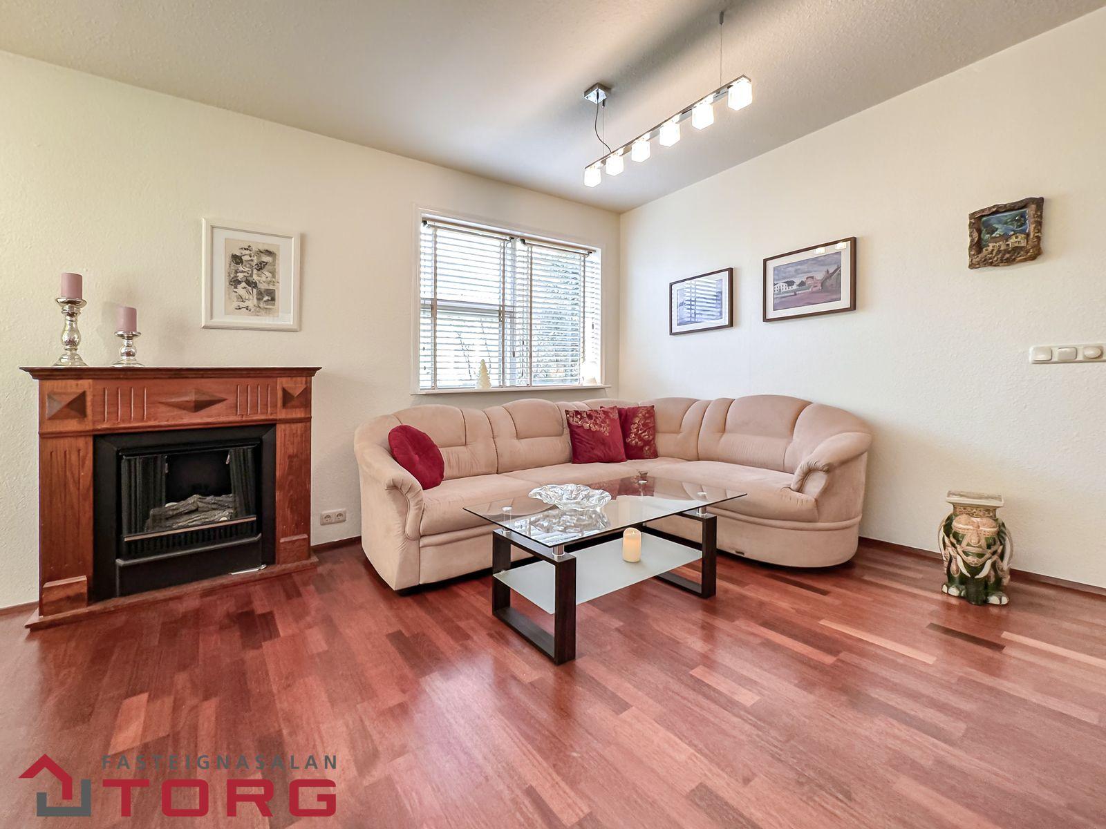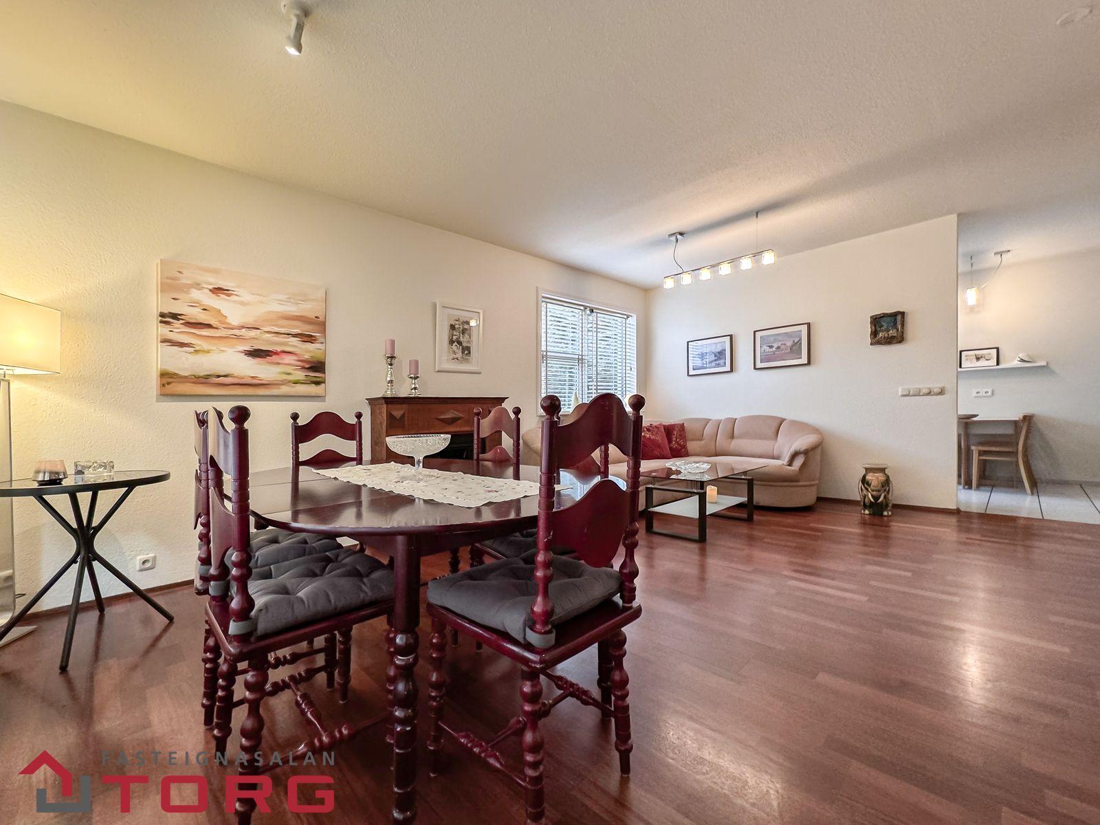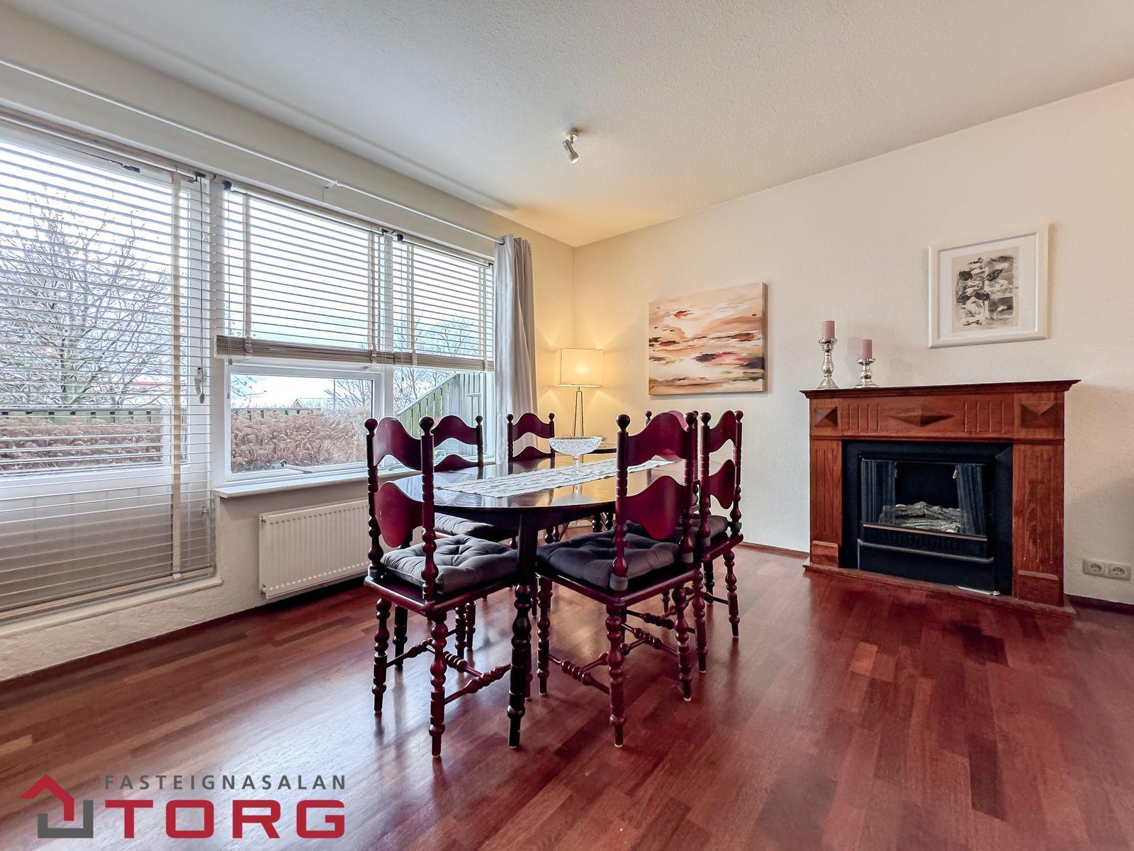 Stofa/borðstofa: bjart rými sem rúmar vel bæði borðstofu og setustofu með parket á gólfi og útgengi út á hellulagða verönd til suðurs og afgirt með timburskjólveggjum. Borðstofan var áður svefnherbergi og mögulegt að breyta því aftur í herbergi.