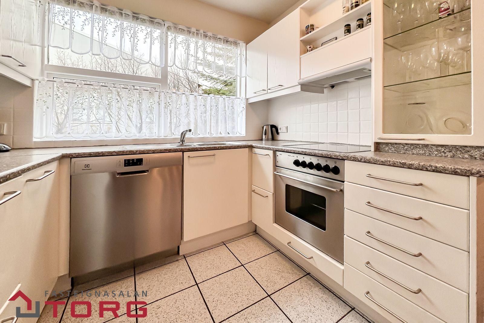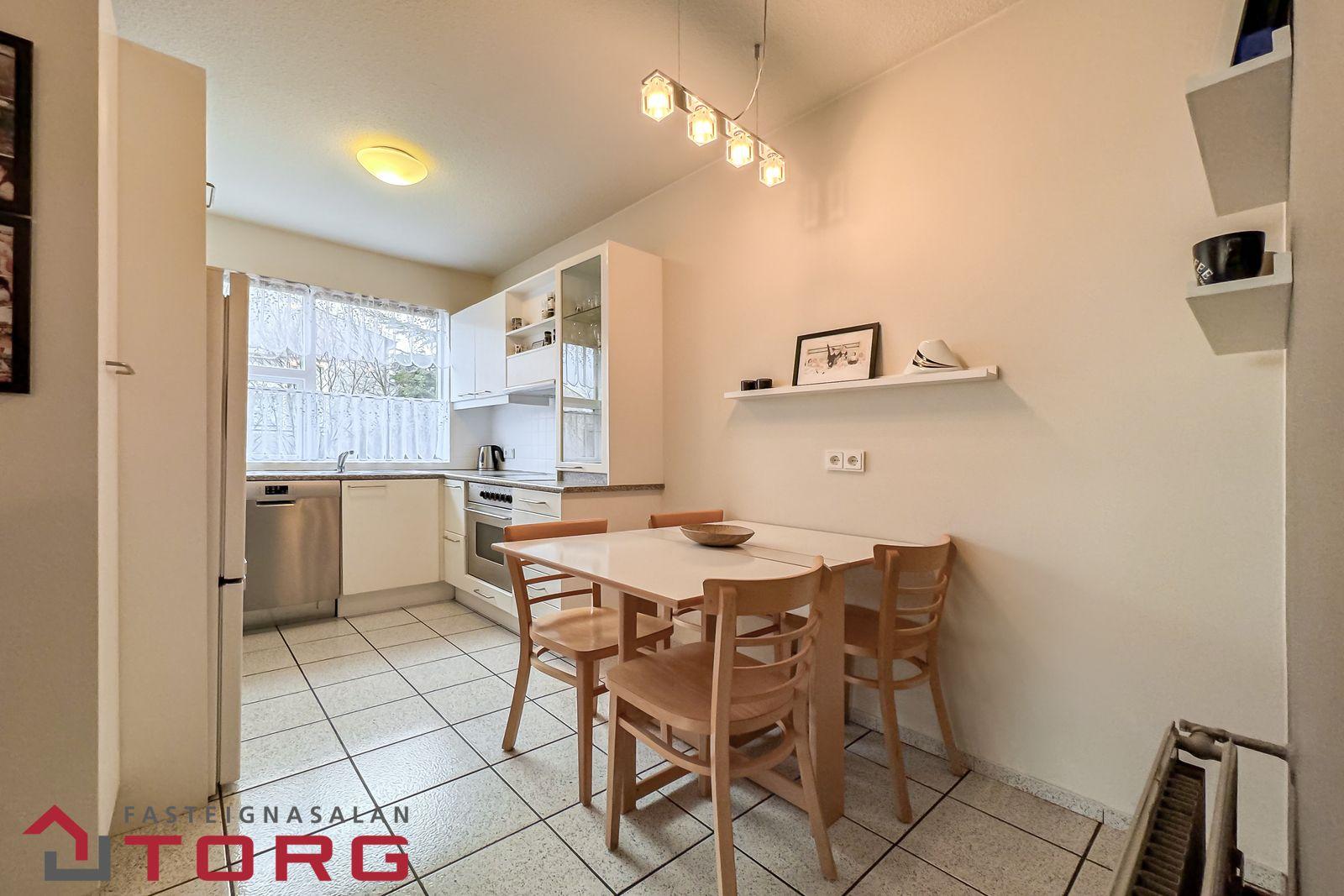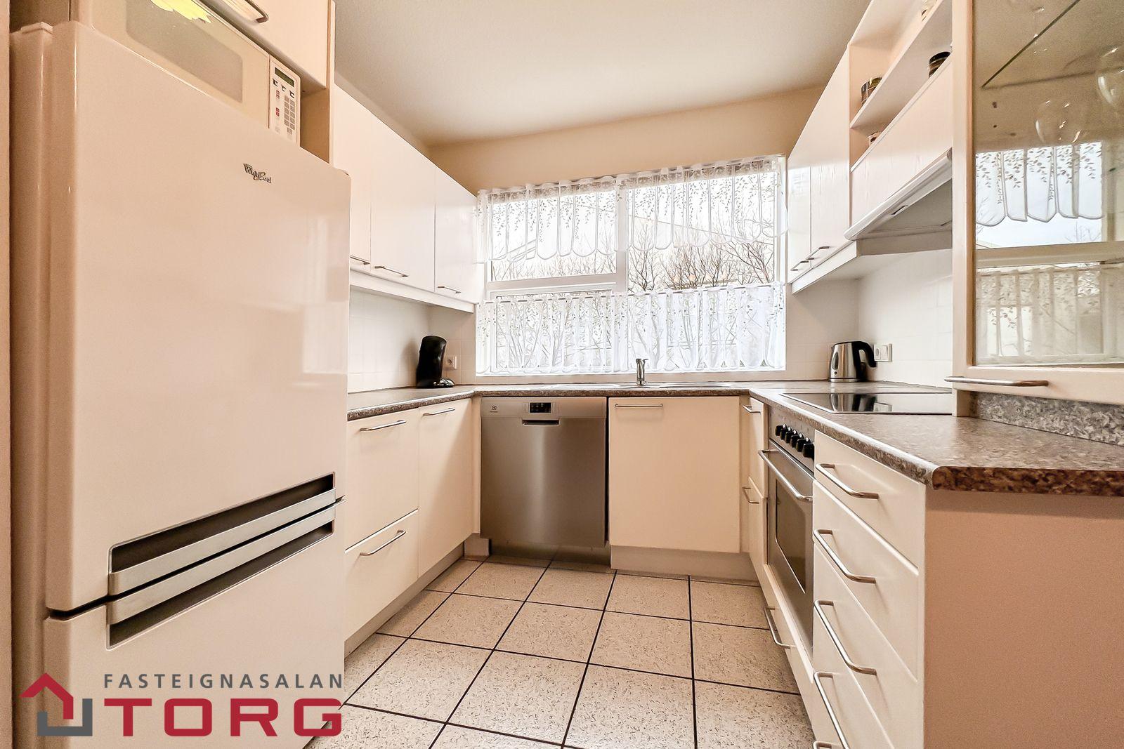 Eldhús: bjart og fallegt með hvítri innréttingu, gráyrjóttri borðplötu og flísum eru á milli efri og neðri skápa. Tengi er fyrir uppþvottavél í innréttingu. Stór gluggi er í eldhúsinu, rúmgóður borðkrókur og flísar á gólfi.