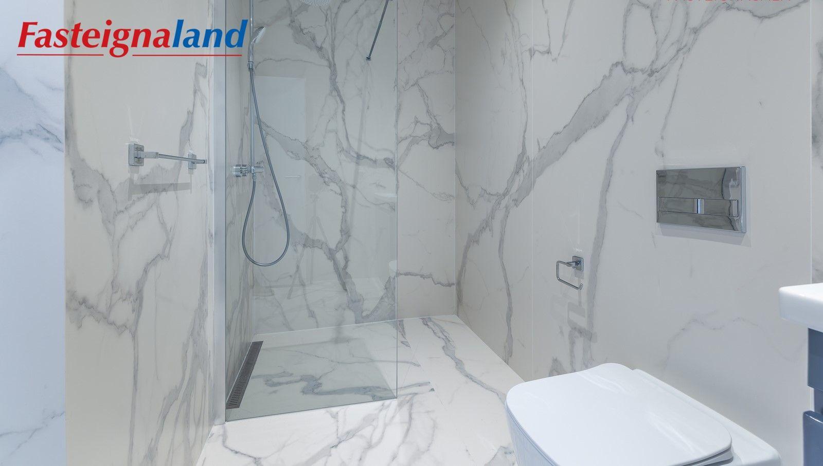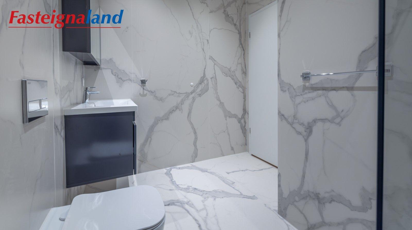 Baðherbergi - Á gólfum og veggjum eru flísar 1m x 2.7m í marmara lit. - Loftræstikerfi er á baðherbergi með sér lögnum - Baðherbergi er með 80 cm dökk grárri innréttingu með hvítum vaski og speglavaski fyrir ofan. - Sturta er með höfuð og handsturtu. - Innbyggður salerniskassi með fallegu sturtuspjaldi, upphengd salerniskál með hæglokandi setu. Eldhús - Eldhúsinnréttingar eru hvítar - U laga eldhús með eldhúshellu þar sem hægt er að hafa 2-3 stóla við. - Borðplata er með ljósum stein og er eldhúsvaskur hannaður ofan í plötuna í sama efni. Eldhústæki eru frá Ormsson og eru eftirfarandi: - Eldavél – AEG Spanhelluborð með innfeldri viftu - Bakaraofn – AEG Veggofn blástursofn blástursofn - Örbylgjuofn - AEG 26 lítra – 900 wött - Ísskápur Innbyggður- AEG með frysti - AEG Uppþvottavél
