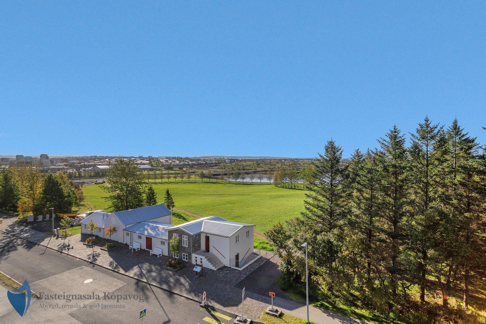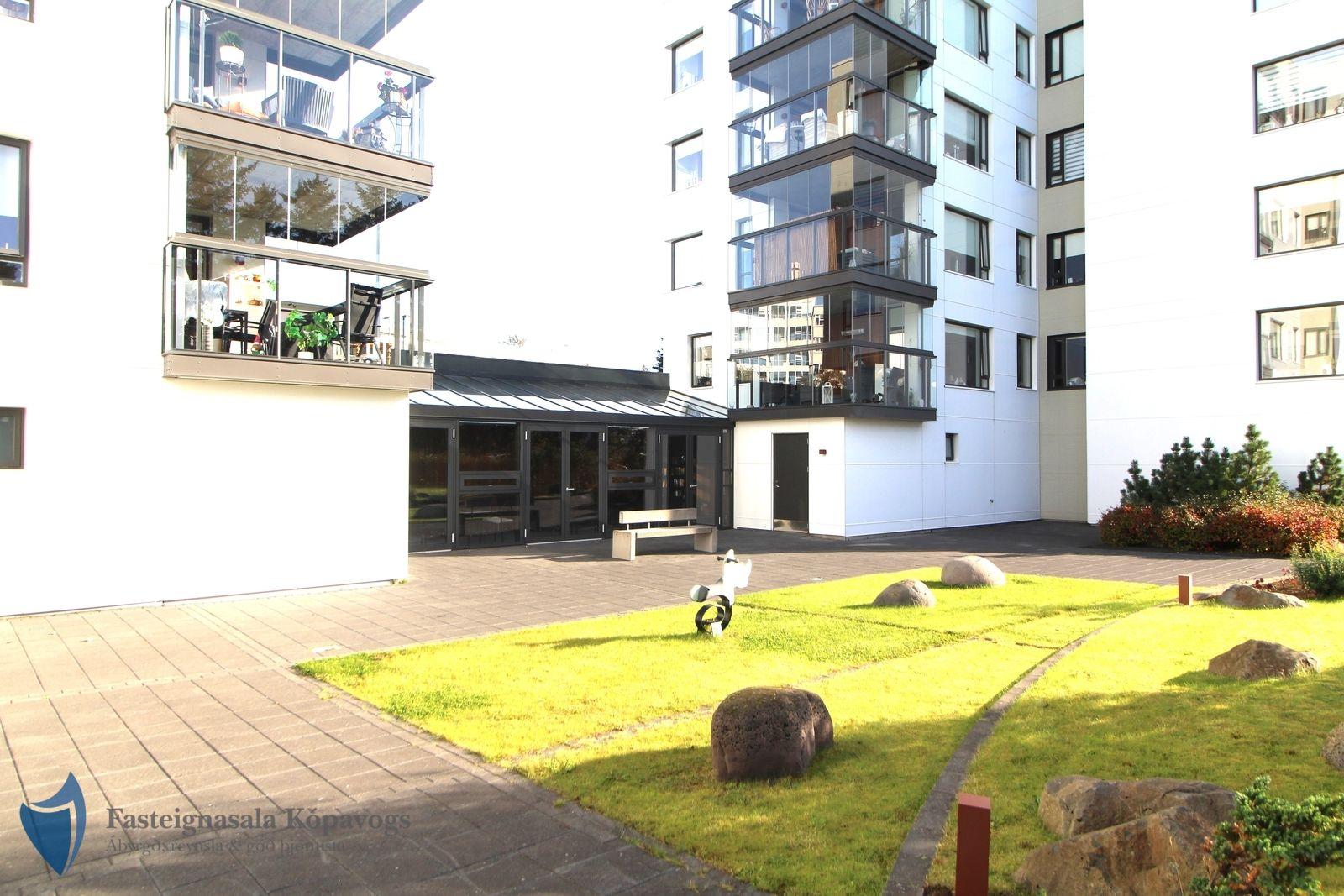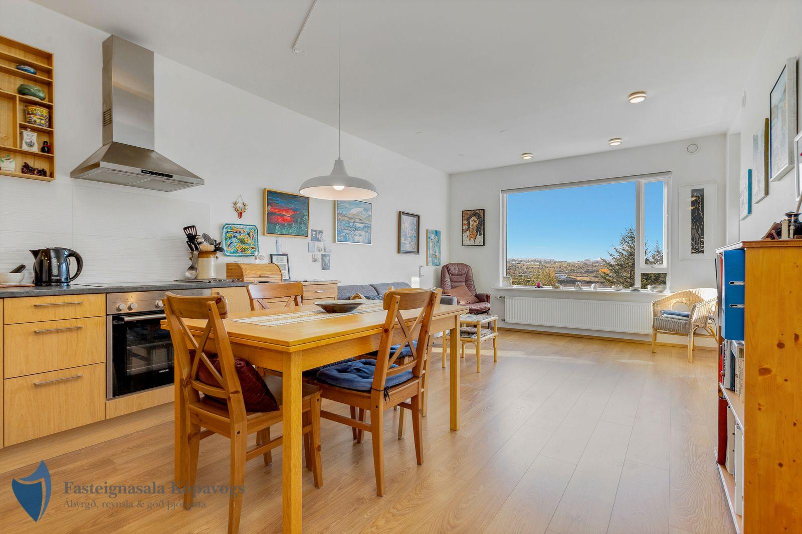 Forstofa er með fataskáp. Eldhús er með spónlagðri innréttingu og góðum tækjum. Eldhús er í einu opnu rými með stofu. Stofan er björt og rúmgóð og þaðan er útgengt út á svalir með glerlokun. Svalir snúa í suð-vesturs, með fallegu útsýni. Hjónaherbergi er með góðum fataskáp. Parket er á gólfum íbúðarinnar. Baðherbergi er rúmgott með ljósri innréttingu, sturtu með glerlokun og flísalagt gólf og veggi. Innná baðherbergi er einnig innrétting fyrir þvottavél og þurrkara, gott skápapláss. Sérgeymsla er á jarðhæð ásamt hjólageymslu.