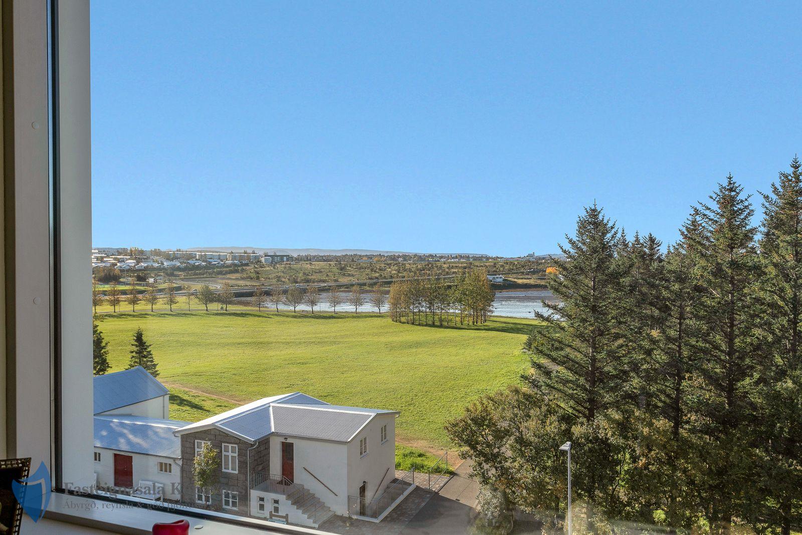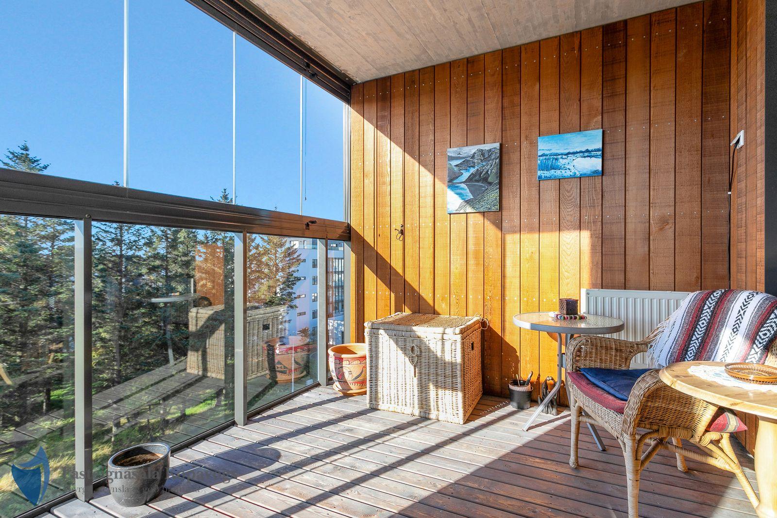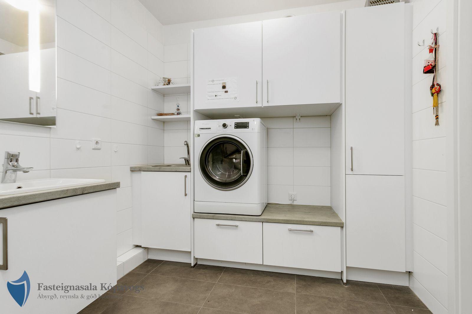 Forstofa er með fataskáp. Eldhús er með spónlagðri innréttingu og góðum tækjum. Eldhús er í einu opnu rými með stofu. Stofan er björt og rúmgóð og þaðan er útgengt út á svalir með glerlokun. Svalir snúa í suð-vesturs, með fallegu útsýni. Hjónaherbergi er með góðum fataskáp. Parket er á gólfum íbúðarinnar. Baðherbergi er rúmgott með ljósri innréttingu, sturtu með glerlokun og flísalagt gólf og veggi. Innná baðherbergi er einnig innrétting fyrir þvottavél og þurrkara, gott skápapláss. Sérgeymsla er á jarðhæð ásamt hjólageymslu.