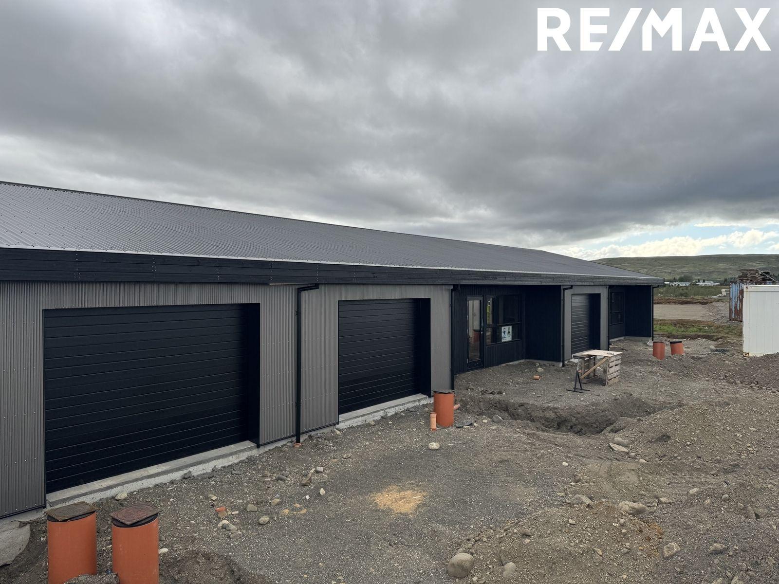 Nánari lýsing: Sökklar: Sökklar eru steyptir og einangraðir að innan. Gólfplata: Gólfplata er steypt og einangruð með gólfhita í. Neysluvatnslagnir eru lagðar skv. verkfræðiteikningum, rör í rör. Útveggir: Allir útveggir hússins eru úr timburgrind. Húsið er klætt að utan með litaðri grárri smábáru frá Húsasmiðjunni, timbur inn í innskoti við innganga. Gluggar og hurðir: Allir gluggar og útihurðir eru úr ál/tré. Tvöfalt verksmiðjugler frá viðurkenndum framleiðanda er í húsinu og flyst ábyrgð þess áfram til kaupenda. Söluaðili er Gluggatækni. Litur að utan er RAL 9005 (svart) og sami litur að innan. Þak: Tvíhalla þak er á húsinu og er það lituð stálklæðning í lit RAL 9005 (svart). Þakkantur: Þakkantur er timburklæddur með svörtum lit Niðurföll og þakrennur: Þakniðurföll eru úr áli frá Hagblikk og rennur eru úr plasti frá Húsasmiðjunni. Lóð: Lóð afhendist grófjöfnuð. Afhending: Húsið skilast fokhelt.