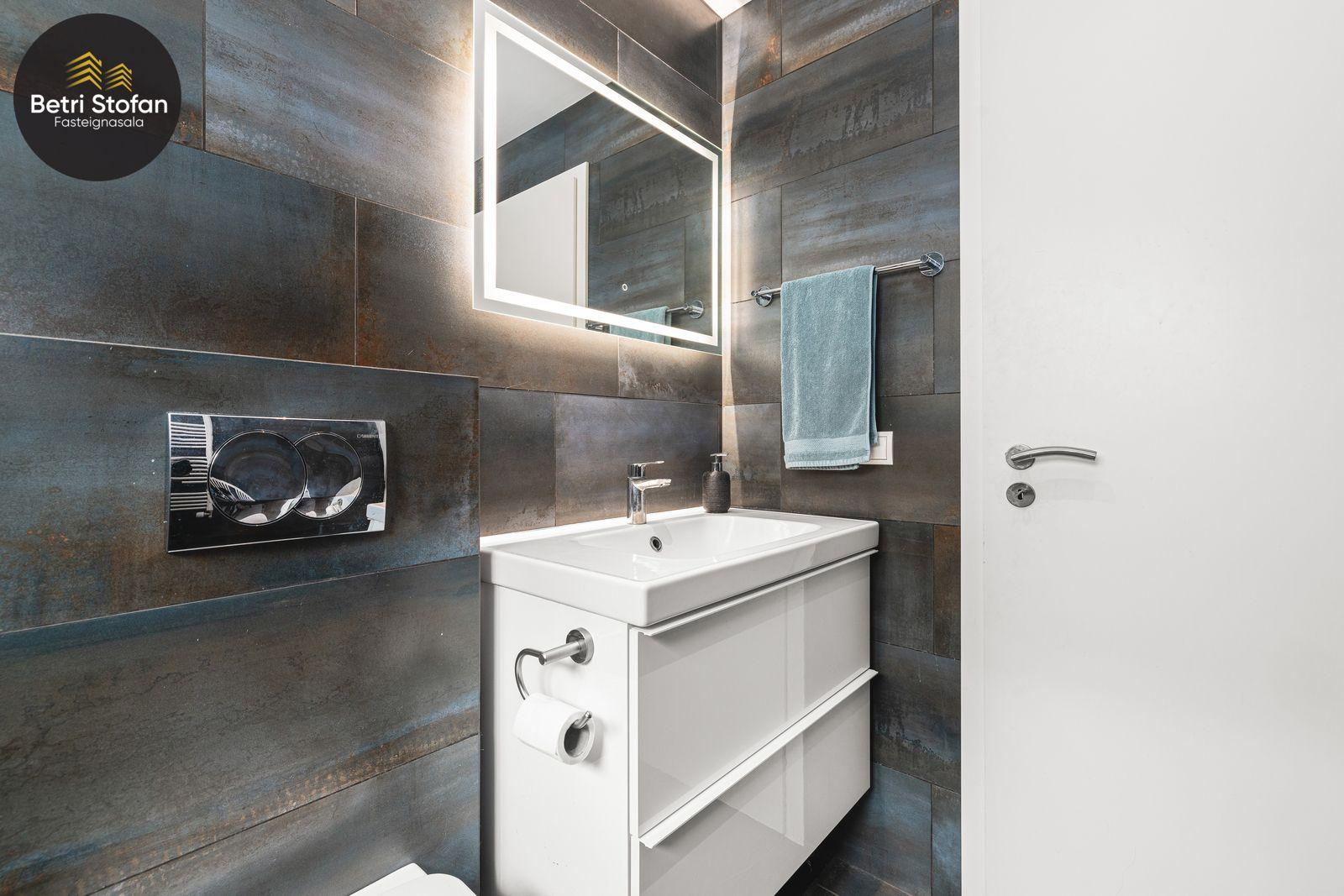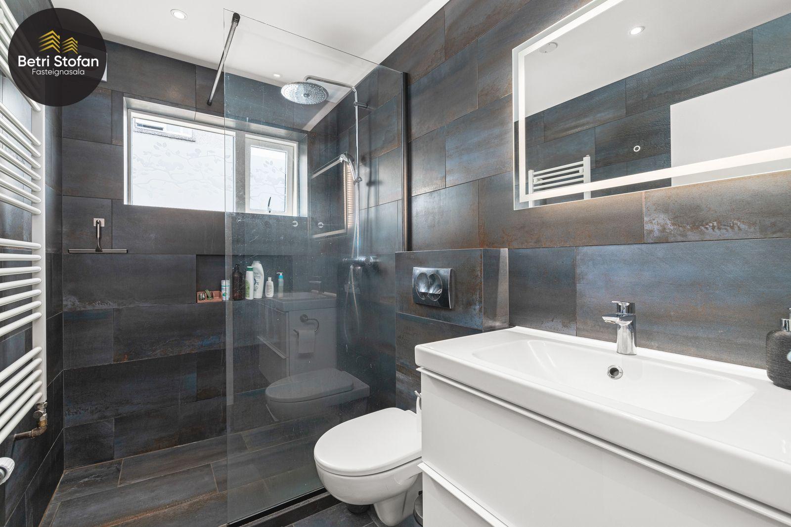 Baðherbergi: Nýstandsett. Flísalagt í hólf og gólf með walk in sturtu með gleri. Upphengt salerni. Baðinnrétting með skúffum og vaski. Spegill með innbyggðri lýsingu fyrir ofan innréttingu.