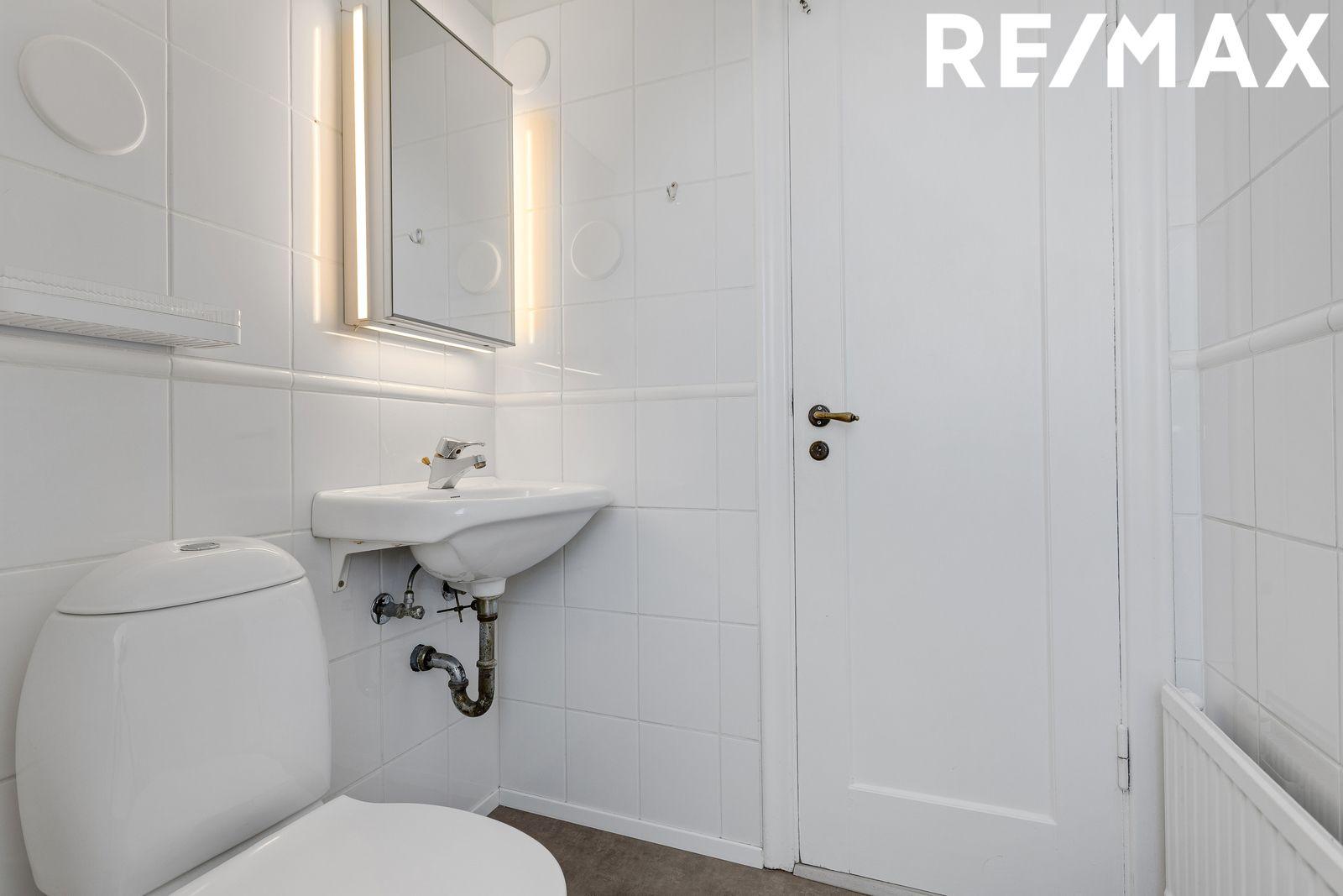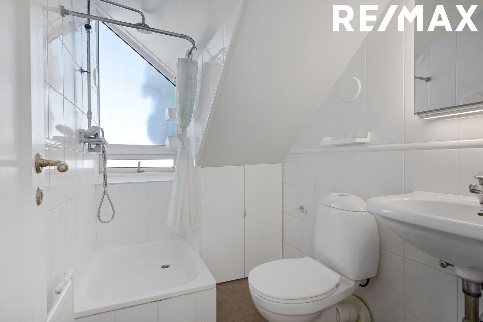 Baðherbergi er með sturtuklefa og glugga í kvisti, salerni og vaskinnréttingu með spegli. Innbyggður skápur er undir súð. Dúkur á gólfi en veggir eru flísalagðir.