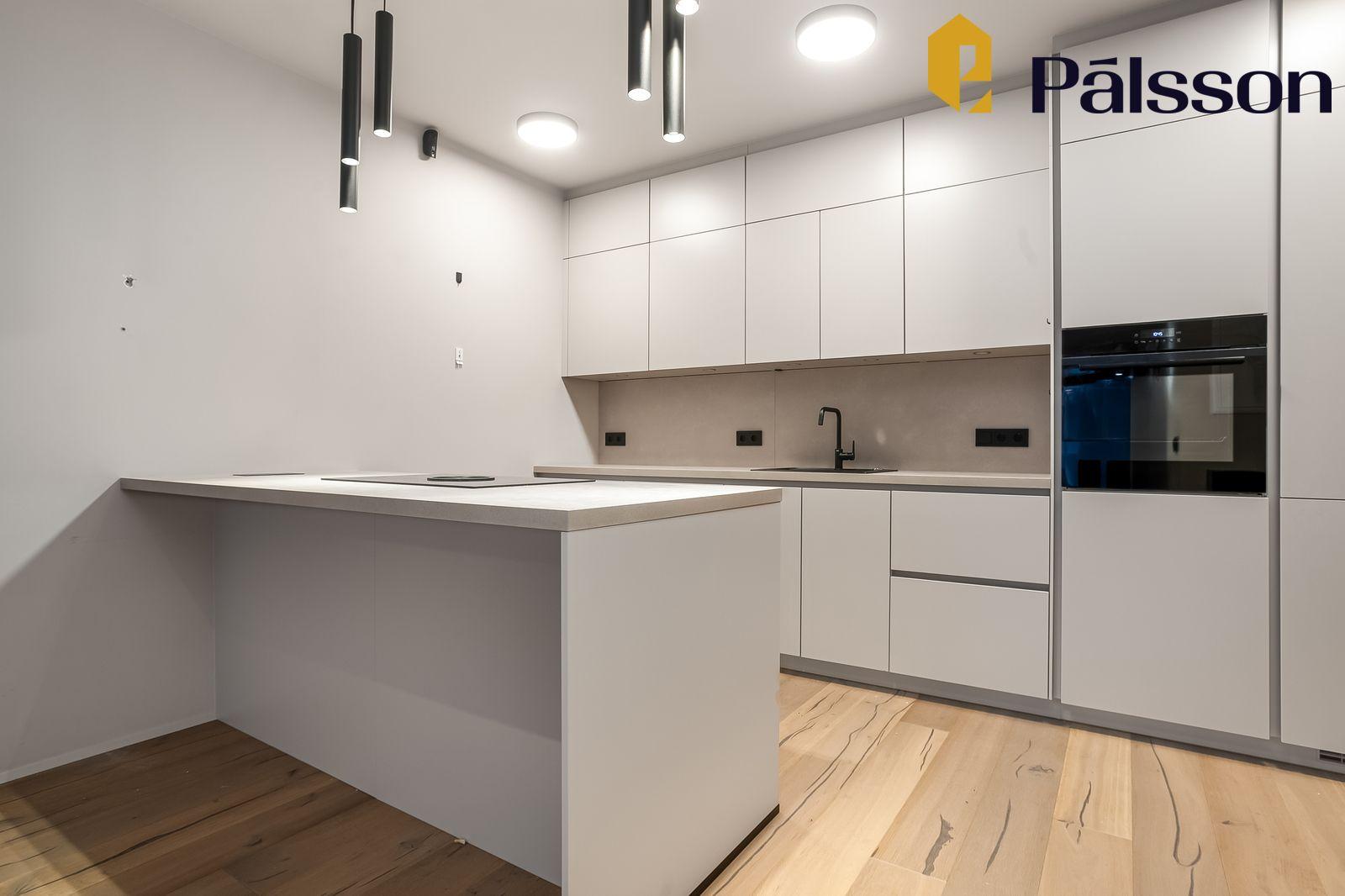 Eldhús með hvítri innréttingu frá GKS, ofn í vinnuhæð, innbyggður ísskápur og uppþvottavél. Parket á gólfi.