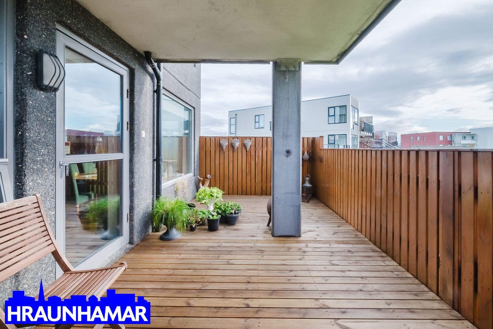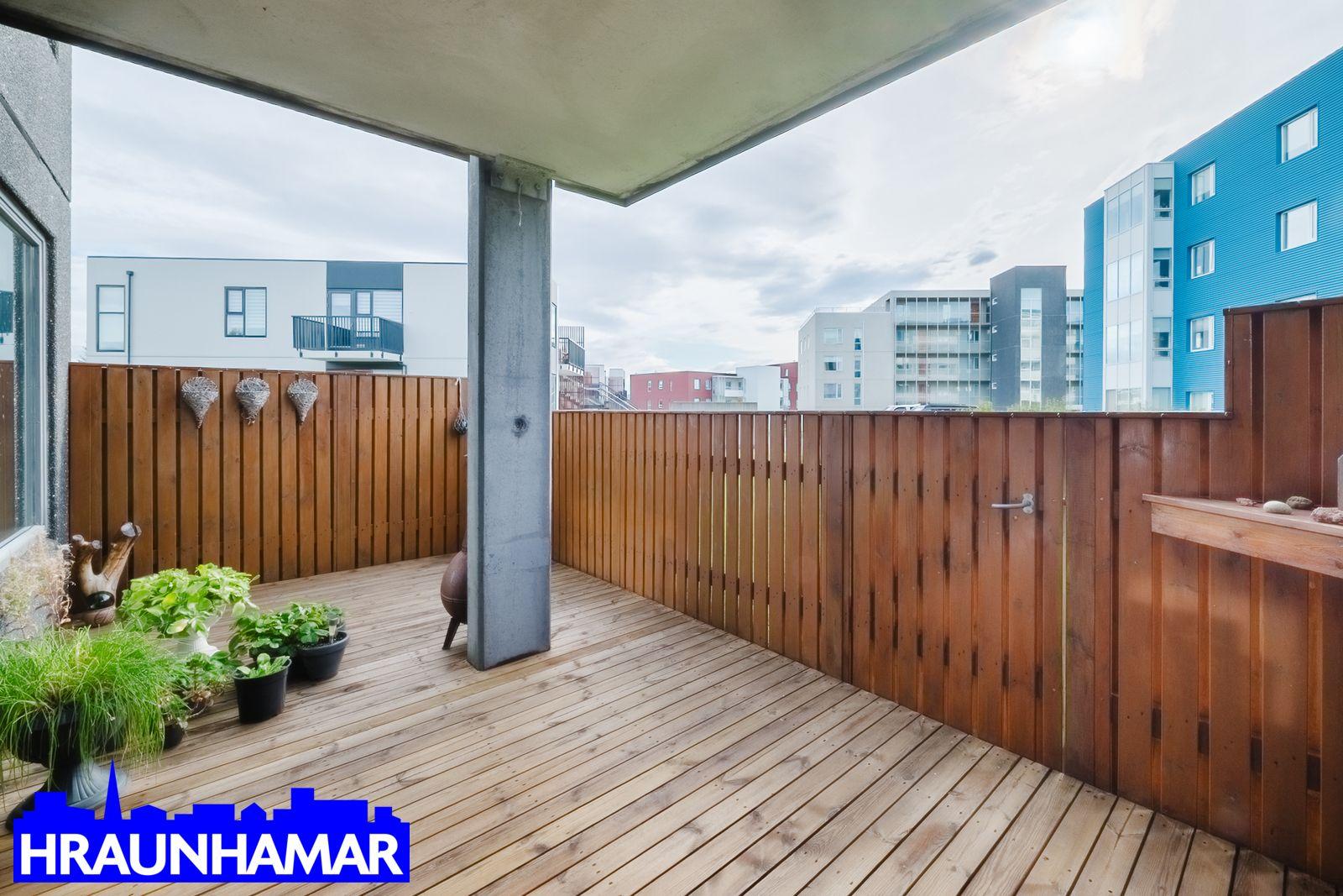 Forstofa: Flísalögð og með góðum skápum Eldhús: Er í opnu rými frá stofunni. Ljós eldhúsinnrétting, parket er á gólfum, Stofa/borðstofa: Er rúmgóð og björt. Parket er á gólfum. Frá stofunni er útgengt út á verönd. Svefnherbergi: rúmgott svefnherbergi með góðum fataskápum. Baðherbergi: Er flísalagt, baðkar og ljós innrétting. Þvottahús: þvottahús er innan íbúðar og er það flísalagt. Geymsla I. Rúmgóð geymsla með glugga er innan íbúðar. fataskápur. Parket er á gólfum. Möguleiki að nýta sem herbergi. Geymsla II: Utan íbúðar er 1,6 fm geymsla.