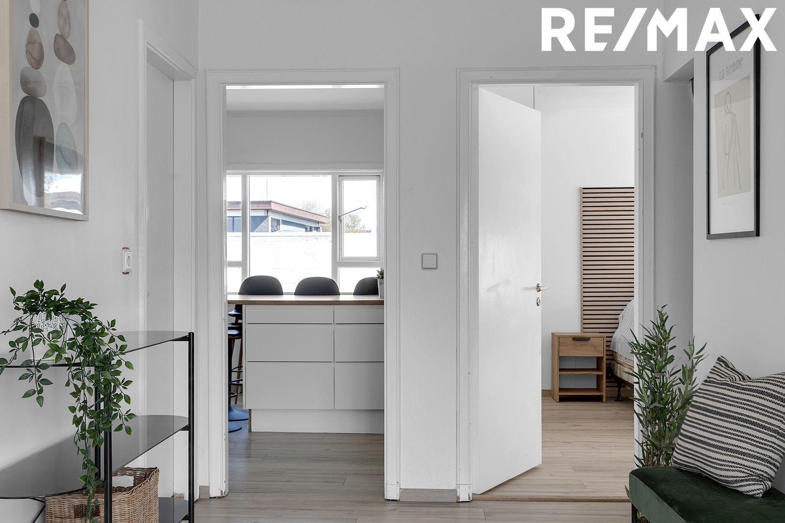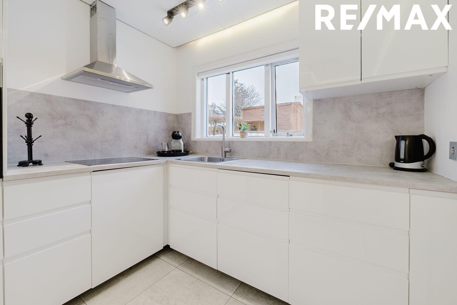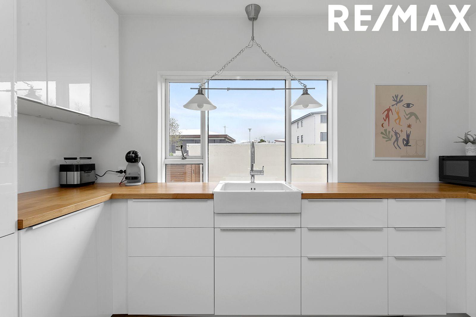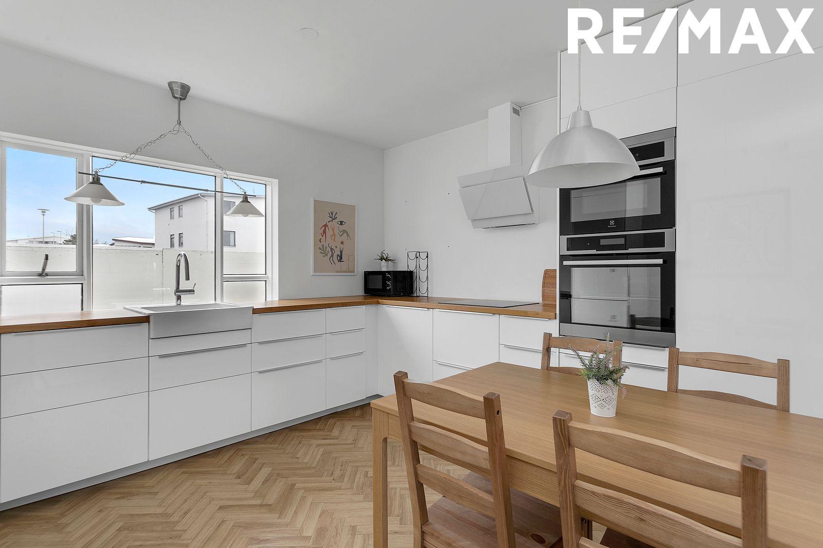 Eldhúsið er nýlega uppgert með hvítri innréttingu með miklu bekk- og skápaplássi og góðri vinnuaðstöðu, gott rými fyrir borð og stóla fyrir 6 manns. Innfelld uppþvottavél og ísskápur. Góður gluggi snýr í austur og inn í garðinn.