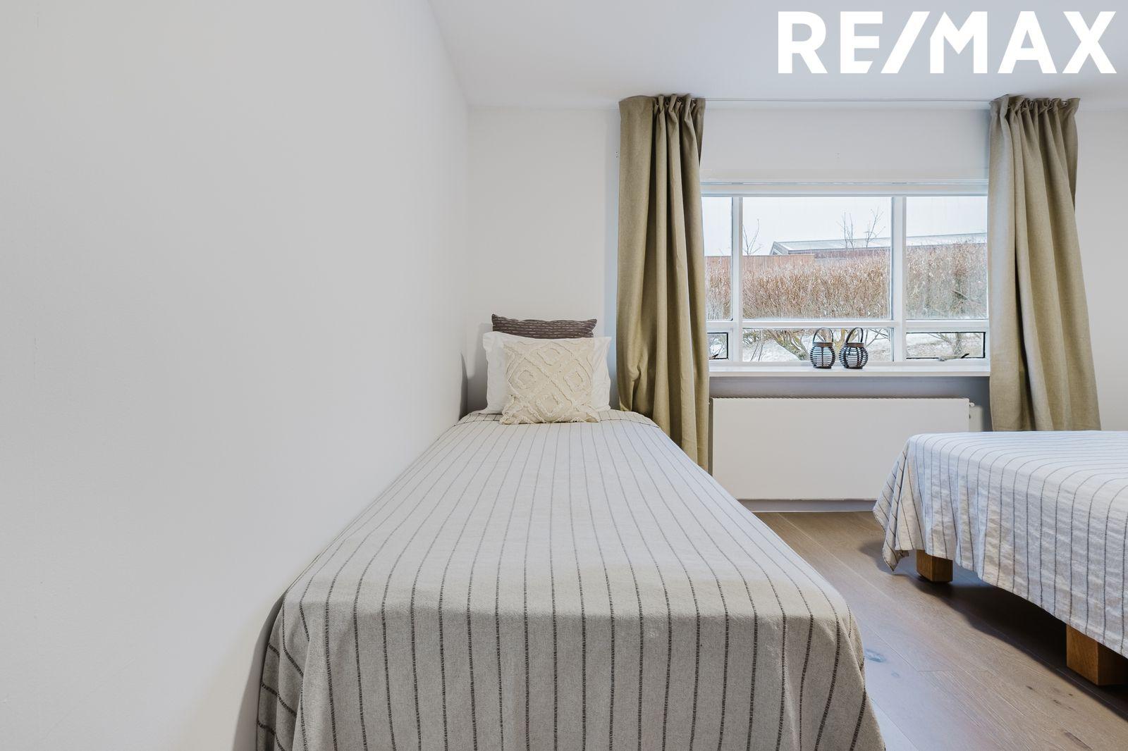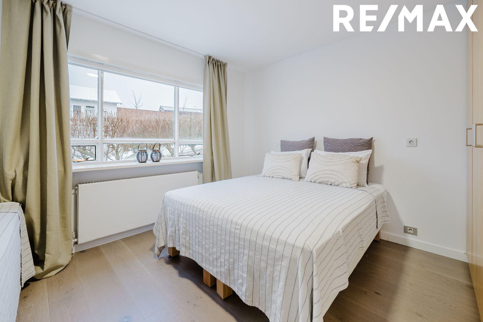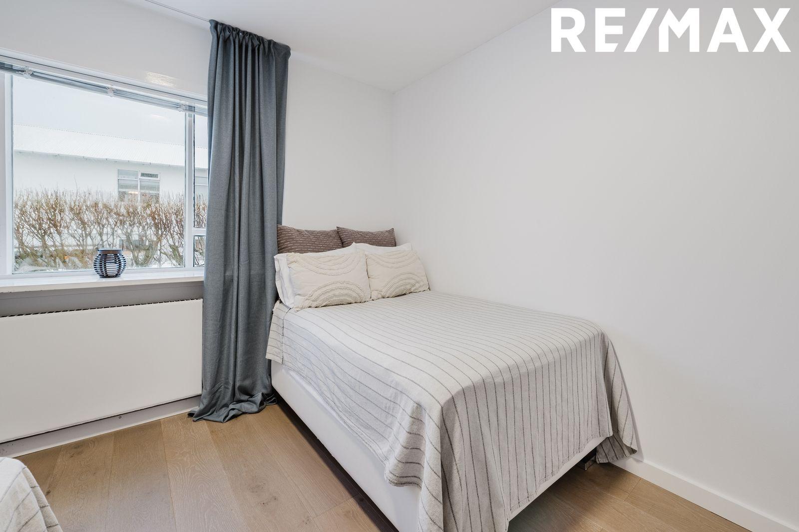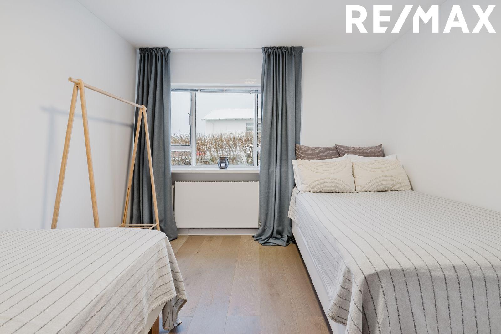Svefnherbergi eru tvö, rúmgott hjónaherbergi með góðum fataskápum og glugga.