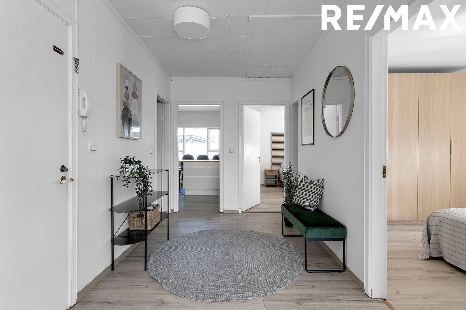 Nánari lýsing; Komið er inn í opið, rúmgott hol með fataskáp, það tengir á skemmtilegan máta aðrar vistarverur íbúðarinnar. Sameiginlegur inngangur með íbúðinni á jarðhæð. Gengið er upp stiga upp á stigapall.