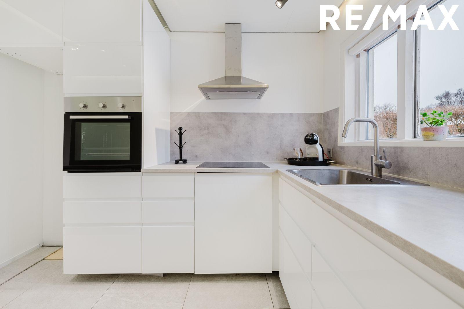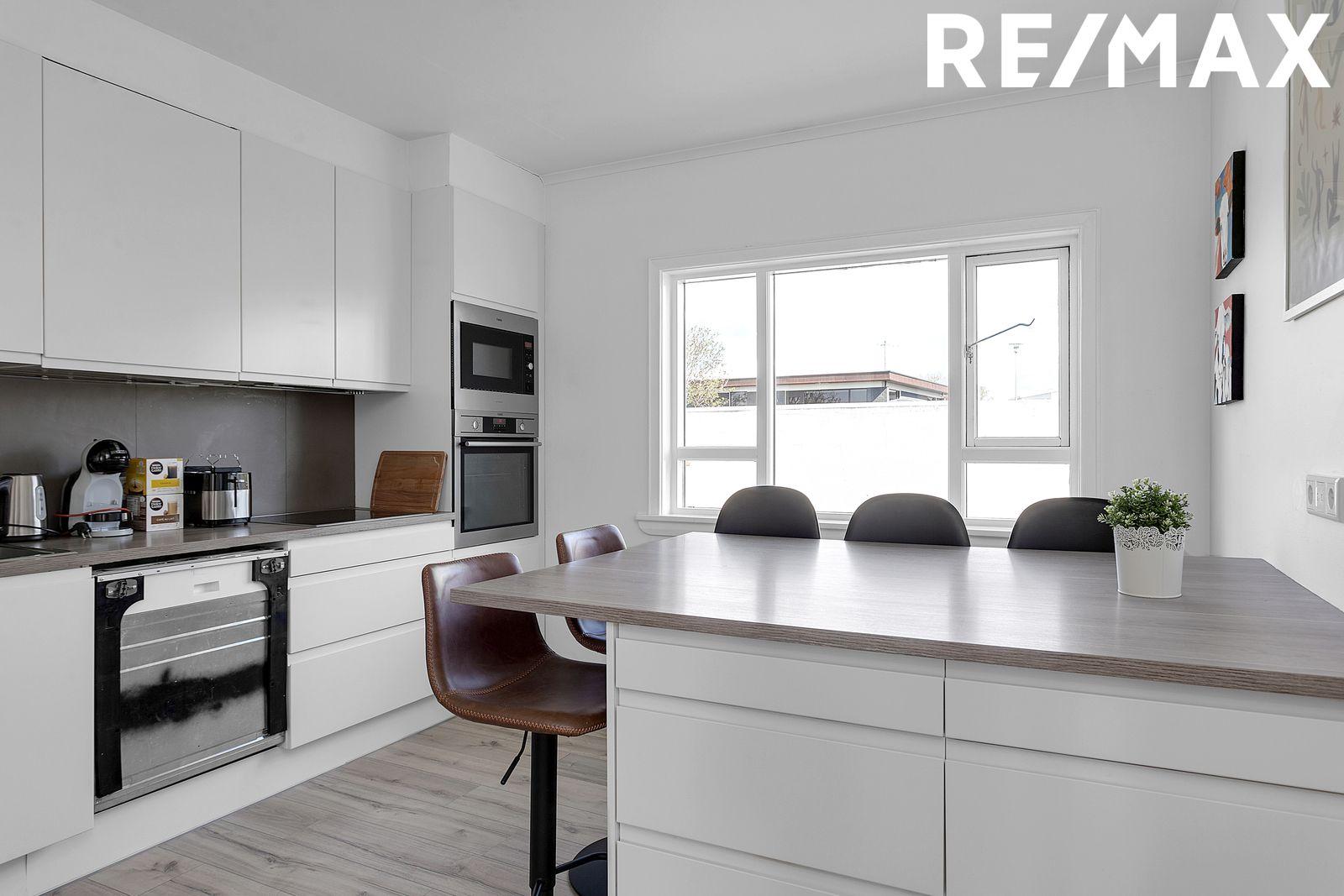 Eldhúsið er rúmgott með hvítlakkaðri HTH innréttingu, gráar flísar á milli innréttinga og eyja út frá vegg. Fallegur gluggi til suðausturs.