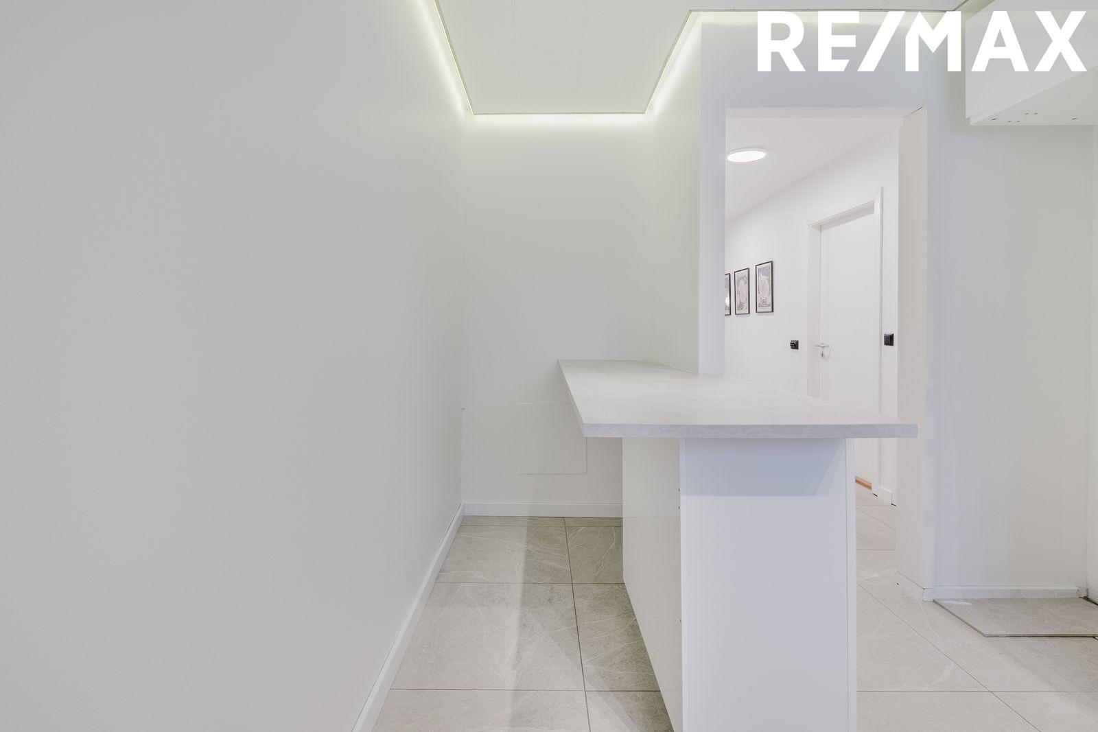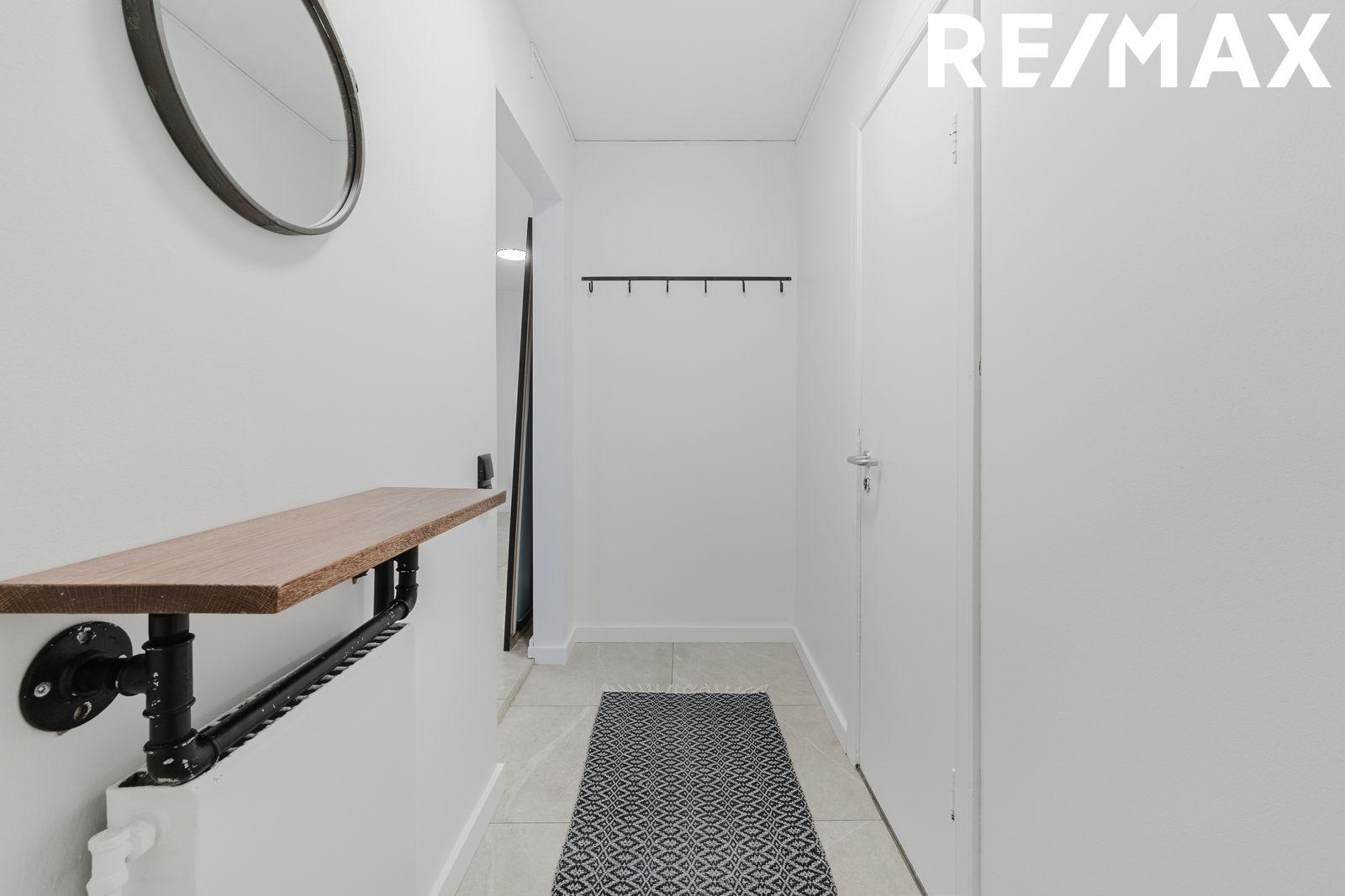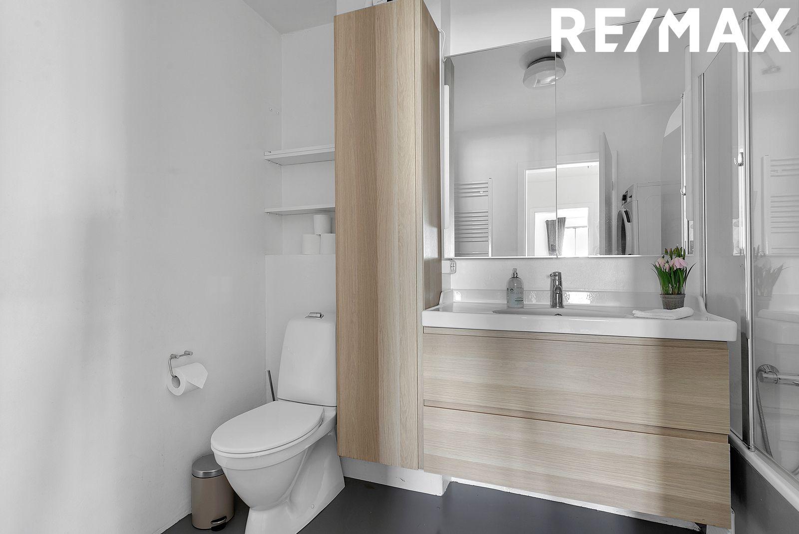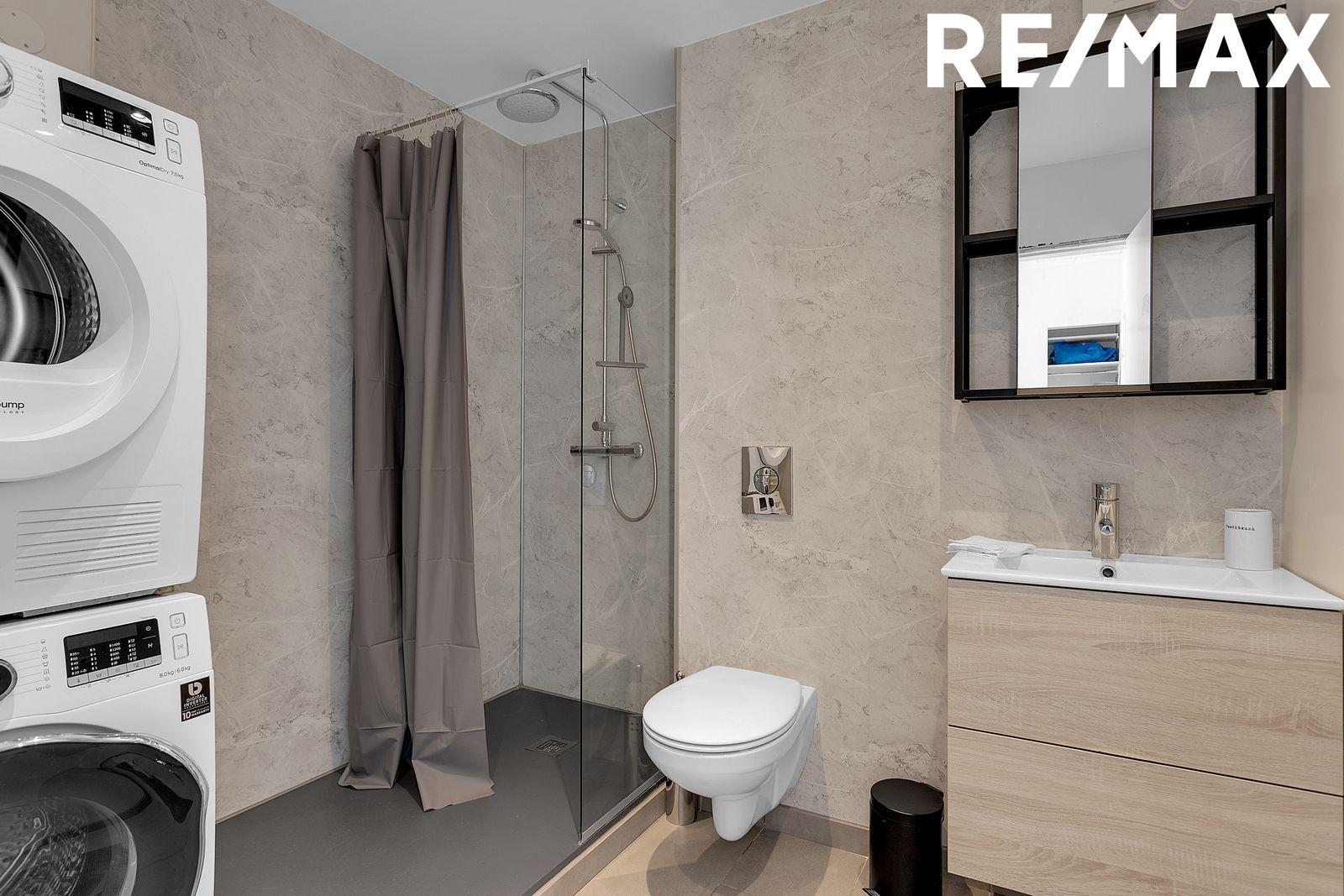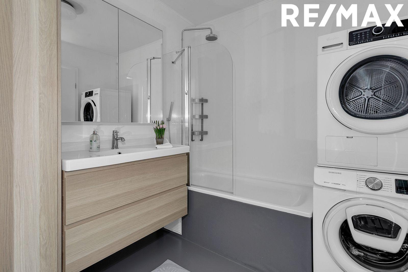 Baðherbergið er með sturtuklefa, handklæðaofni, lítilli innréttingu og tengi fyrir þvottavél.