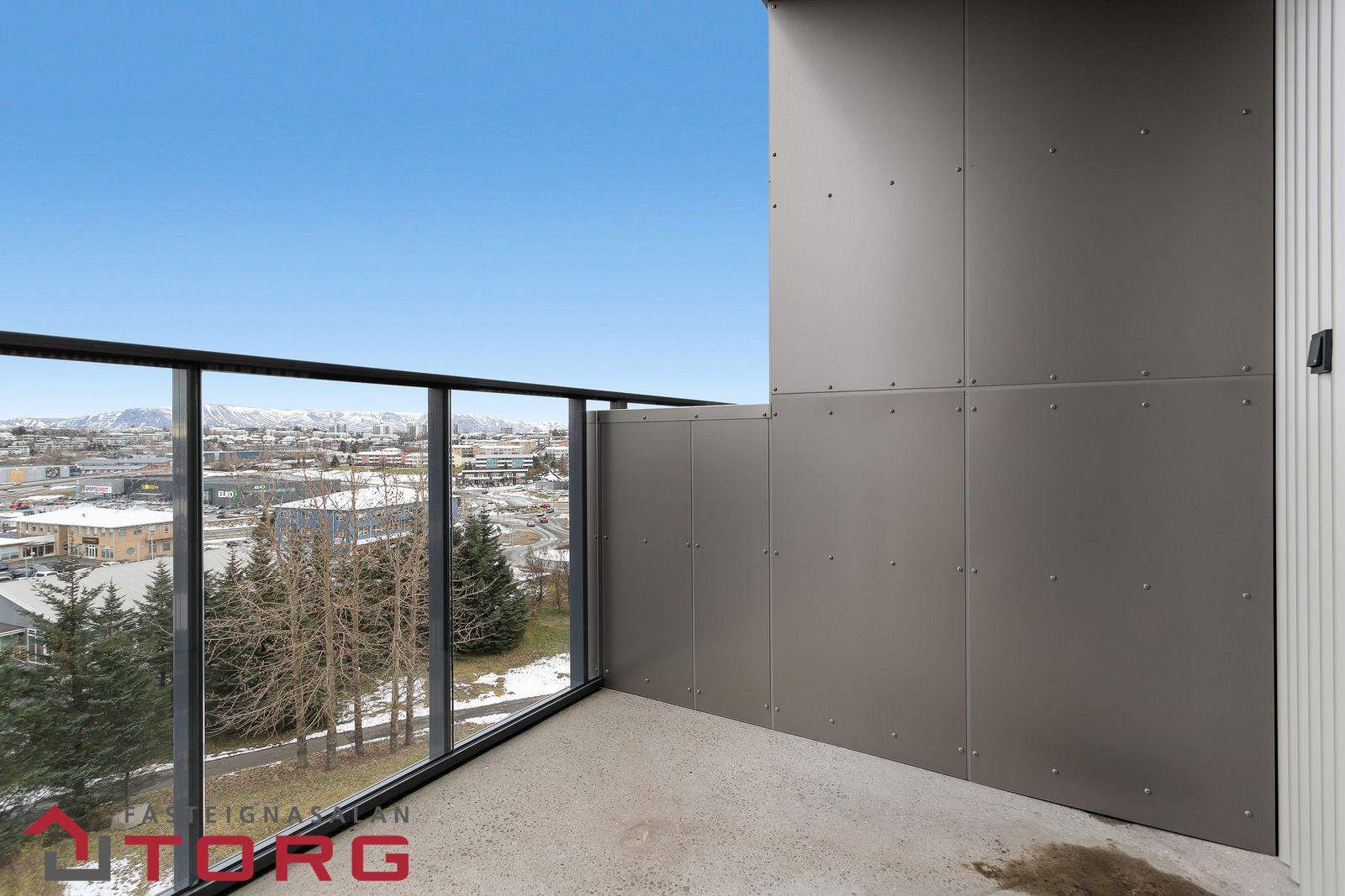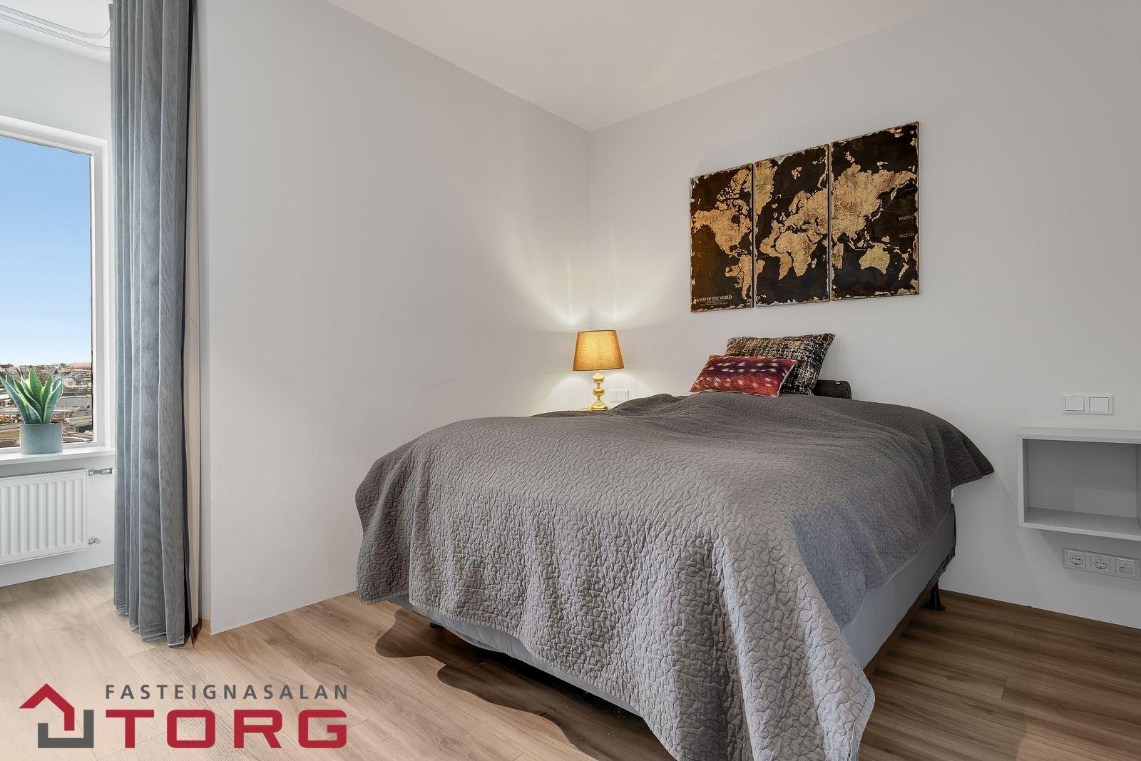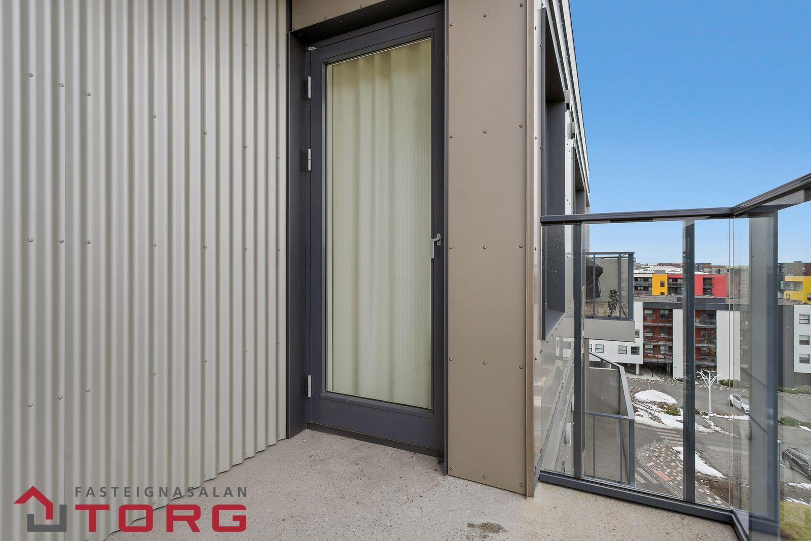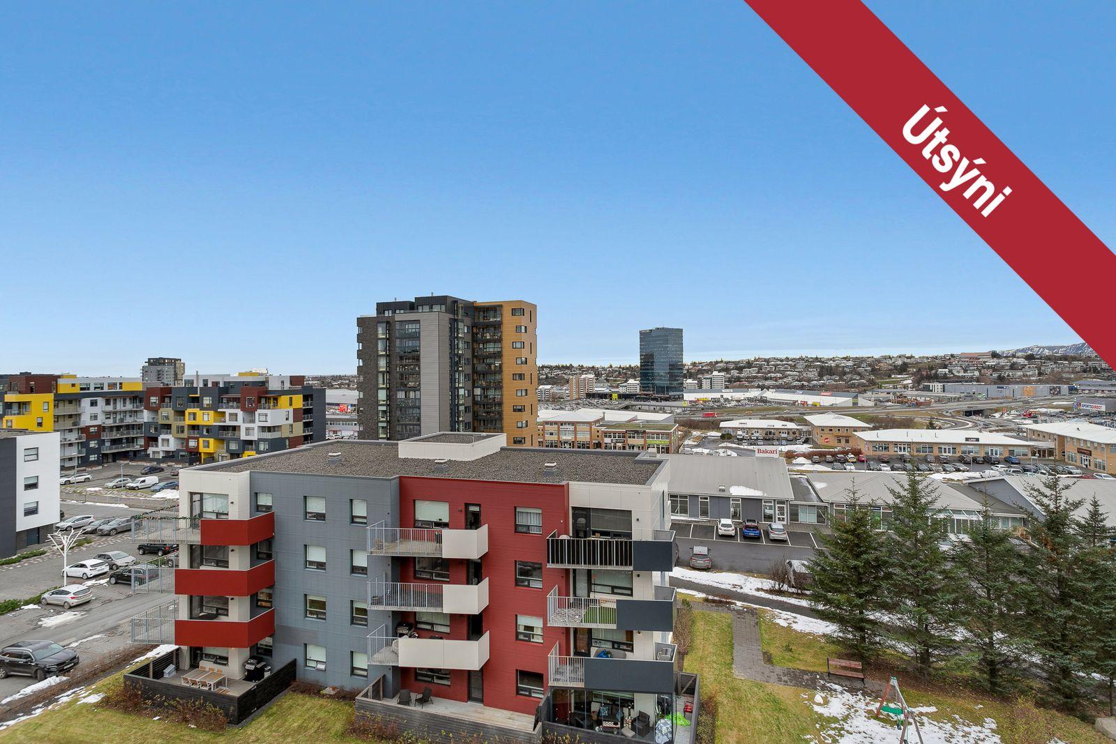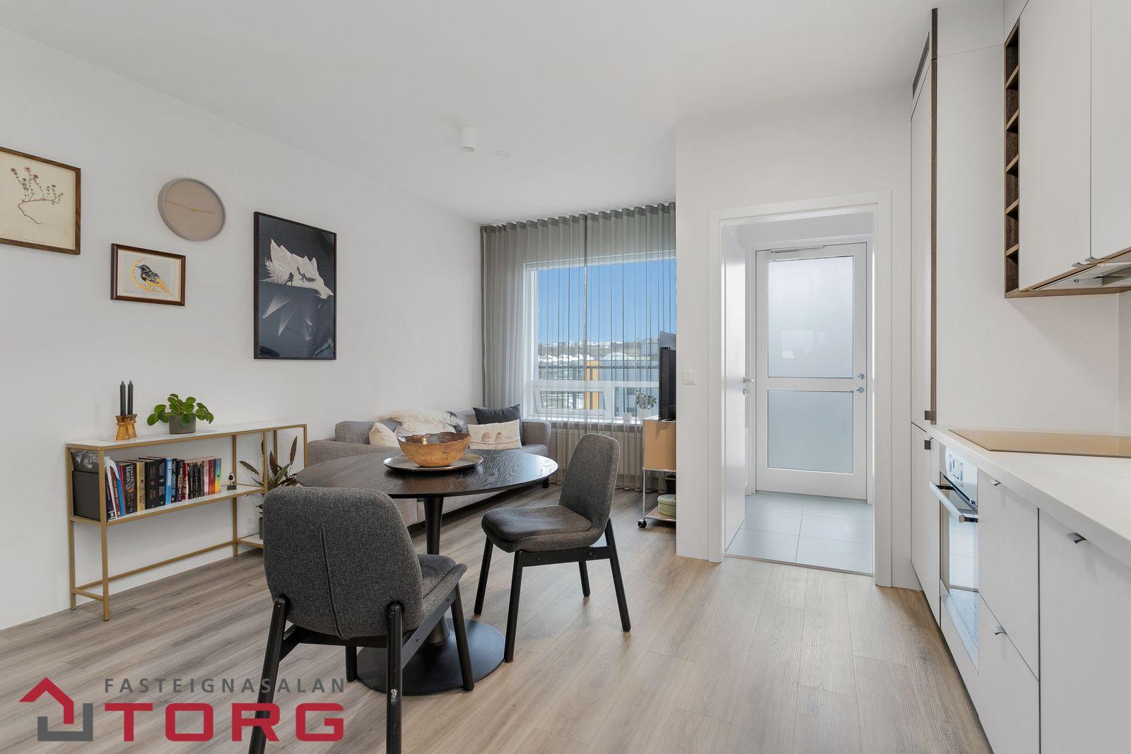 Nánari lýsing: Gengið er inn í íbúðina af sameiginlegum svalagangi til suðurs. Komið er inn í 2,7 forstofu með fataskáp. Þaðan er gengið inn í 19 fm alrými sem rúmar eldhús, borðstofu og setustofu. Eldhúsið er með fallegri ljósri innréttingu með innbyggðum ísskáp, bakaraofni, helluborði og viftu. Baðherbergið er 3,8 fm með walk in sturtu, upphengdu salerni og fallegri innréttingu með handlaug. Fyrir framan baðherbergið eru djúpir og rúmgóðir geymsluskápar en þar er gert ráð fyrir þvottavél og þurrkara. Svefnherbergið er 14,2 fm, með innbyggðum fataskápum og virkilega fallegu útsýni. Útgengt er frá svefnherbergi út á 4,5 fm svalir með virkilega fallegu útsýni til norðurs. Bílastæði fylgir íbúðinni í lokaðri bílageymslu. Lyfta er í húsinu.