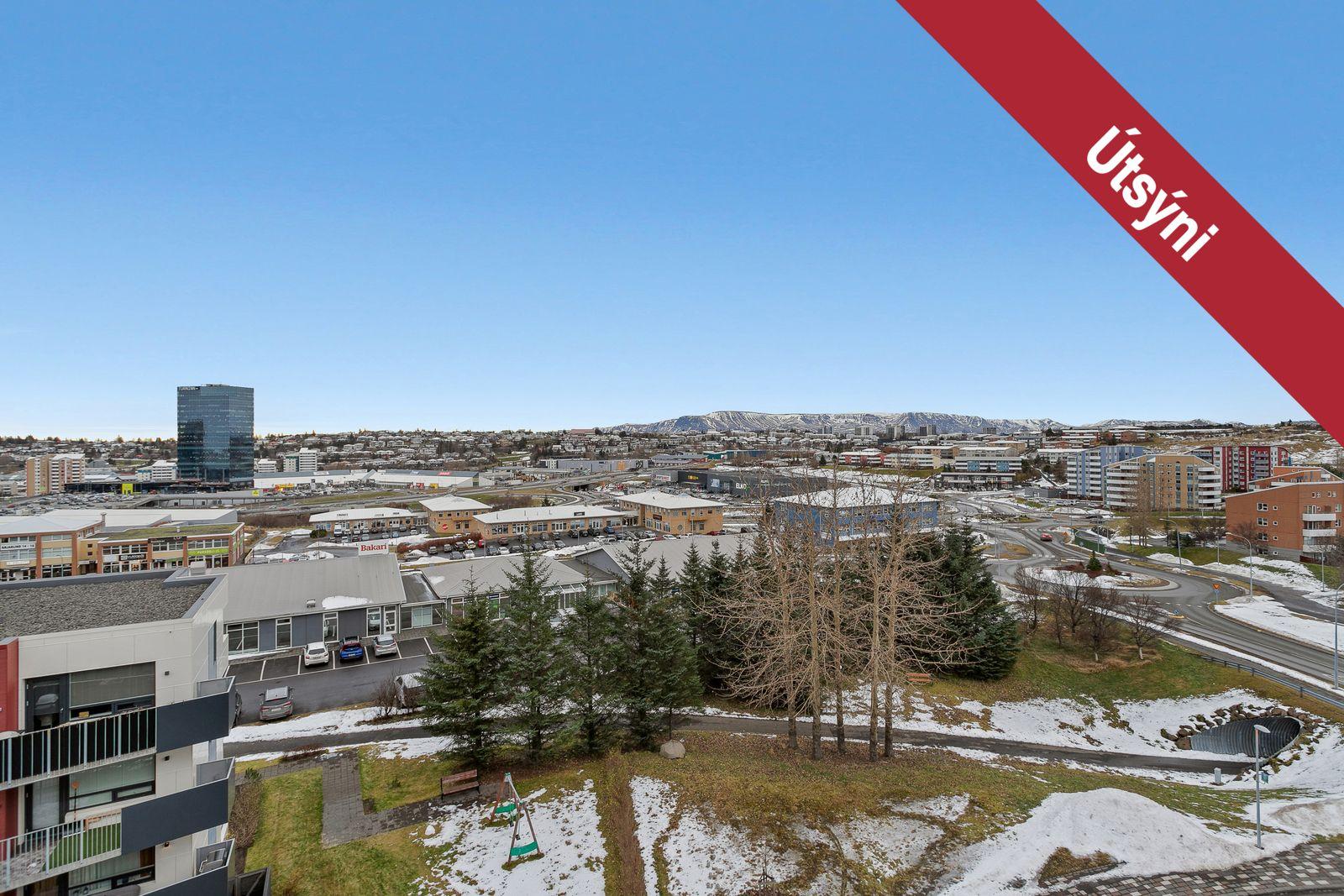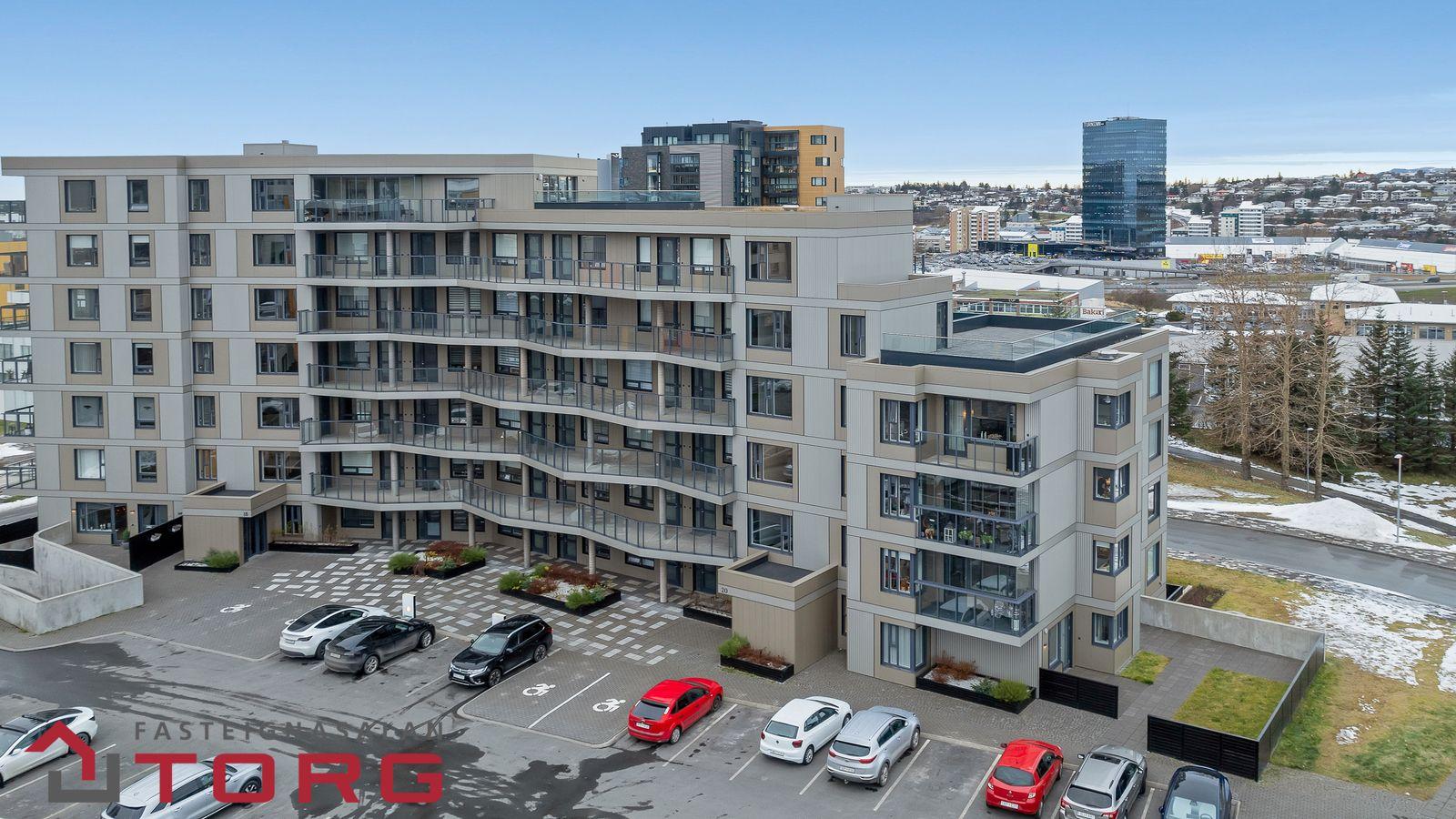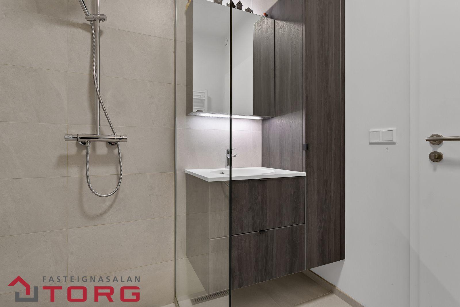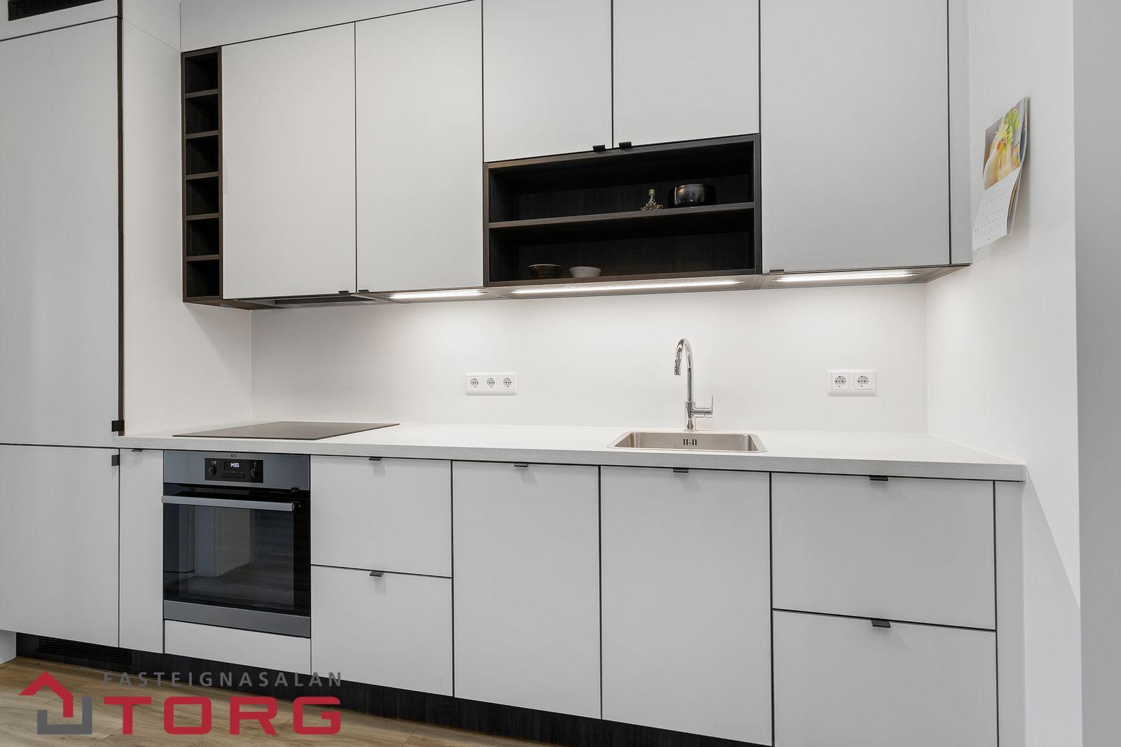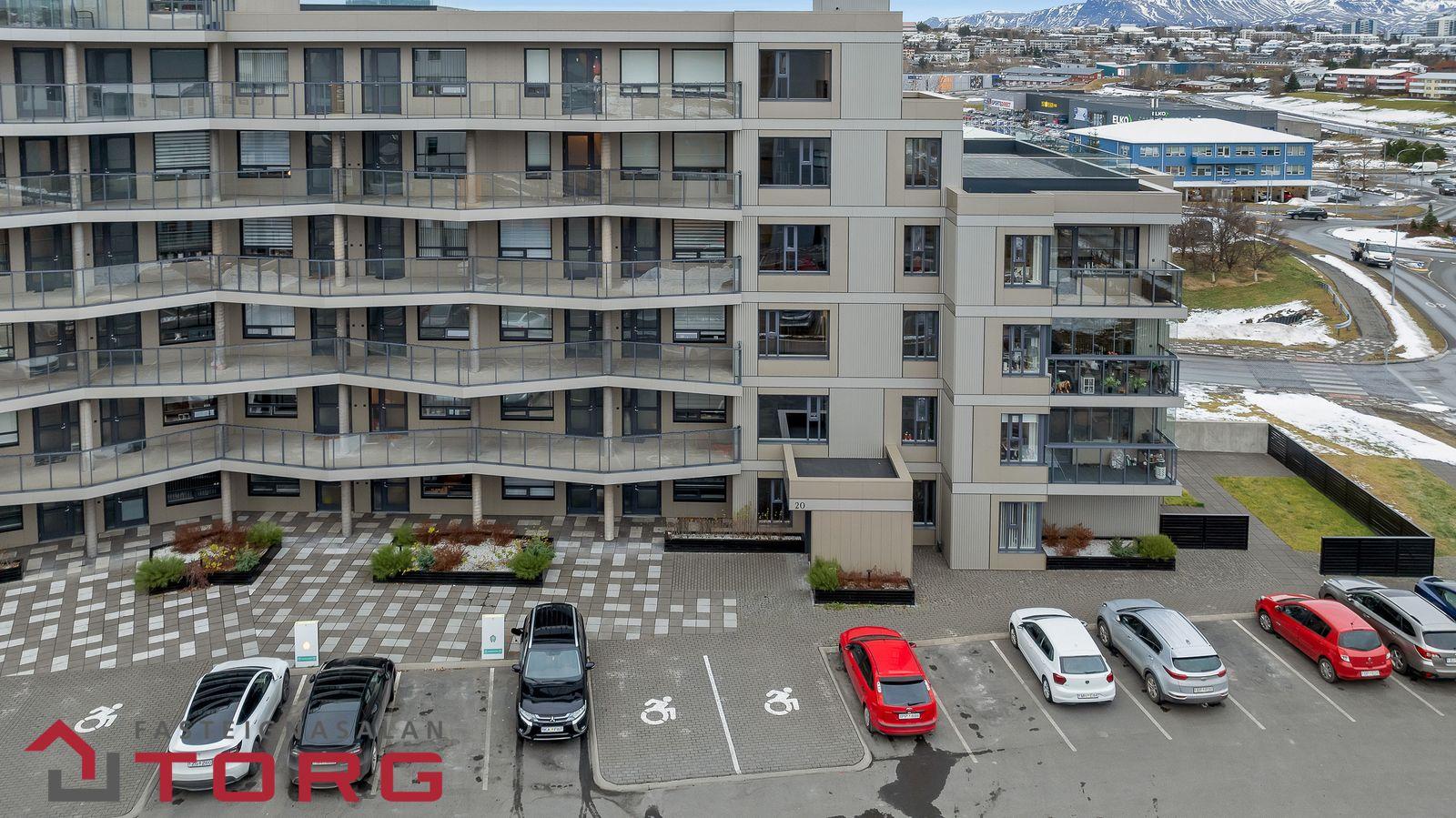 Nánari lýsing: Gengið er inn í íbúðina af sameiginlegum svalagangi til suðurs. Komið er inn í 2,7 forstofu með fataskáp. Þaðan er gengið inn í 19 fm alrými sem rúmar eldhús, borðstofu og setustofu. Eldhúsið er með fallegri ljósri innréttingu með innbyggðum ísskáp, bakaraofni, helluborði og viftu. Baðherbergið er 3,8 fm með walk in sturtu, upphengdu salerni og fallegri innréttingu með handlaug. Fyrir framan baðherbergið eru djúpir og rúmgóðir geymsluskápar en þar er gert ráð fyrir þvottavél og þurrkara. Svefnherbergið er 14,2 fm, með innbyggðum fataskápum og virkilega fallegu útsýni. Útgengt er frá svefnherbergi út á 4,5 fm svalir með virkilega fallegu útsýni til norðurs. Bílastæði fylgir íbúðinni í lokaðri bílageymslu. Lyfta er í húsinu.