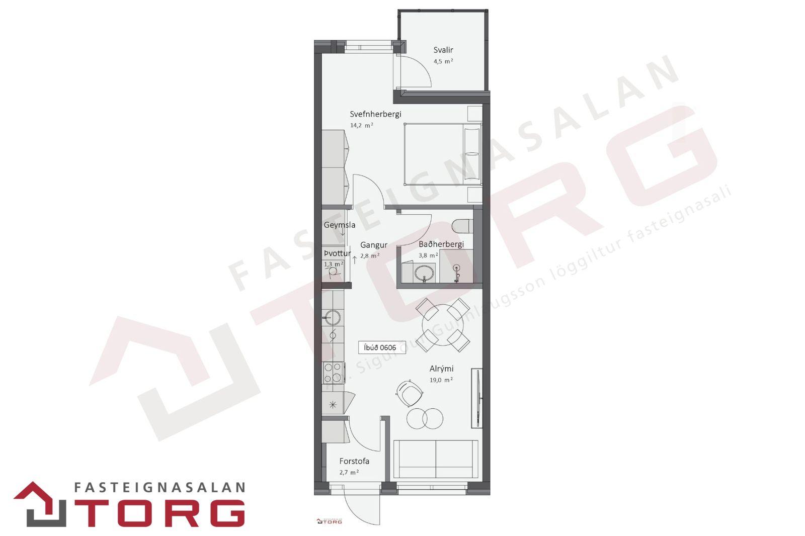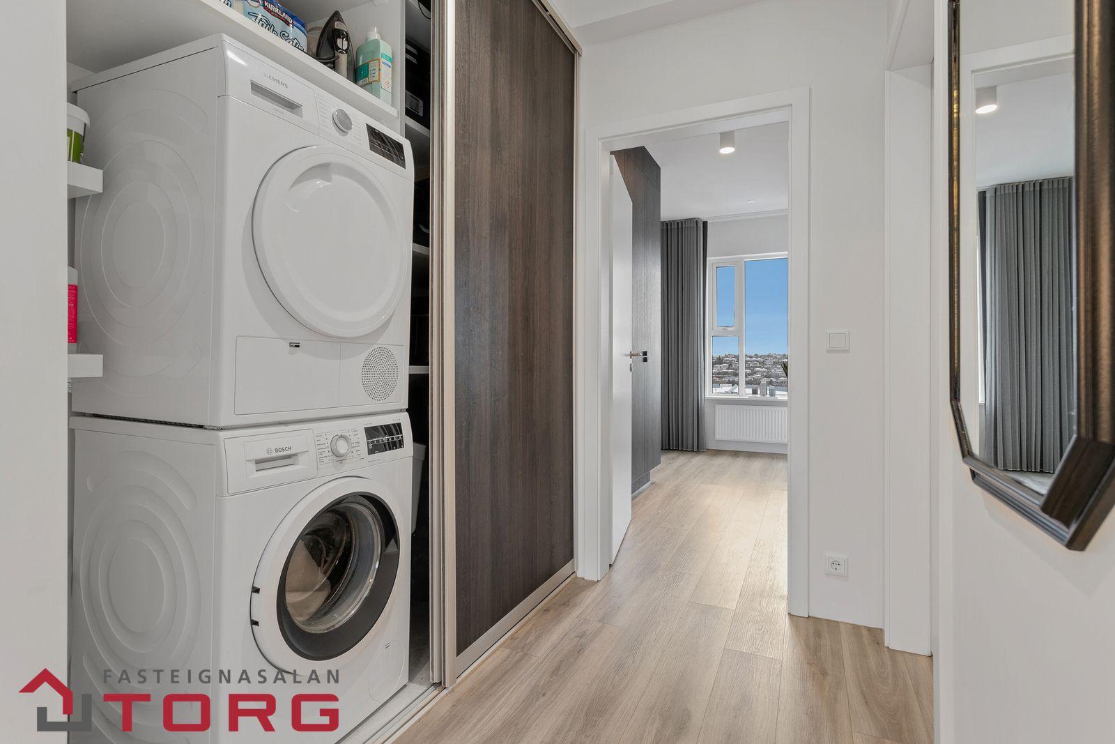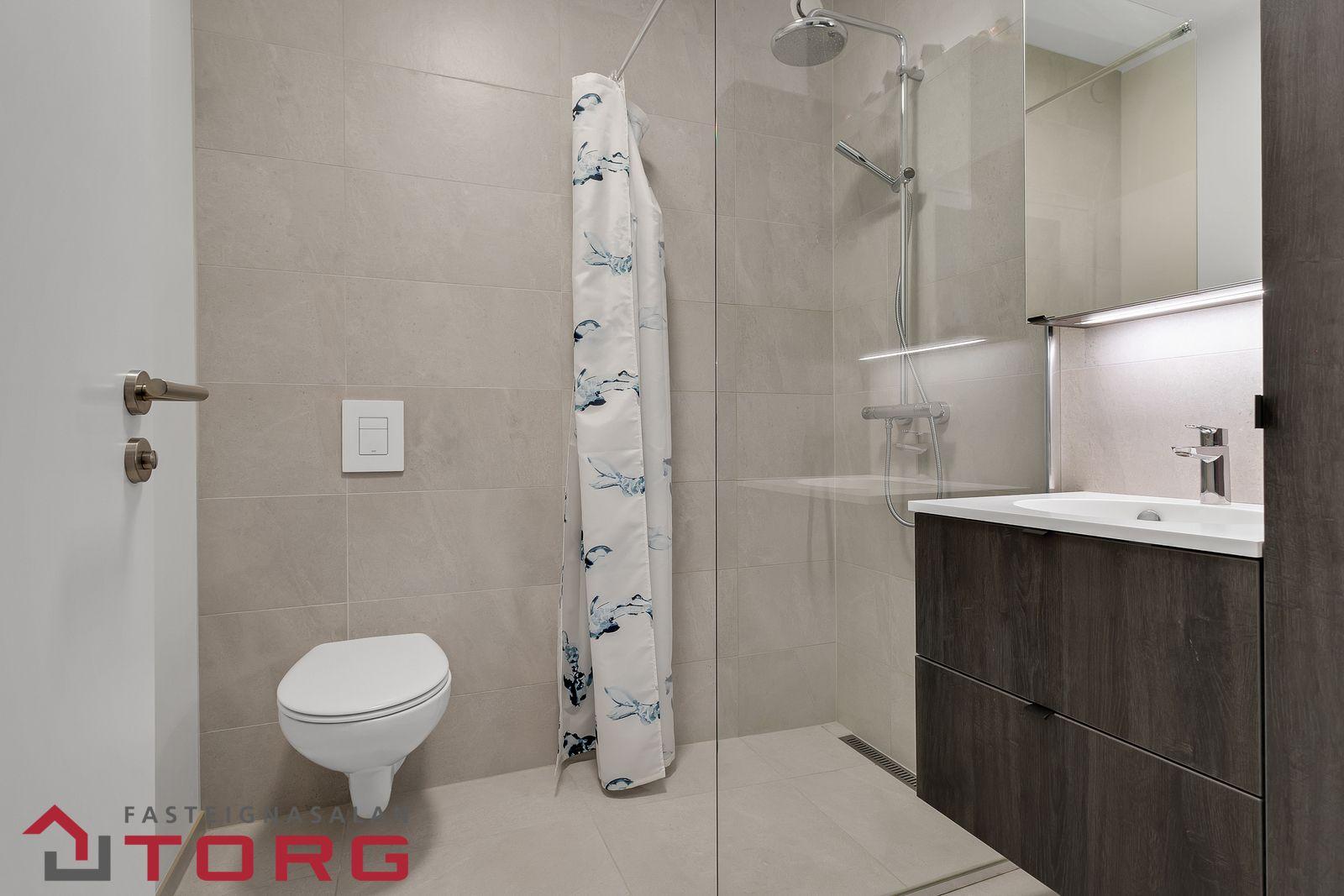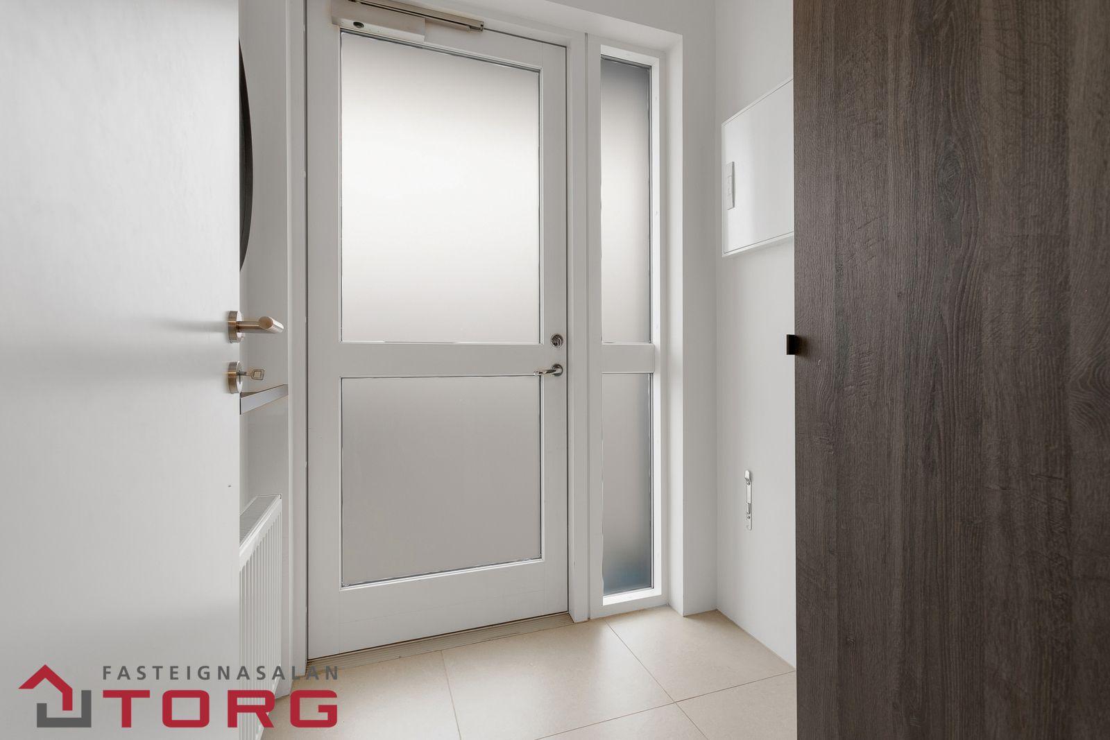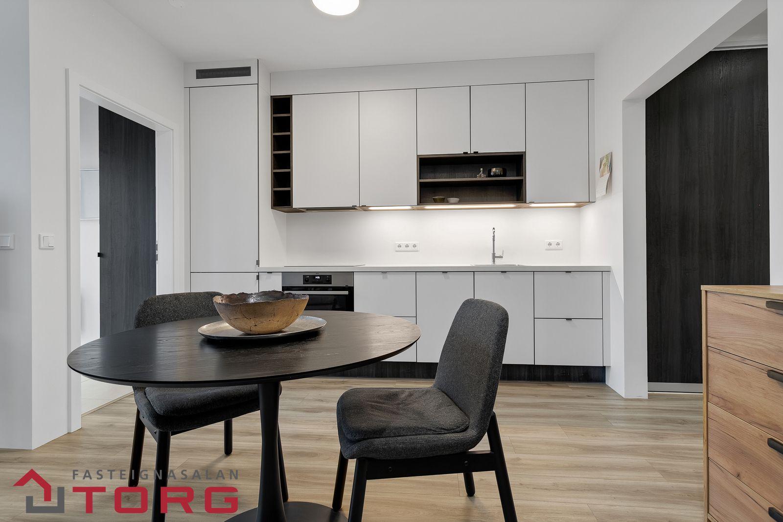 Nánari lýsing: Gengið er inn í íbúðina af sameiginlegum svalagangi til suðurs. Komið er inn í 2,7 forstofu með fataskáp. Þaðan er gengið inn í 19 fm alrými sem rúmar eldhús, borðstofu og setustofu. Eldhúsið er með fallegri ljósri innréttingu með innbyggðum ísskáp, bakaraofni, helluborði og viftu. Baðherbergið er 3,8 fm með walk in sturtu, upphengdu salerni og fallegri innréttingu með handlaug. Fyrir framan baðherbergið eru djúpir og rúmgóðir geymsluskápar en þar er gert ráð fyrir þvottavél og þurrkara. Svefnherbergið er 14,2 fm, með innbyggðum fataskápum og virkilega fallegu útsýni. Útgengt er frá svefnherbergi út á 4,5 fm svalir með virkilega fallegu útsýni til norðurs. Bílastæði fylgir íbúðinni í lokaðri bílageymslu. Lyfta er í húsinu.
