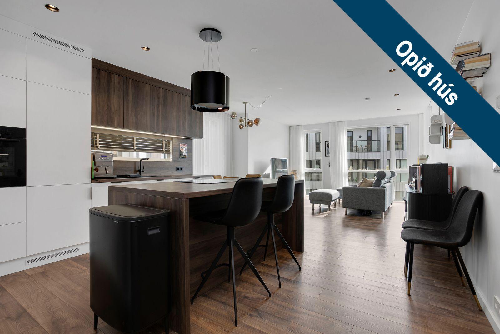 Komið er inn í anddyri, og þaðan í stórt opið og bjart rými þar sem er glæsilegt eldhús, stofa og borðstofa.