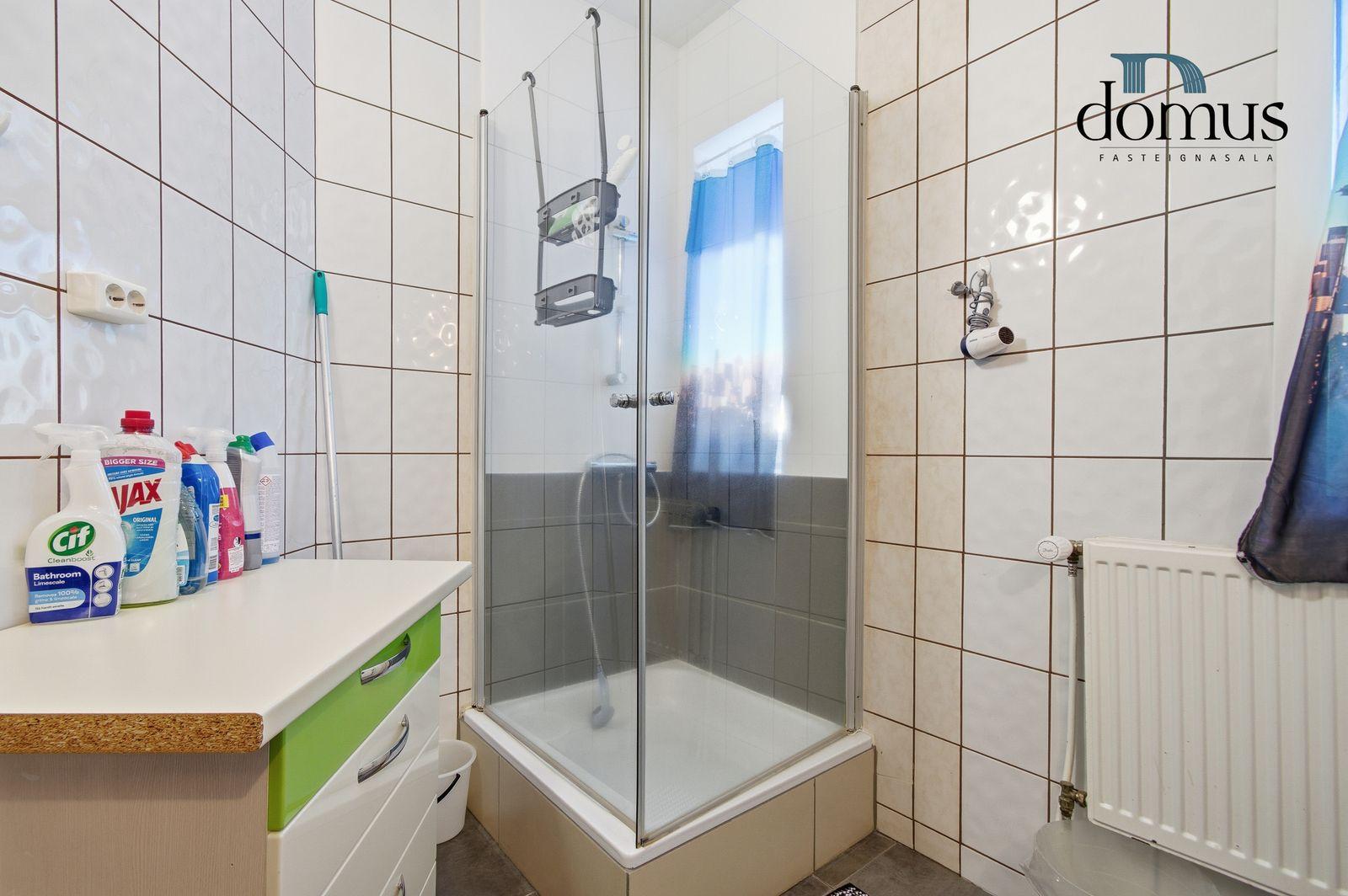 Baðherbergi: Flísar á gólfi og hluta veggja, sturtuklefi, baðinnrétting með neðri skáp og salerni.