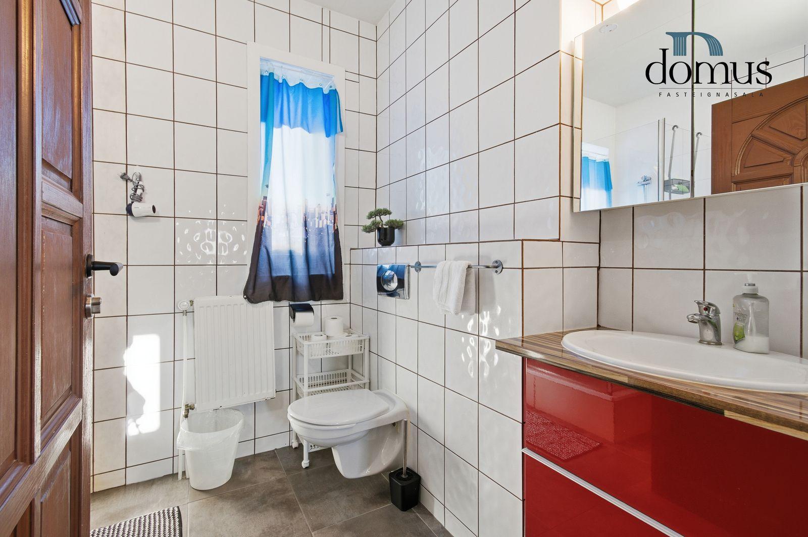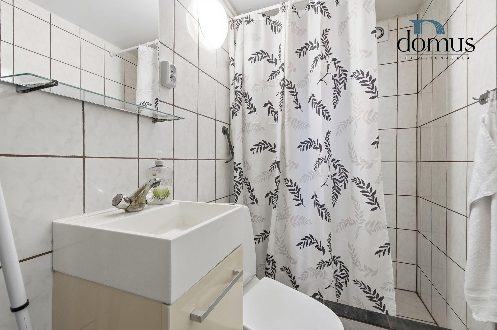Baðherbergi: Flísar á gólfi og veggjum, sturtuklefi, baðinnrétting með efri skáp, upphengt salerni og aðstaða fyrir þvottavél.