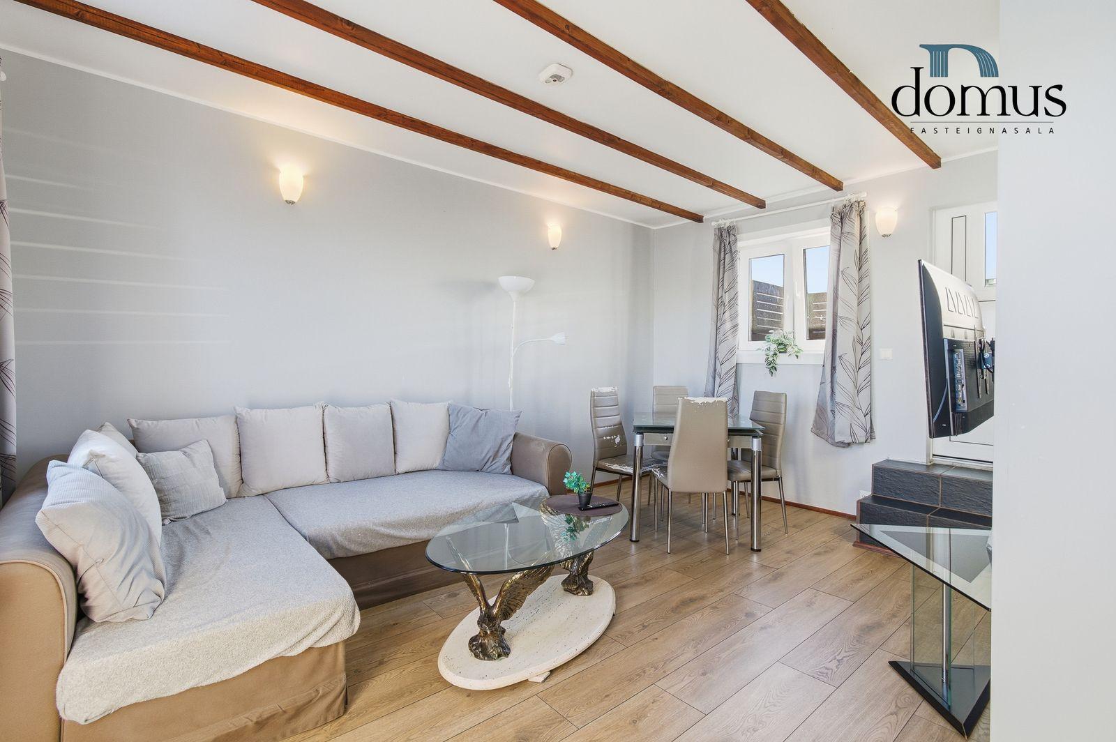 Stofa / Borðstofa: Í samliggjandi rými með parketi á gólfi. Frá stofunni er útgengt á verönd sem snýr að garði.