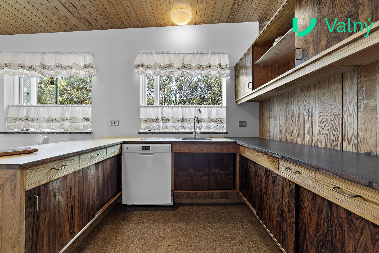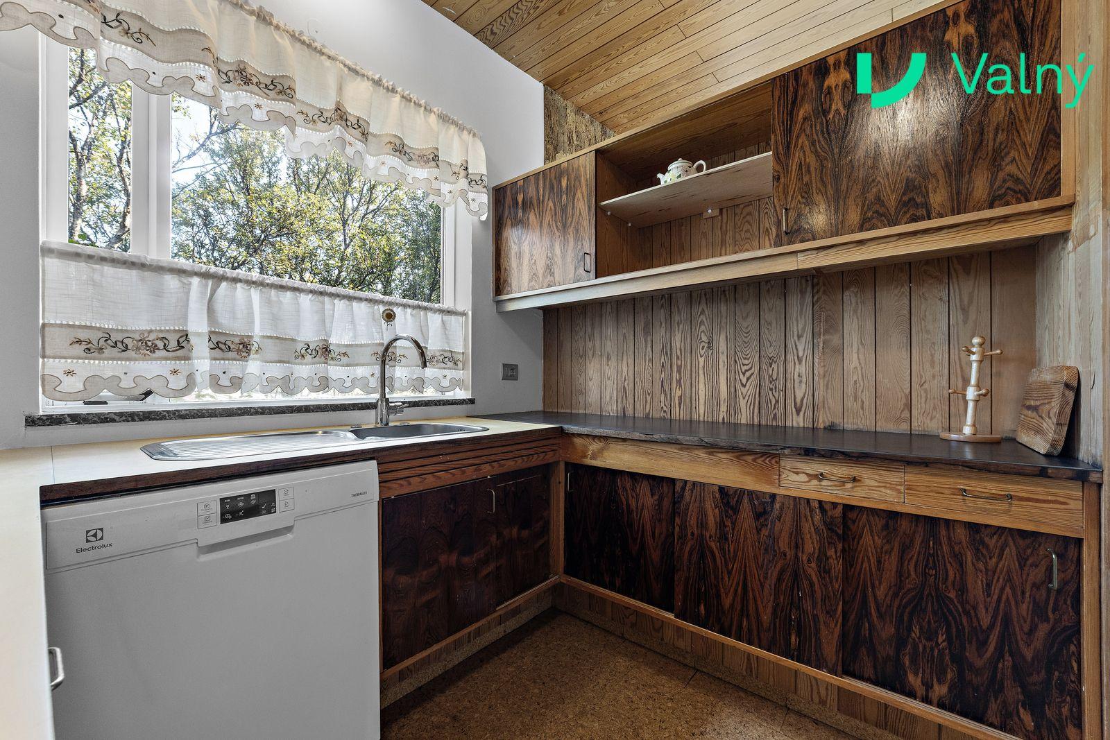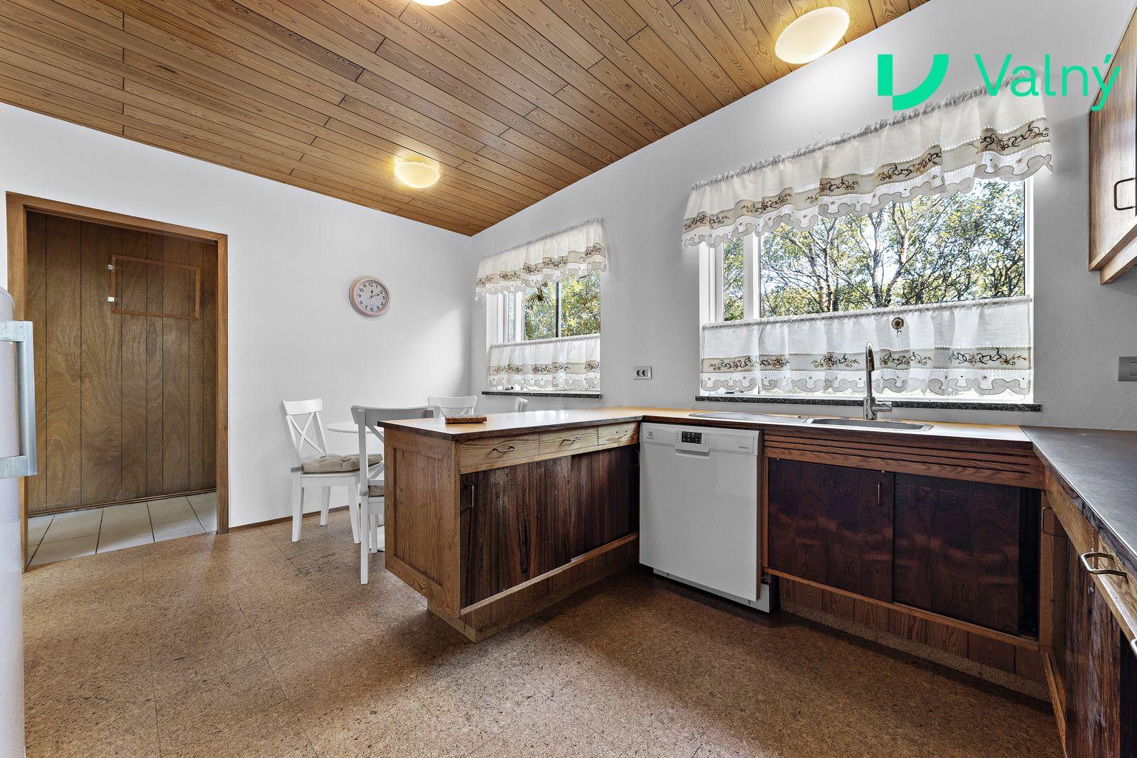 Eldhús með upprunalegri U-laga innréttingu. Gott skápa- og skúffupláss. Korkur á golfi og panill í lofti. Uppvöskunarvél og ísskápur fylgja.