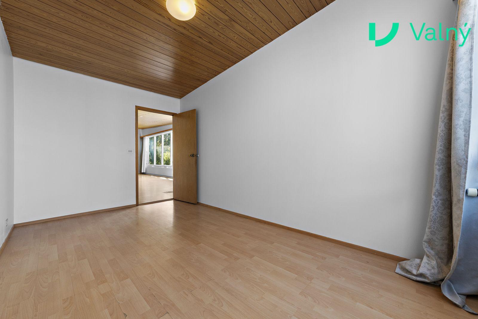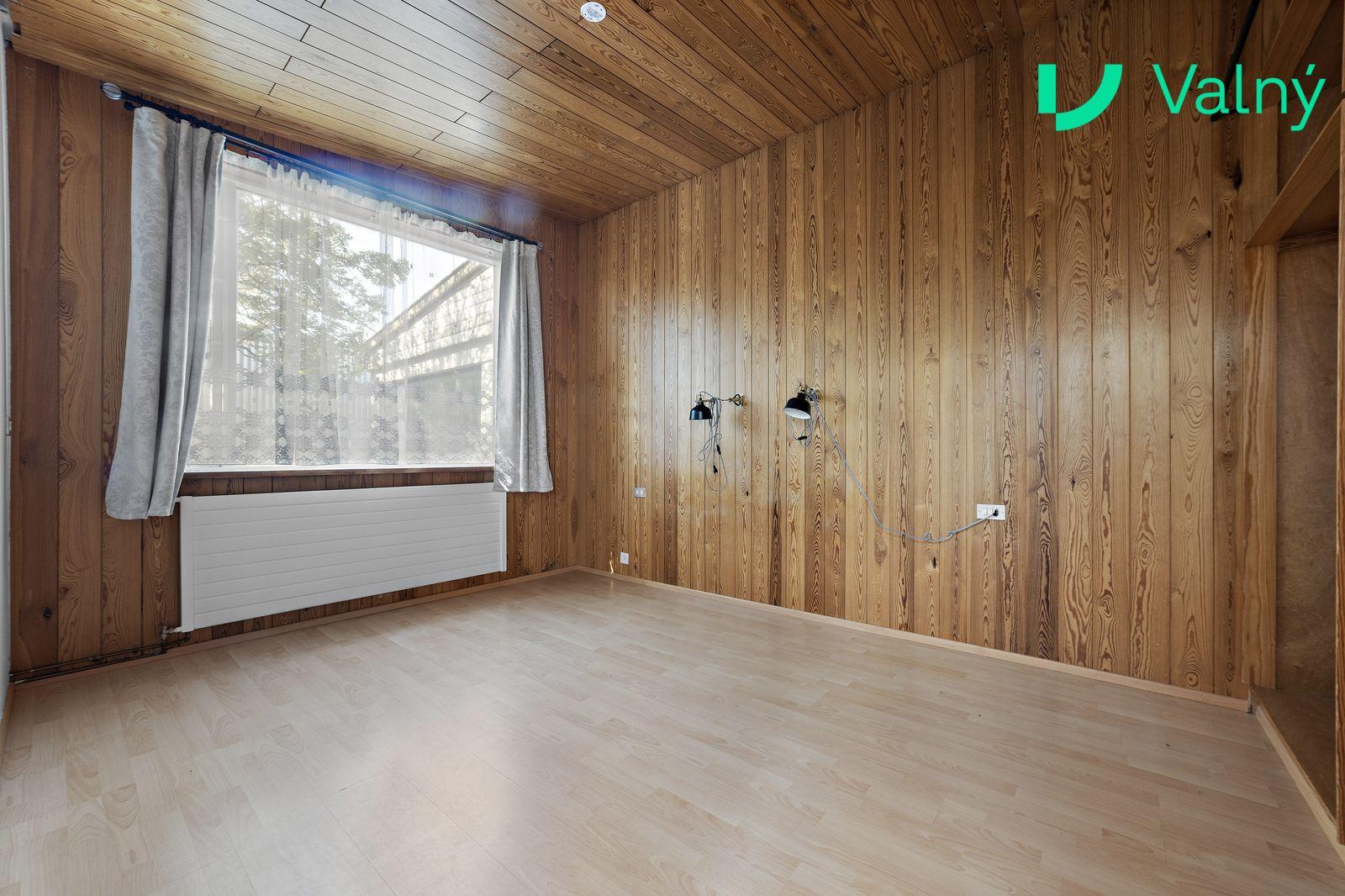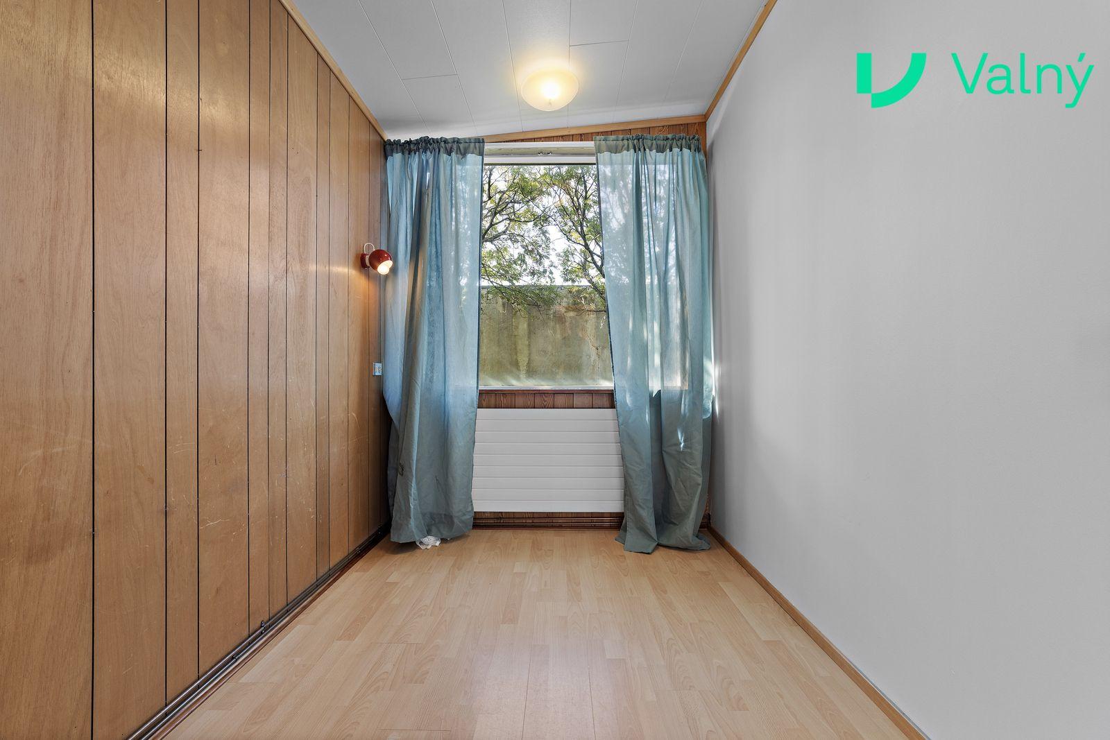 Hjónaherbergi með fataskáp og harðparketi. Panill á veggjum og lofti.
