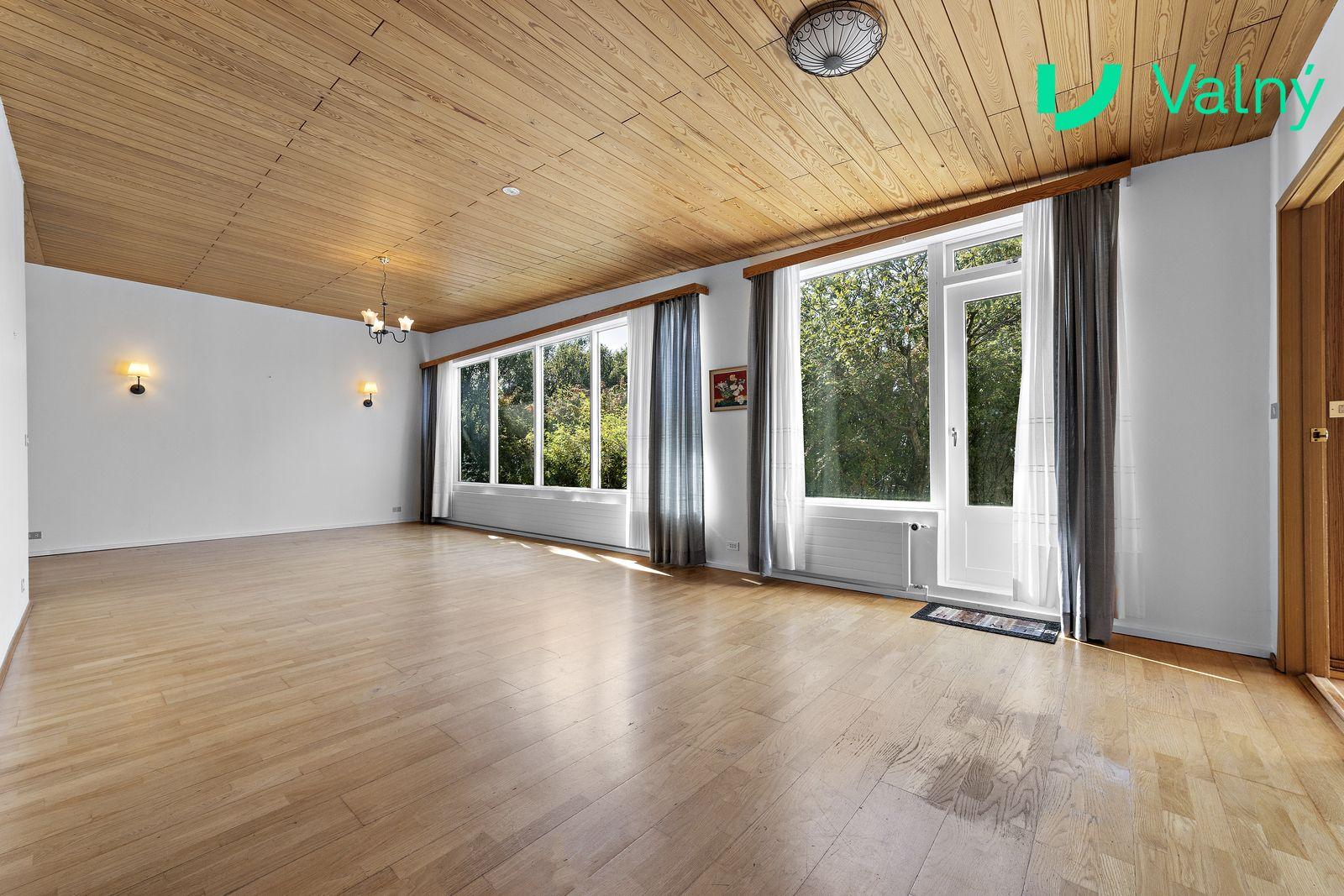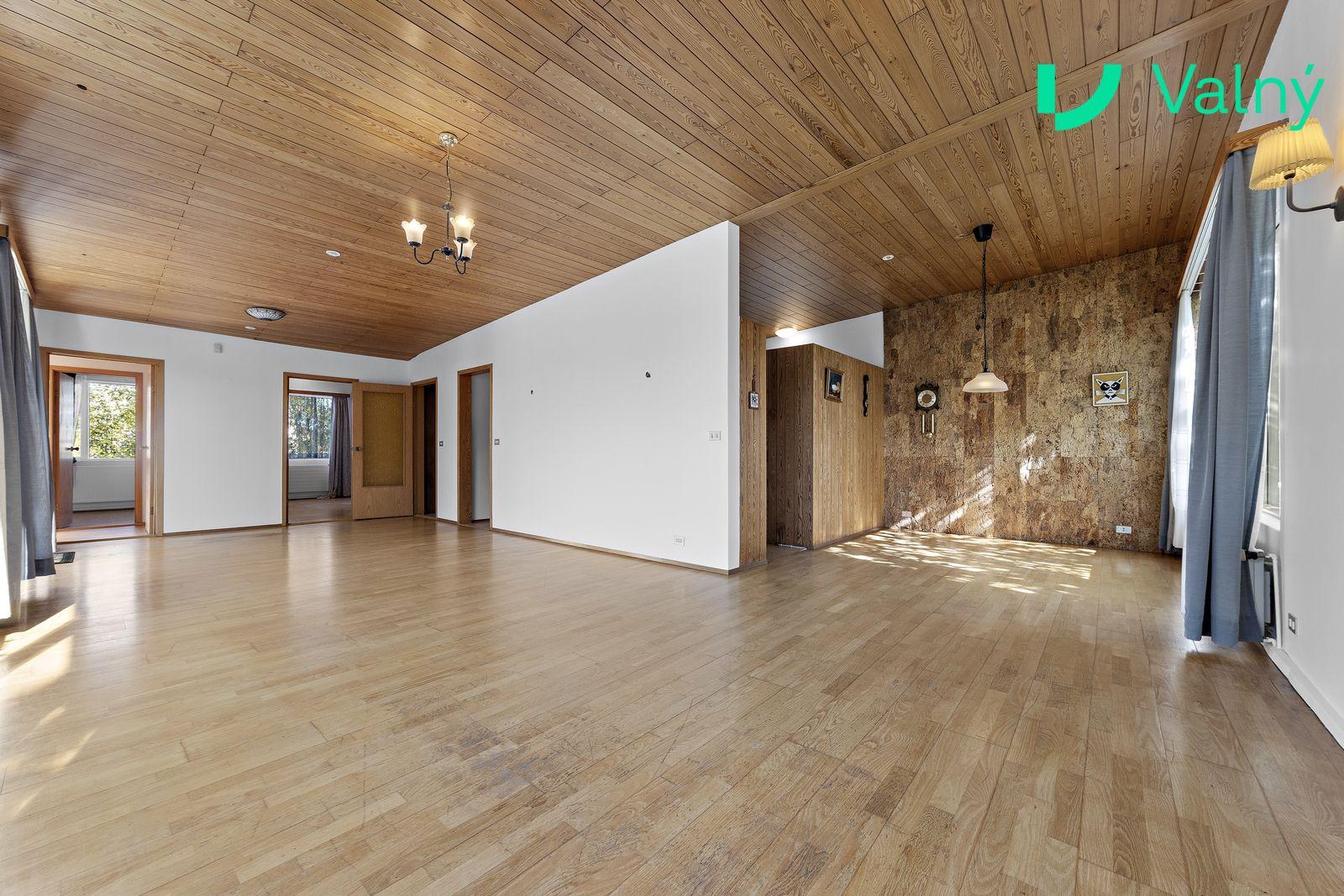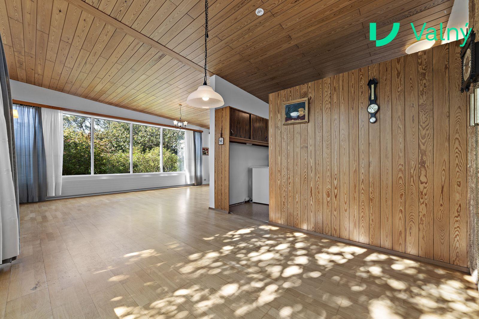 Stofa og borðstofa er með stórum gluggum. Útgengt á verönd frá stofu. Viðarparket á gólfi og panill í lofti.