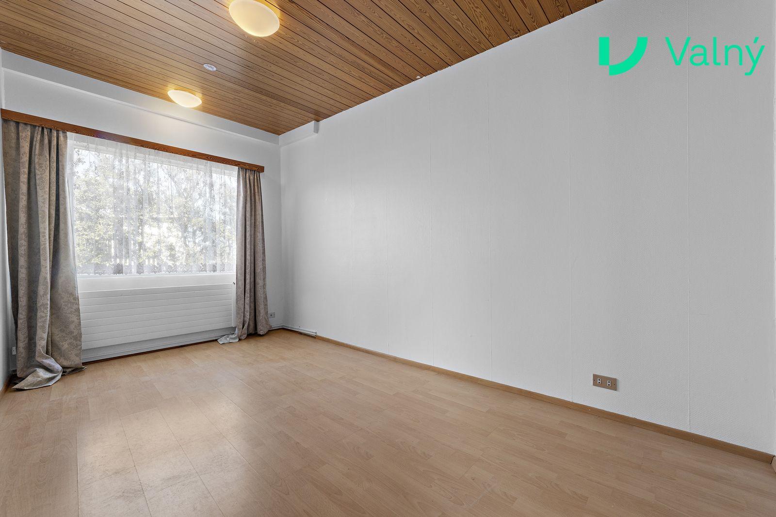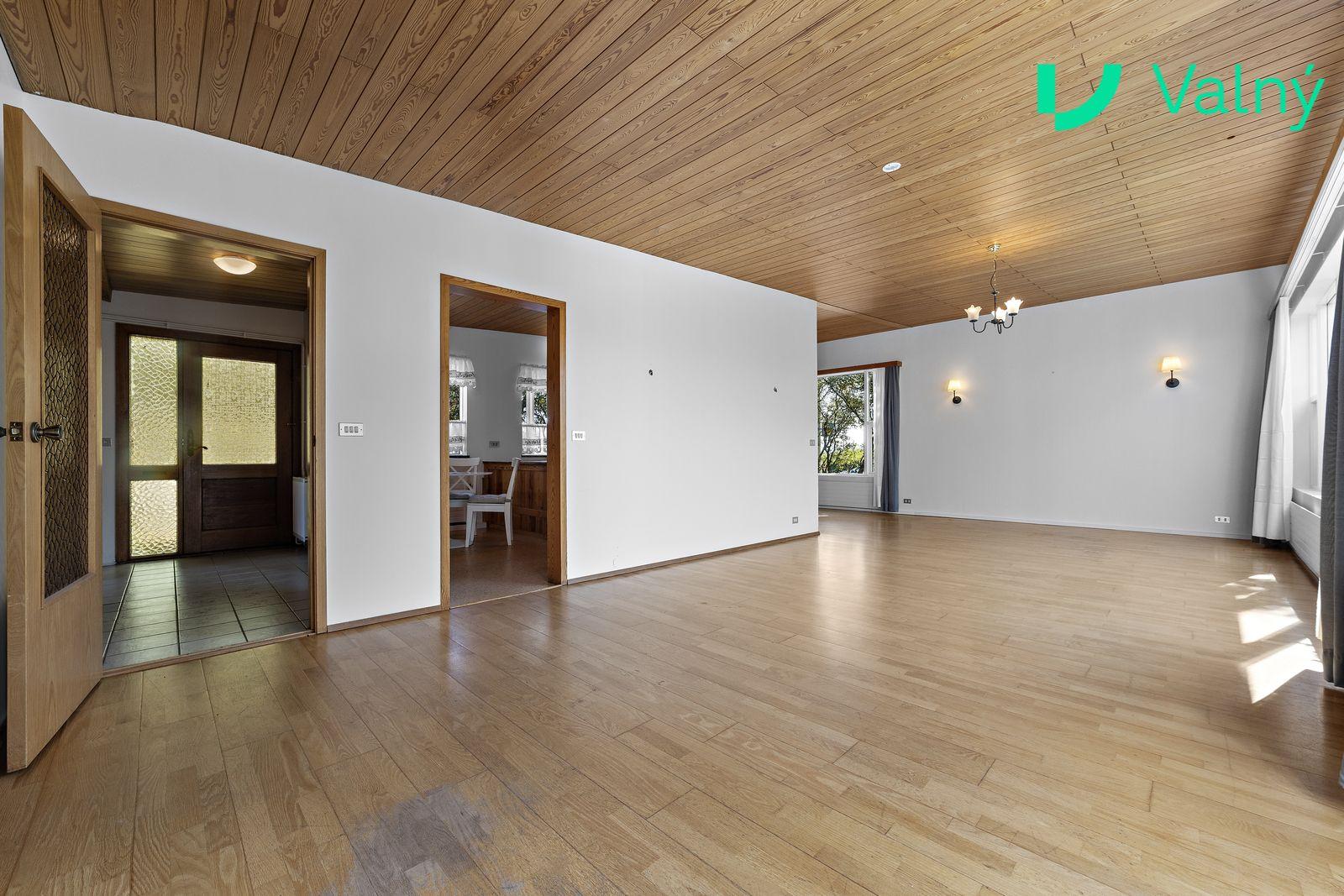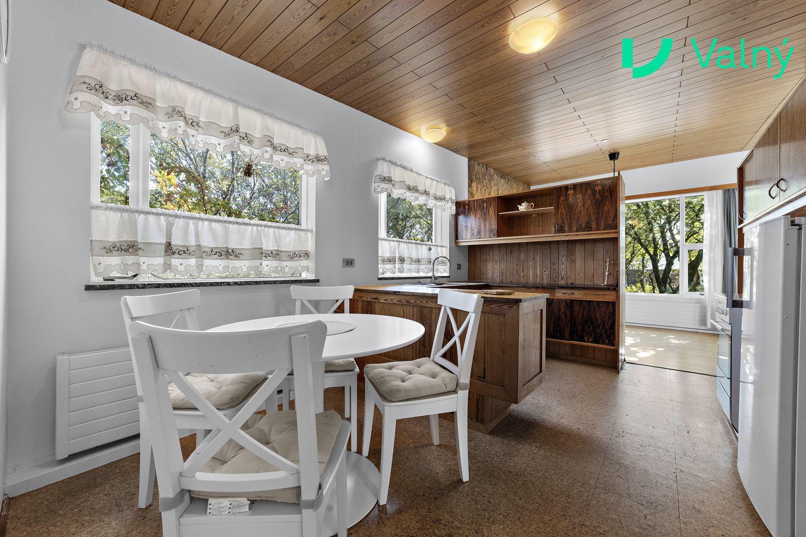 Stofa og borðstofa er með stórum gluggum. Útgengt á verönd frá stofu. Viðarparket á gólfi og panill í lofti.