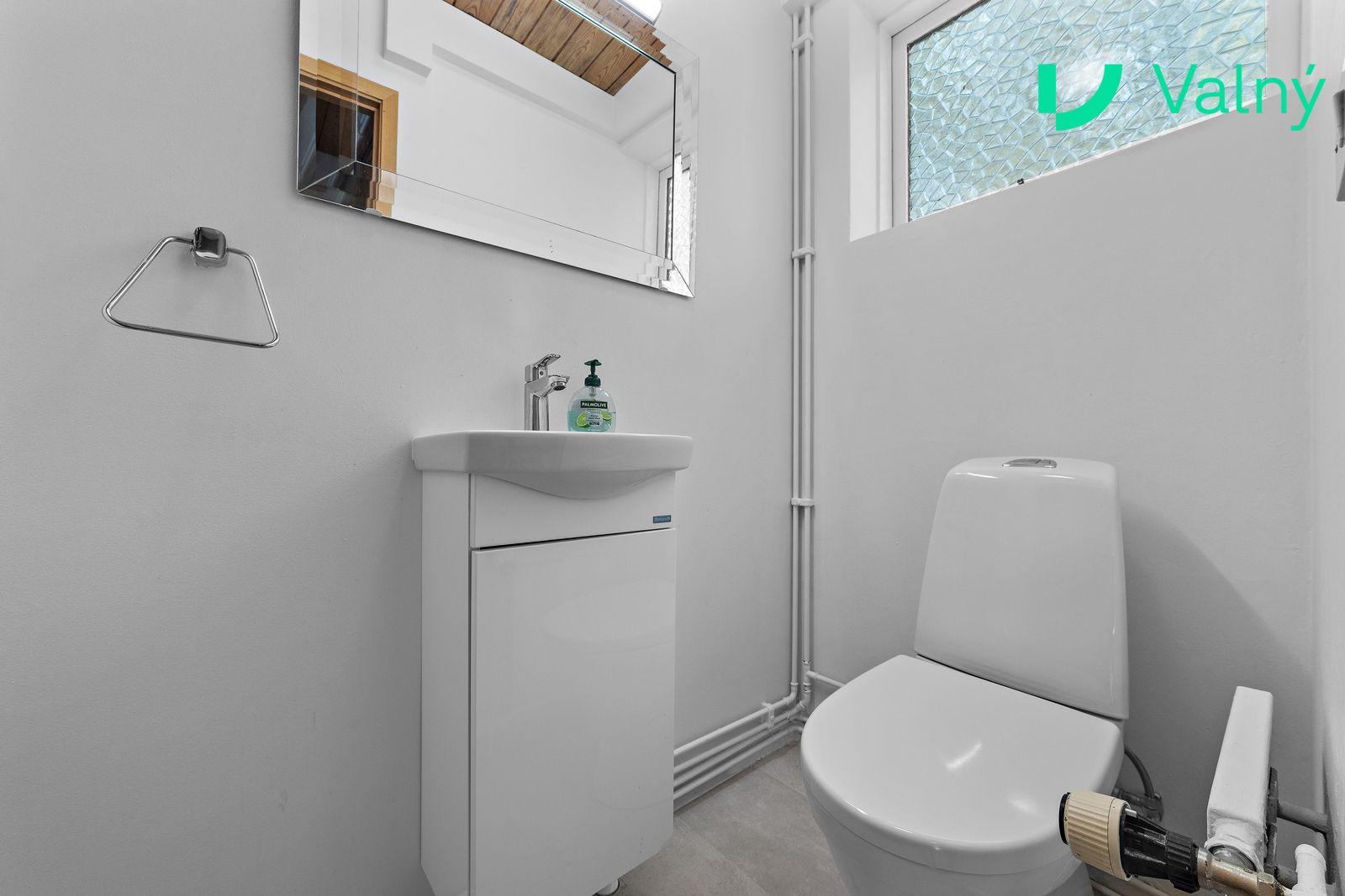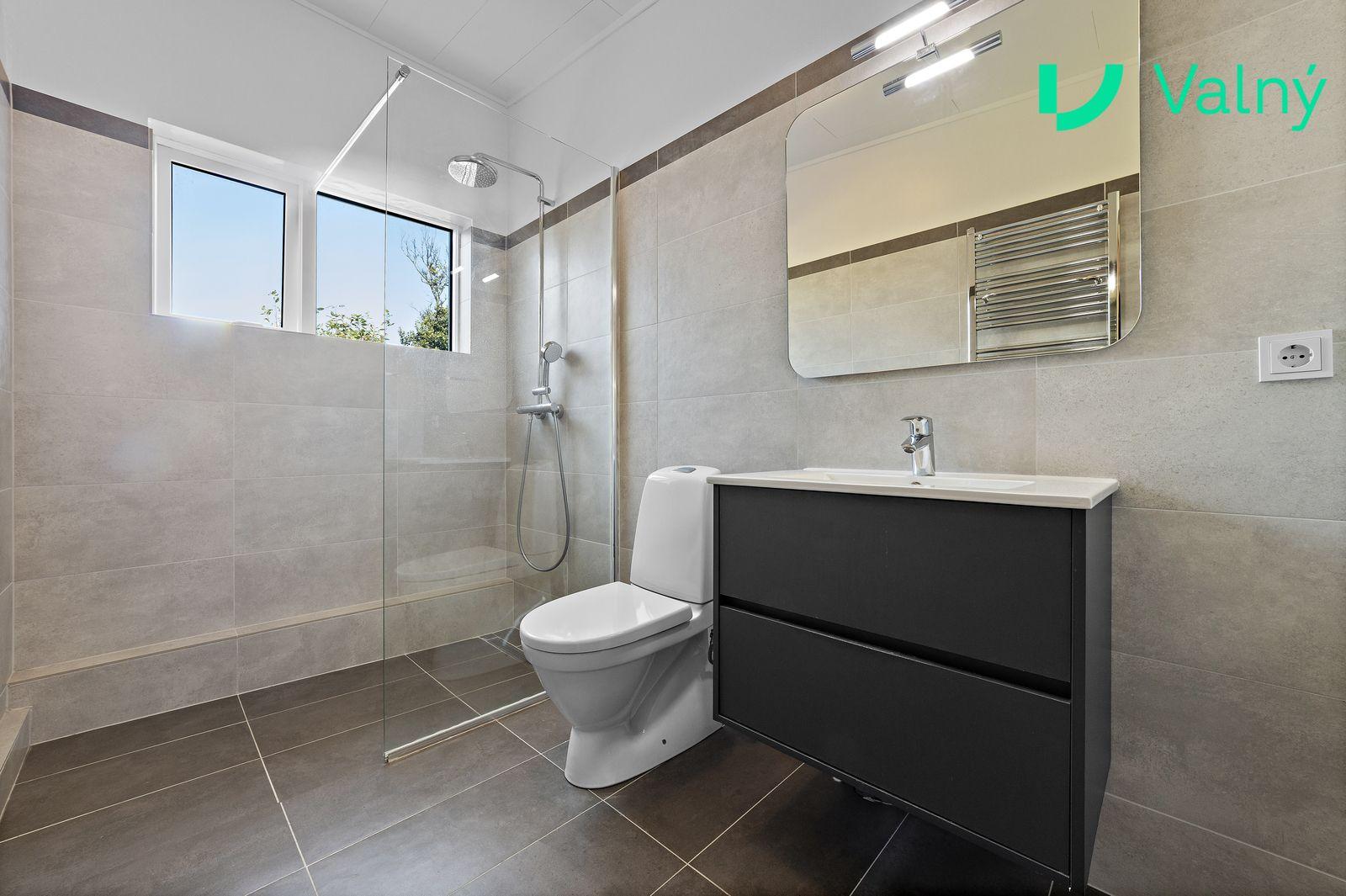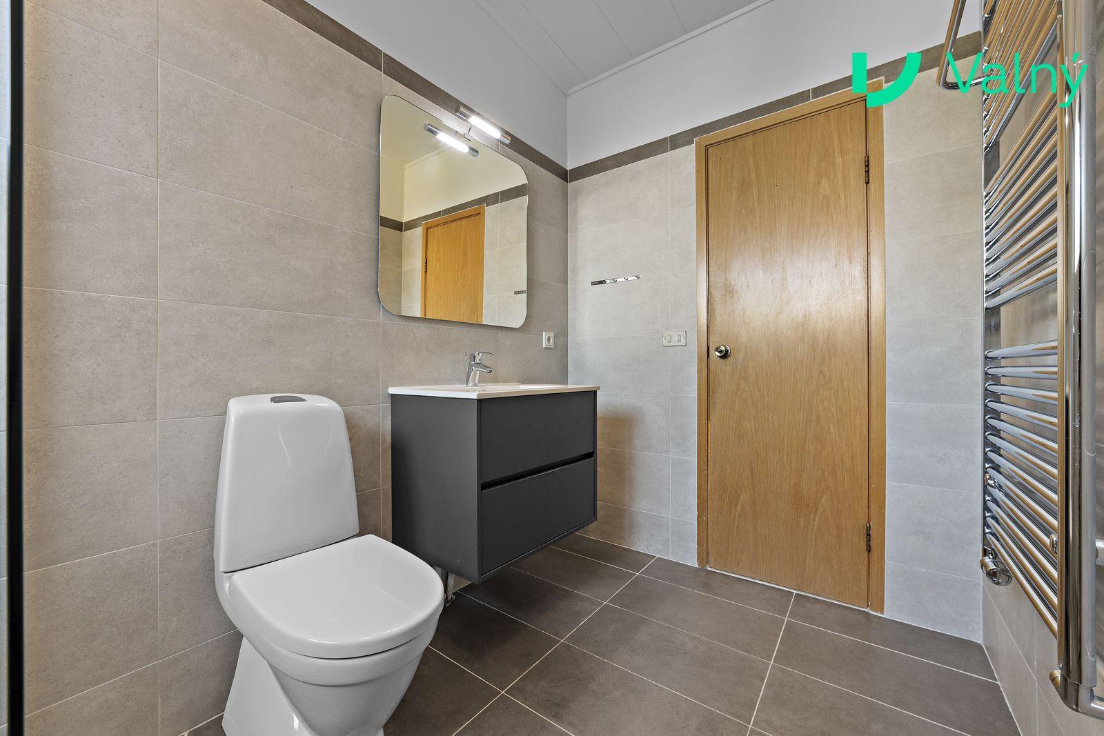Baðherbergi flísalagt í hólf og gólf, með sturtu, salerni, handklæðaofni og innréttingu með skúffum. Baðherbergi var endurnýjað árið 2018.