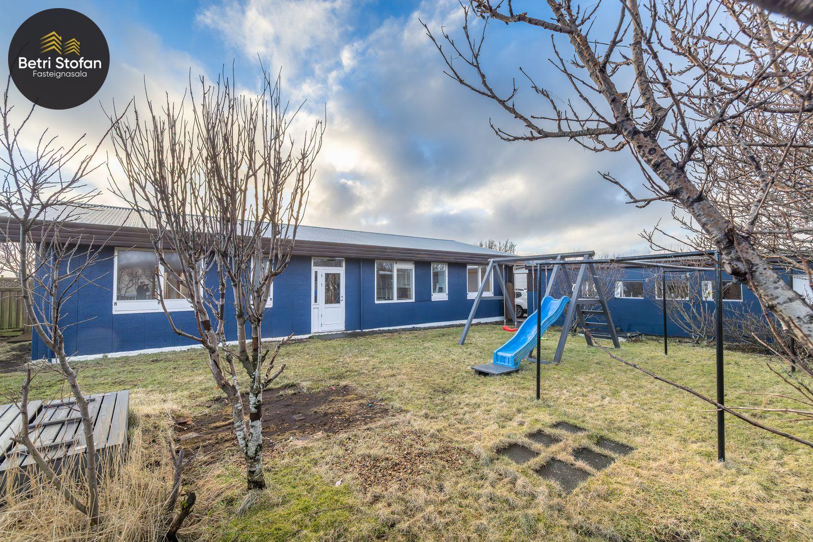 Gott og vel skipulagt steinsteypt einbýlishús á einni hæð með 4 rúmgóðum svefnherbergjum á stórri lóð með nægum bílastæðum á malbikaðri innkeyrslu ásamt bílskúr sem búið er að útbúa sem 2ja herbergja íbúð og er í útleigu.