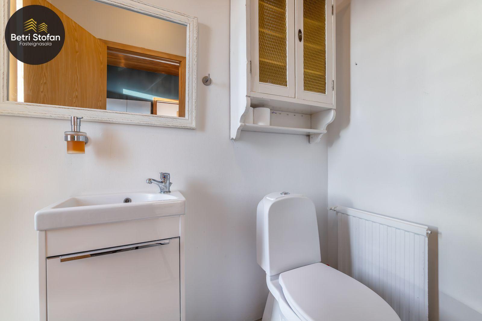 Gestasalerni: Innaf forstofu. Klósett, vaskur ofan á lítilli skápainnréttingu ásamt spegli fyrir ofan vask.
