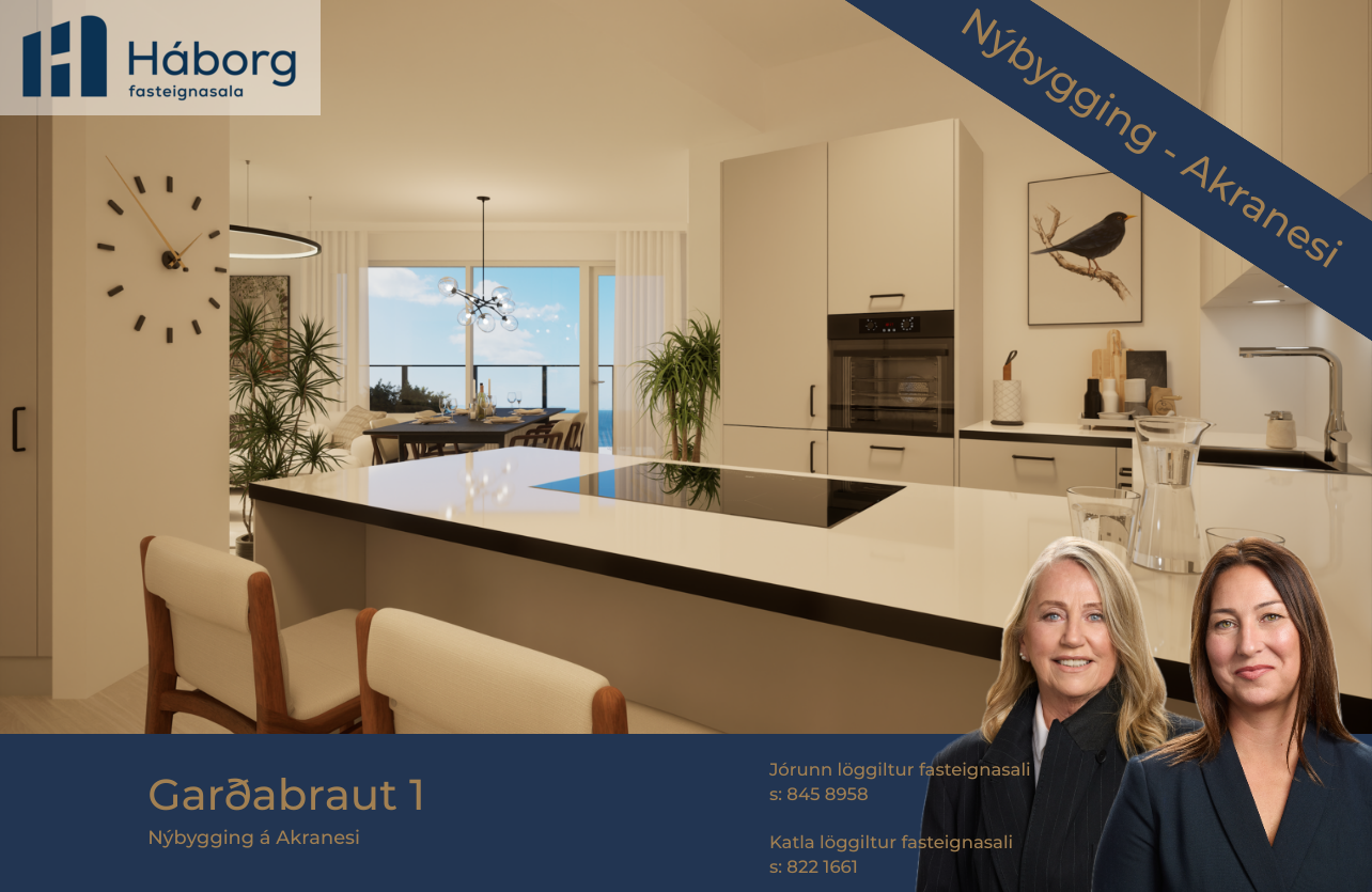 Heimasíða Garðabraut 1Allar upplýsingar um eignina veita: Katla Hanna Steed löggiltur fasteignasali í síma 822 1661 eða katla@haborg.is, Jórunn Skúladóttir löggiltur fasteignasali í síma 845 8958 eða jorunn@haborg.is og Kristín Rós Magnadóttir löggiltur fasteignasali í síma 860-2078 eða kristin@haborg.is. Almennt Fjölbýlishúsið að Garðabraut er staðsett í nýju og glæsilegu íbúðarhverfi á Akranesi.Tvö stigahús eru í byggingunni, hvort með lyftu og kjallara. Byggingin er 4 og 7 hæðir með samtals 50 íbúðum af mismunandi stærðum – tveggja, þriggja og fjögurra herbergja. Í kjallara er bílageymsla með merktum stæðum fyrir flestar íbúðir. Aðgengi að sérgeymslum, hjóla- og vagnageymslu, ásamt tæknirýmum. Aðalinngangur hússins er á 1. hæð. Flestar íbúðir eru með aukinni lofthæð og allar með svölum eða sérafnotareit. Úr mörgum íbúðum er fallegt útsýni og þakíbúðir bjóða upp á stórar þaksvalir með möguleika á rafmagnspotti. Flestum íbúðum fylgir stæði í bílakjallara og stærri íbúðum fylgja tvö stæði.