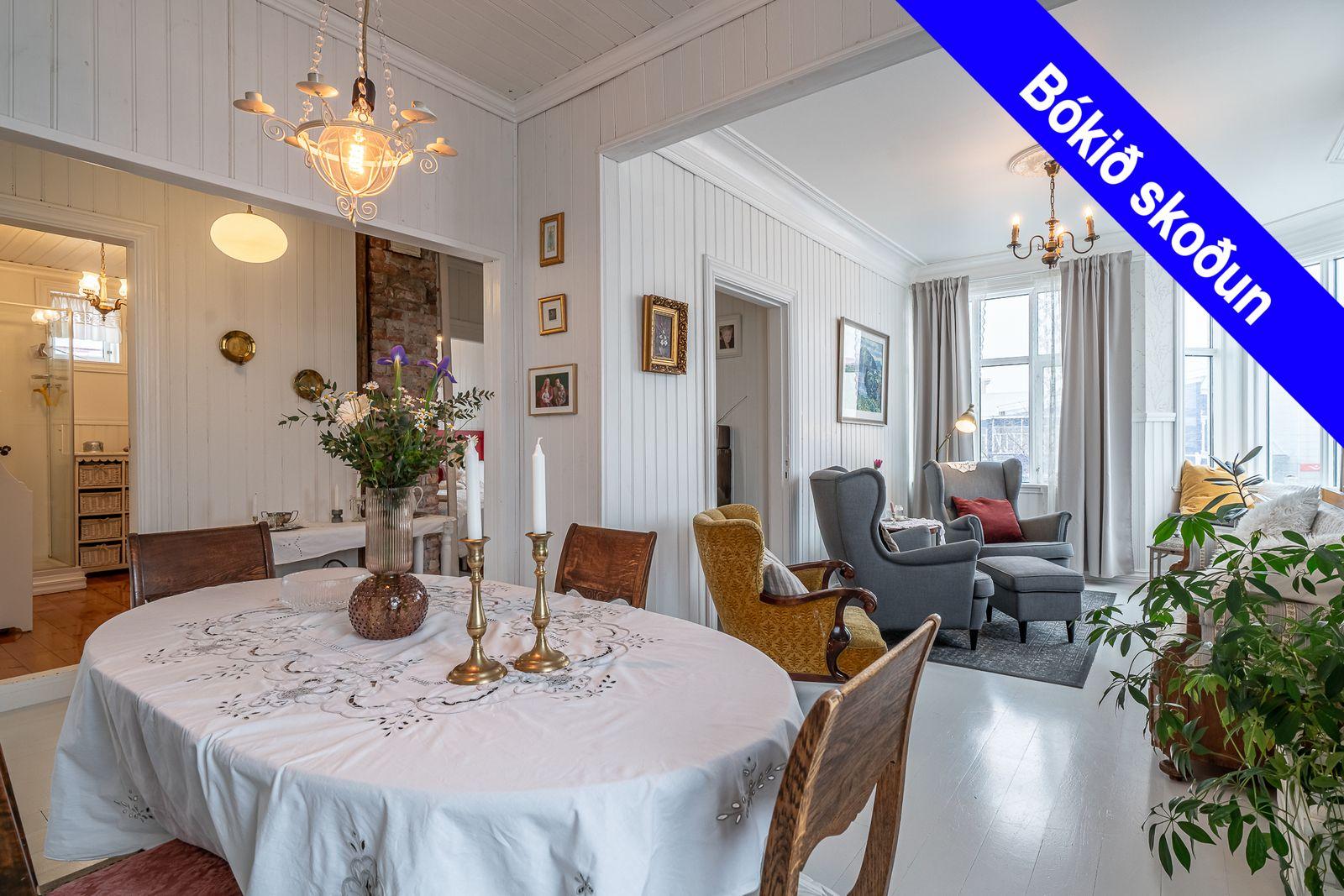 Fasteignasala Vestfjarða s. 4563244 - eignir@fsv.is - www.fsv.is- kynnir til sölu - Silfurgata 6 Ísafirði - Falleg og mikið uppgerð stór íbúð í miðbæ Ísafjarðar, íbúðin telur í heildina 212 m², fjögur svefnherbergi, tvær stofur, tvö baðherbergi þvottahús/geymsla , forstofa og stigagangur. Ágætur afgirtur garður með stimplaðri stétt og köldum geymsluskúr. Húsið stendur á 147 m² eignarlóð.