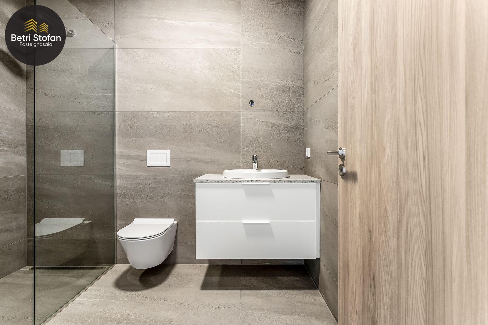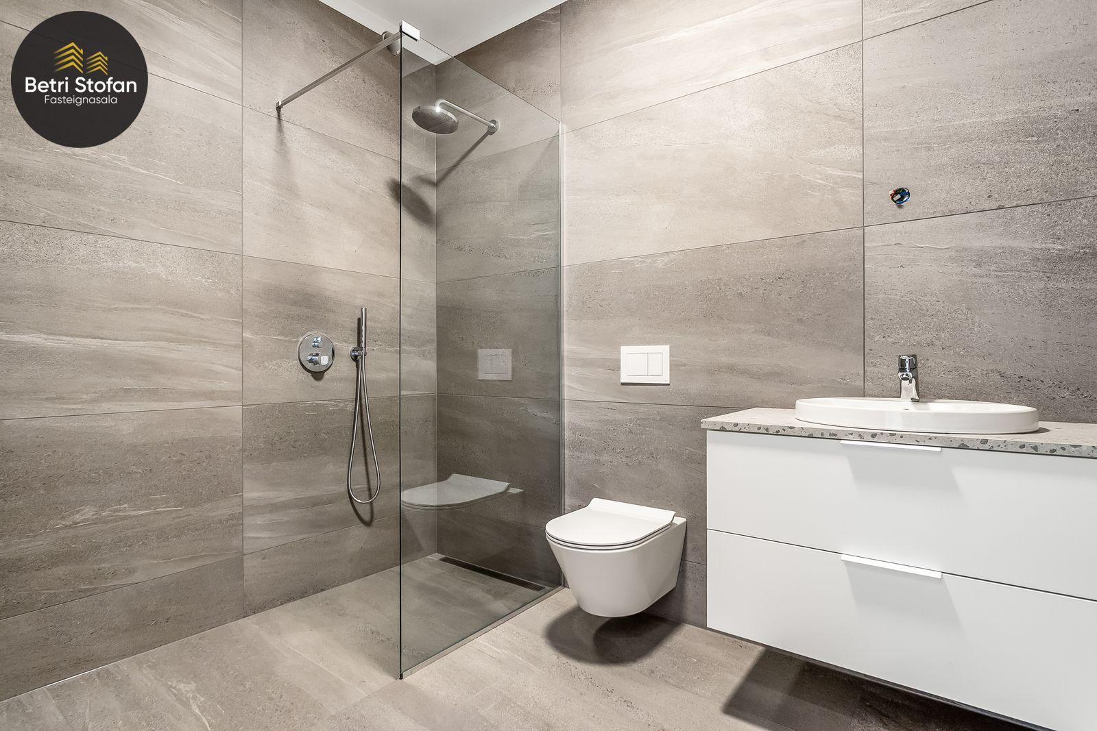 Baðherbergi með sturtu, innréttingu, handlaug, upphengdu salerni og handklæðaofn.